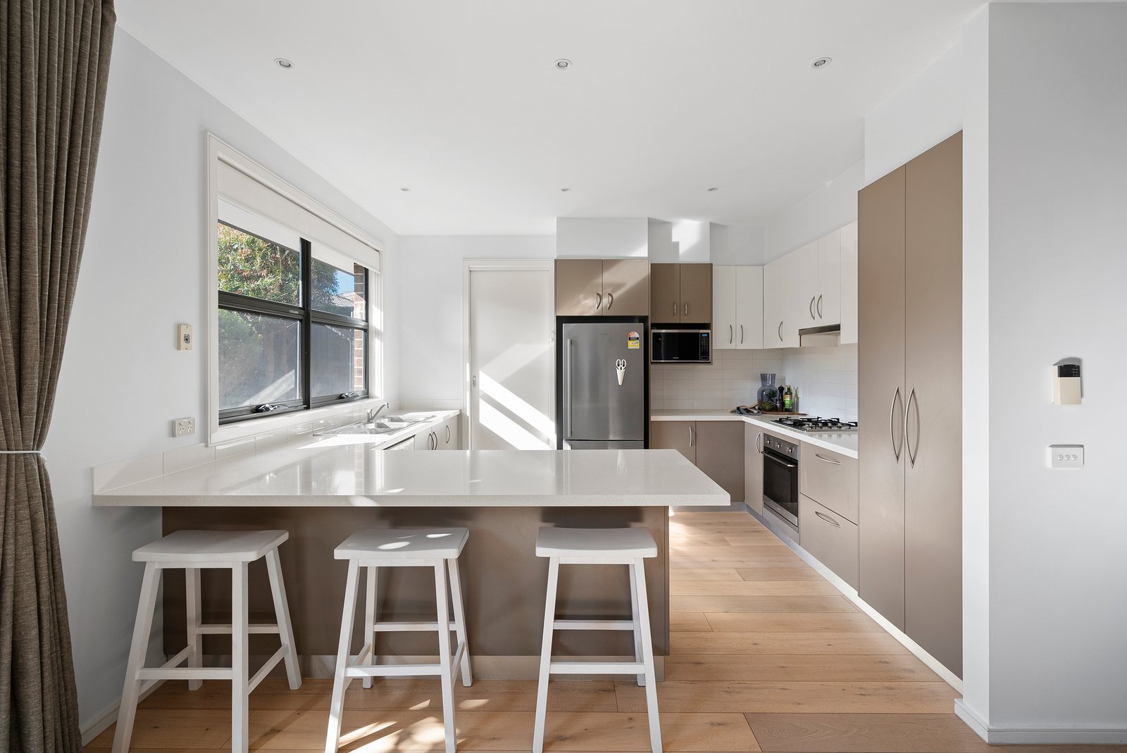 Bathed in natural light, the expansive open-plan living and dining domain is enhanced by statement lighting and a striking stone-topped kitchen with a breakfast bar, premium Smeg appliances, and ample storage.