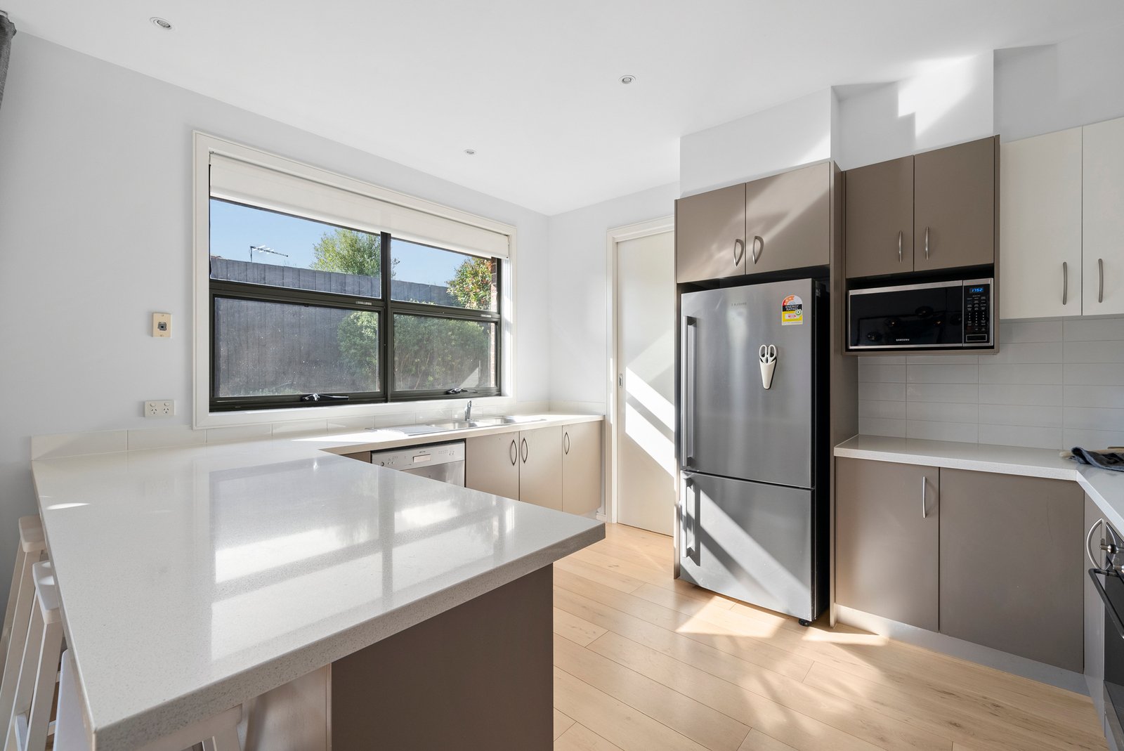 Bathed in natural light, the expansive open-plan living and dining domain is enhanced by statement lighting and a striking stone-topped kitchen with a breakfast bar, premium...