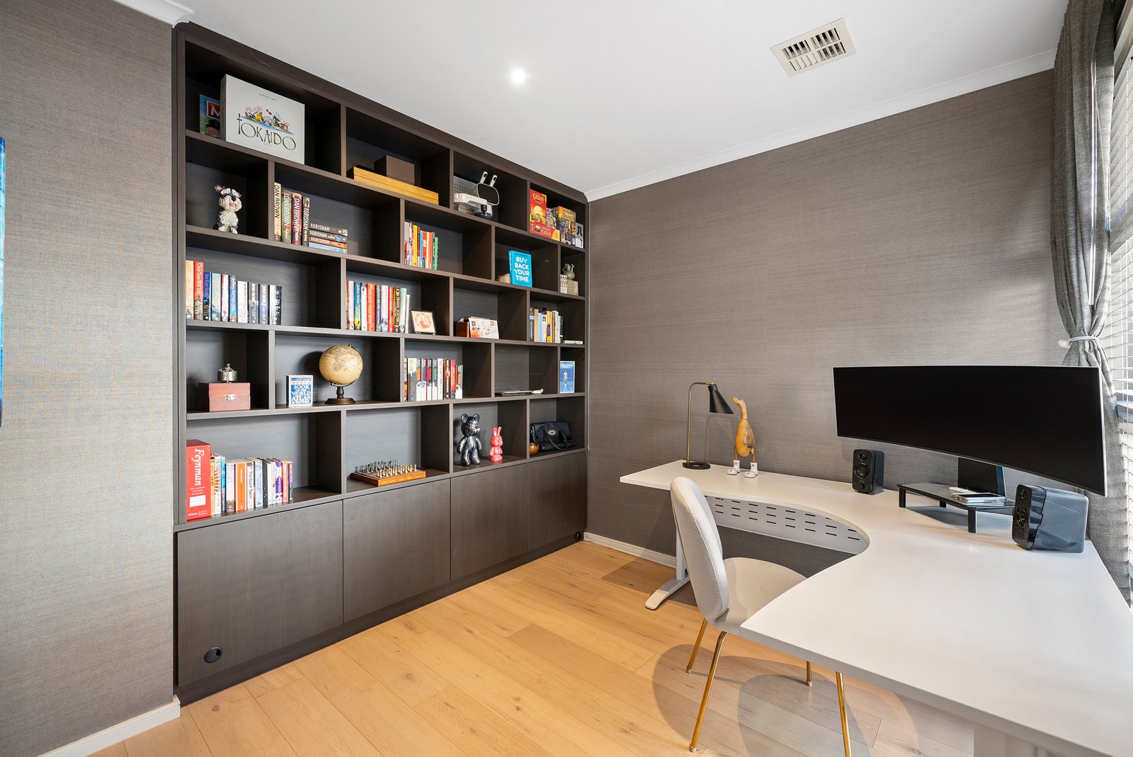 Thoughtfully zoned at the front of the home, a chic study with designer wallpaper and custom built-in shelving adds flexibility, complemented by a spacious laundry and guest powder room.