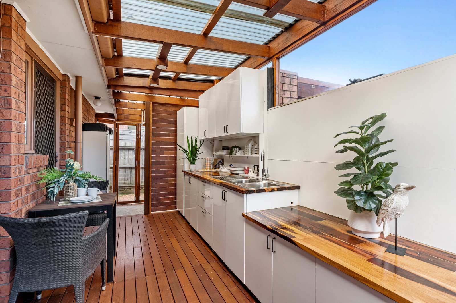 Inside, the generous living spaces, including both bedrooms, feature a charming bay window with lovely views over the manicured front garden. At the rear, the former deck has been cleverly converted into a fully enclosed al fresco entertaining area — complete with a covered roof, hardwood benchtop, basin sink, and laundry-adjacent drying racks. Clear entryway provides seamless indoor-outdoor flow and year-round use as a second living or dining area.