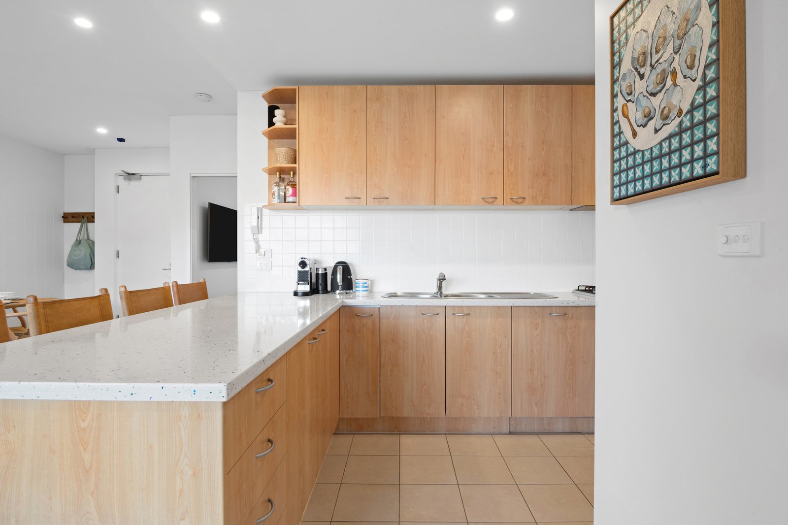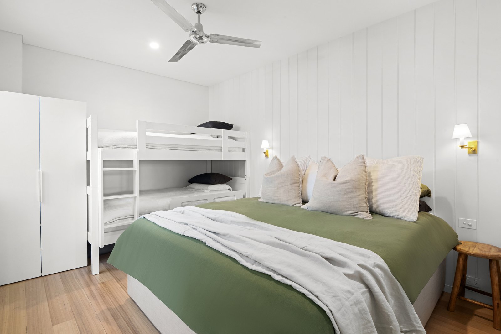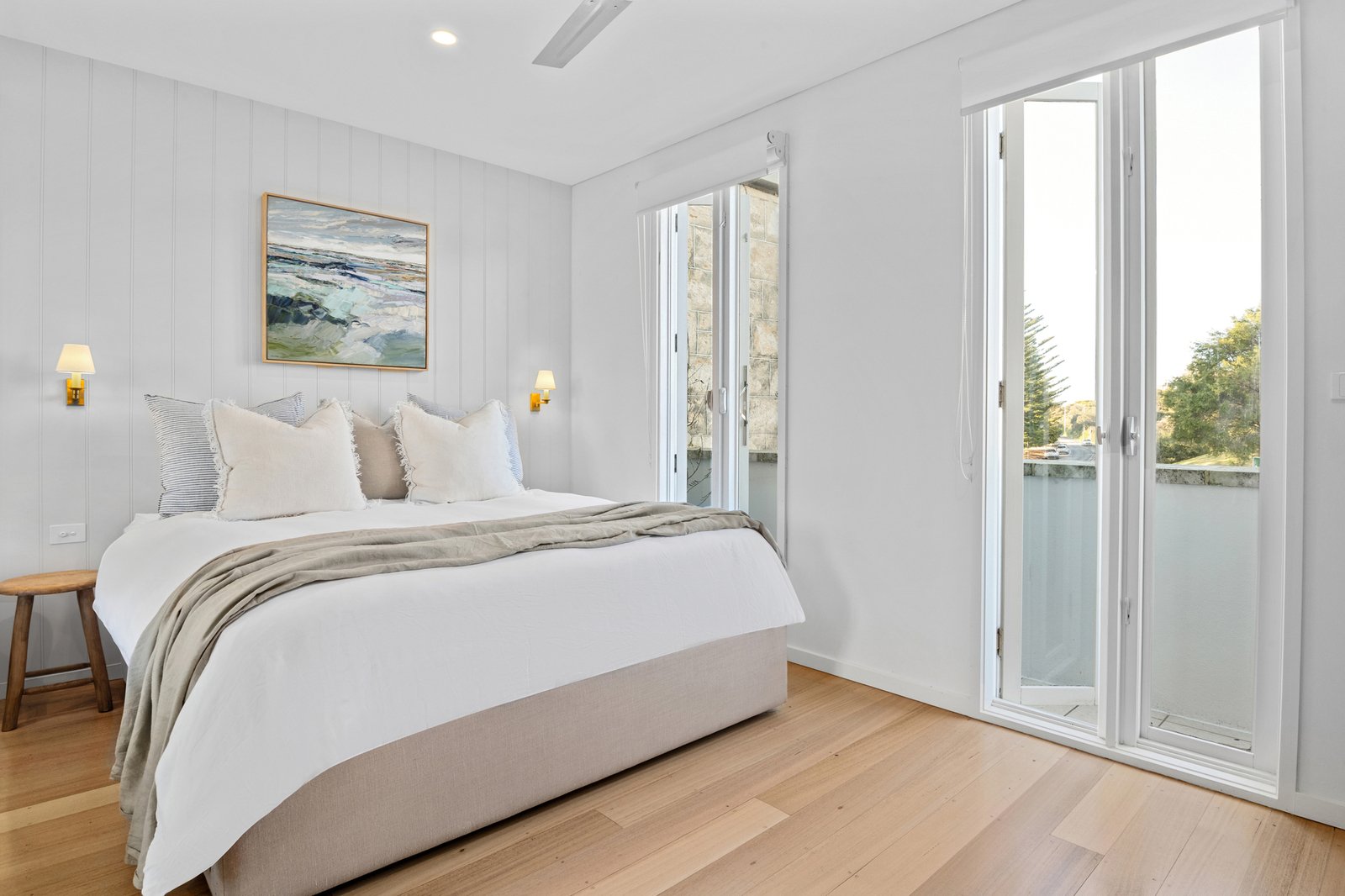 A relaxed coastal aesthetic flows throughout, led by VJ panelling, satin-finished Tasmanian Oak floors, and wide sliding glass that opens to a water view beyond the landmark Pines. Through the open-plan living and dining domain, a hint of sea meets the skyline, with natural light flooding the interior from its northerly orientation. The kitchen is fitted with Smeg appliances and positioned to engage with guests across the indoor-outdoor zones, ideal for a laid-back brunch or watching the street life unfold below.