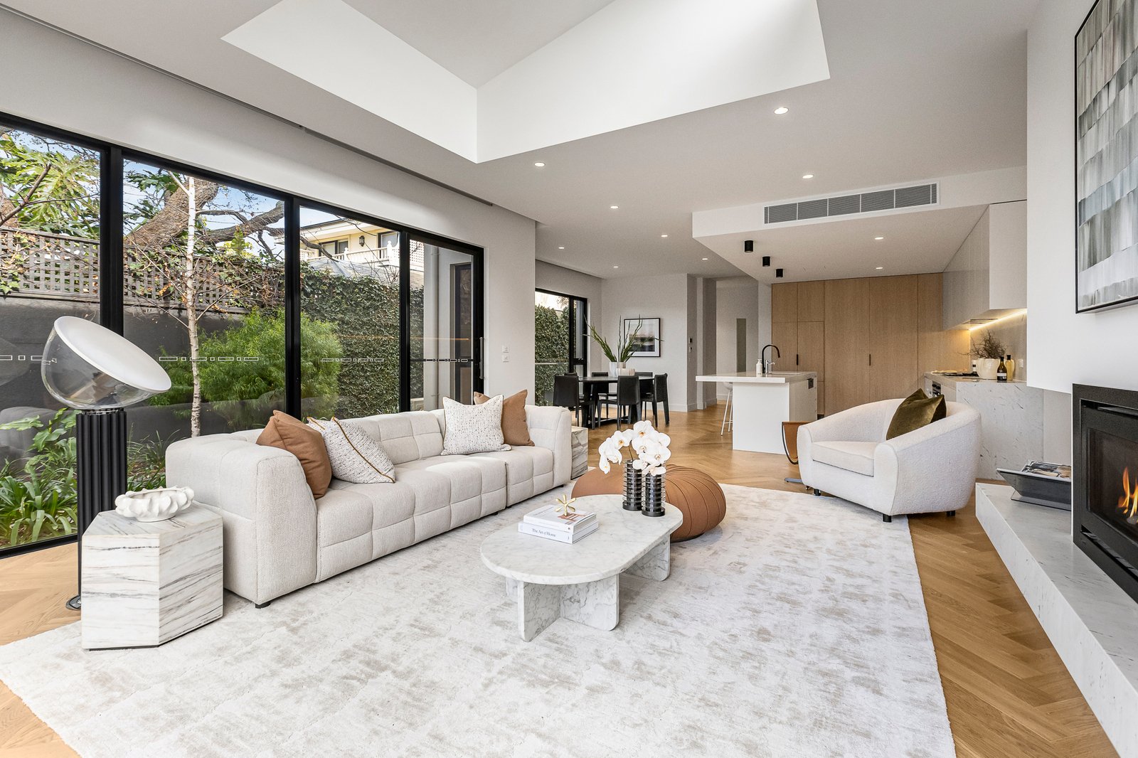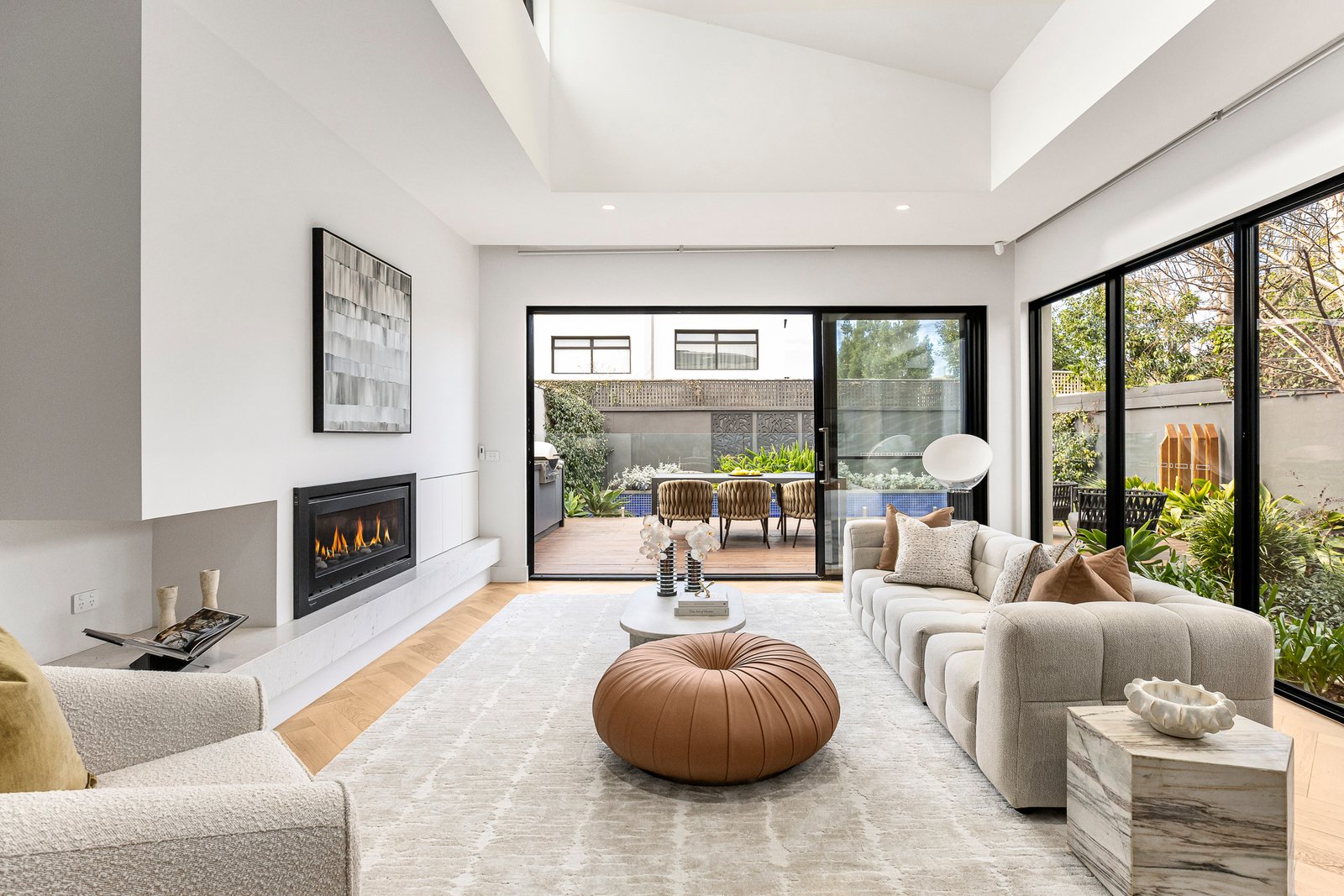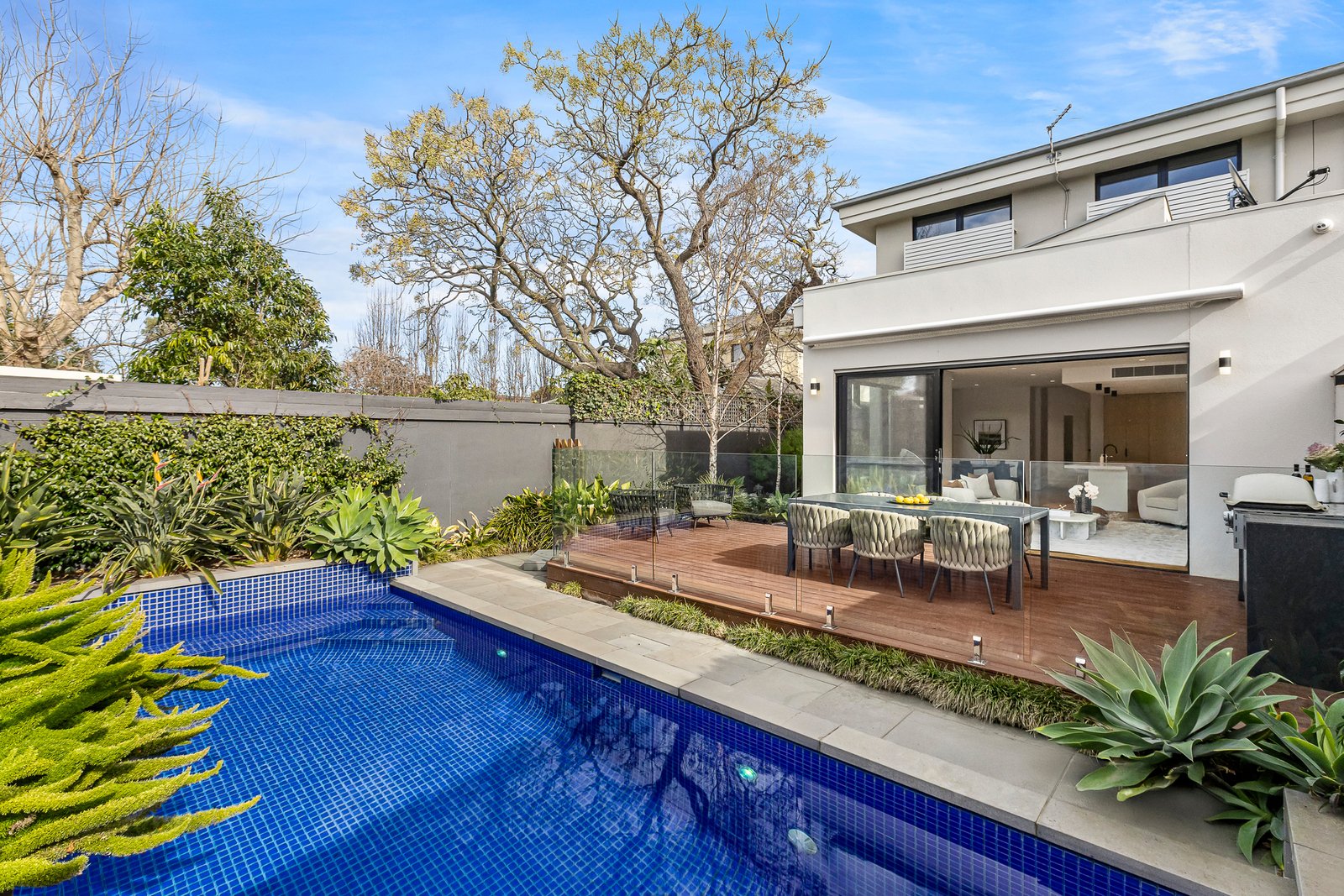 Family living (gas fireplace) seamlessly flows out to an al fresco entertaining area and jewel-like swimming pool (electric heat pump). Embraced by easy-care landscaping and northern sun, this private space, featuring a Weber BBQ kitchen and retractable shade awning, is perfect for long lunches and afternoons spent by the pool. Children of any age will also love the inclusion of a basement home cinema, and an upper level retreat providing their own zone to study or chill with friends.
