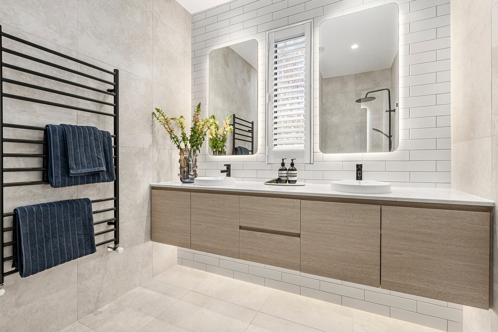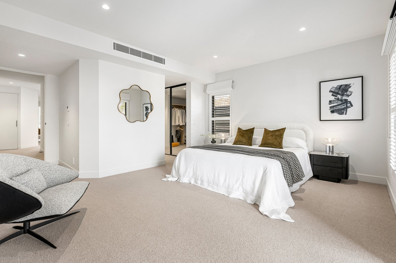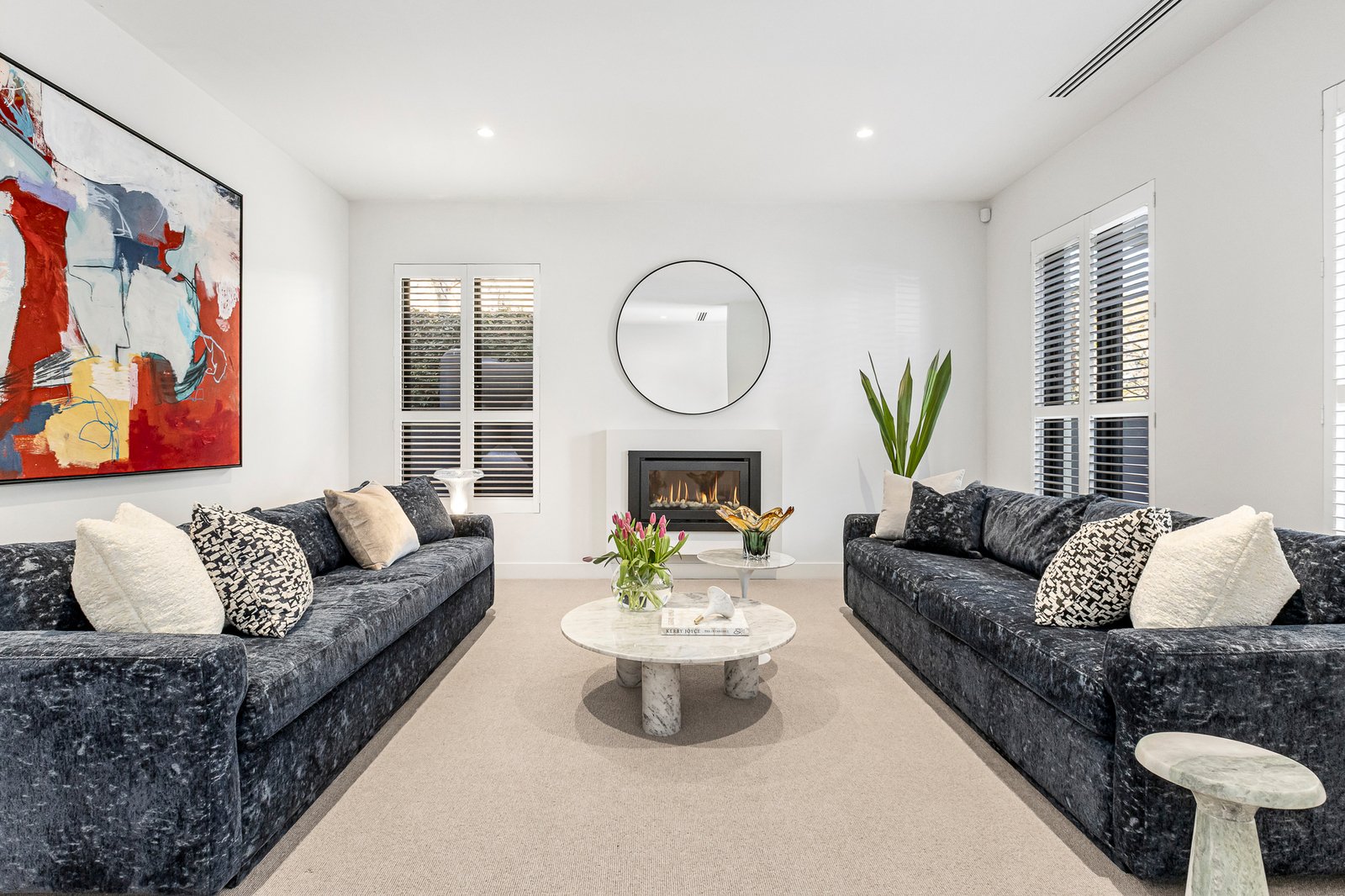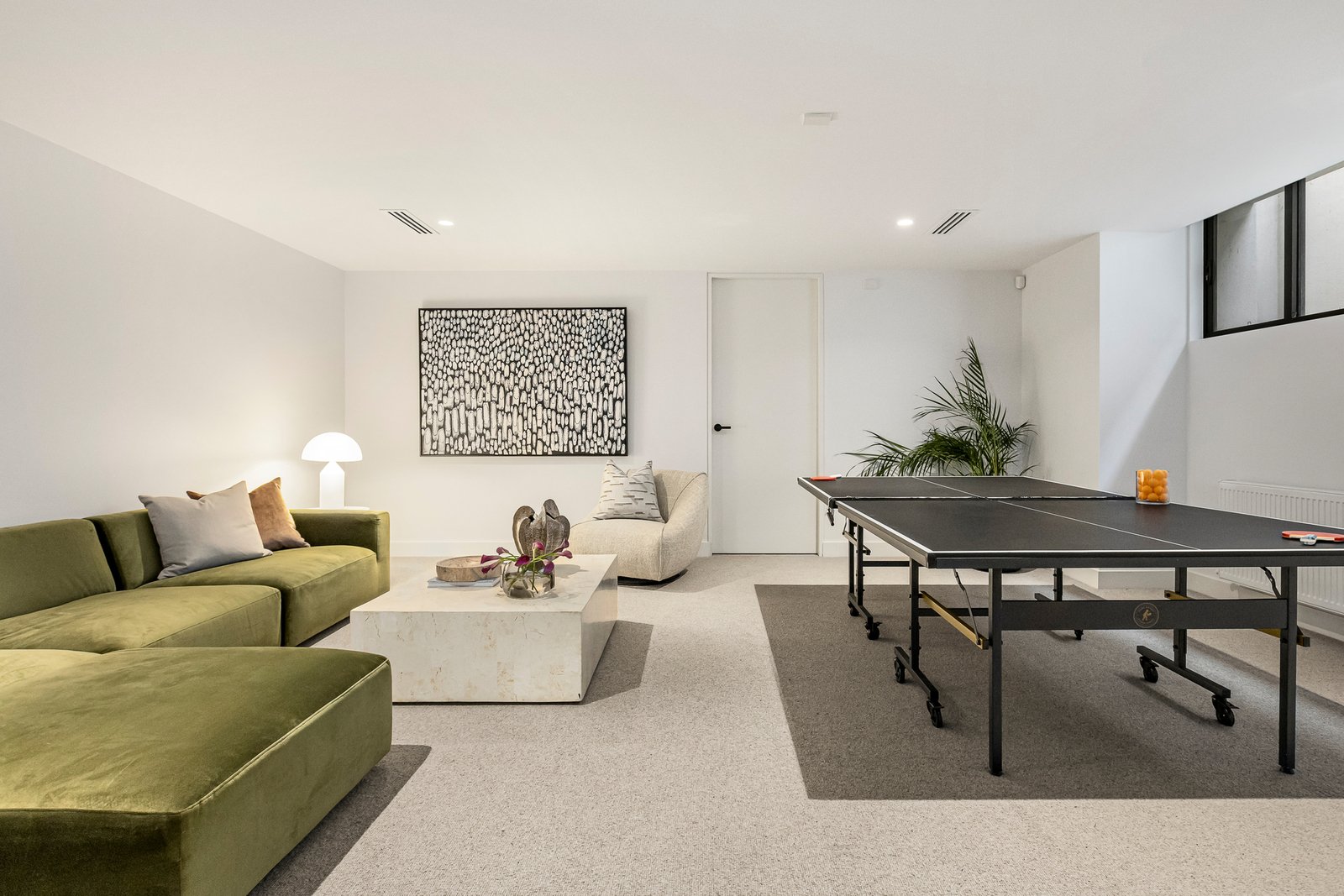 The basement features a theatre-room with external windows for natural light and airflow, as well as hydronic heating and a storeroom/gym. There’s also a stone vanity powder room, and garaging for three cars with a turn-table. Discerning details such as automatic blinds, automated skylights, hydronic underfloor heating, ducted reverse cycle air conditioning, and advanced security features, finalise this refined one-owner property built by Loewe Projects.