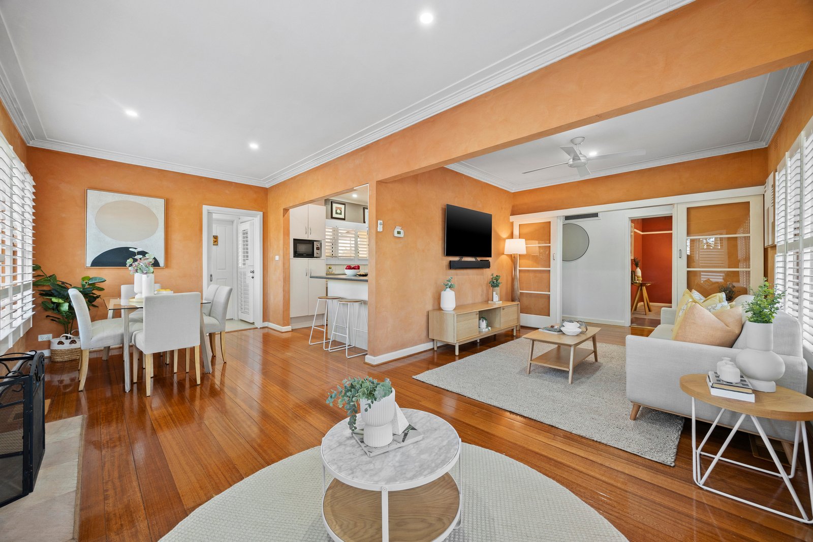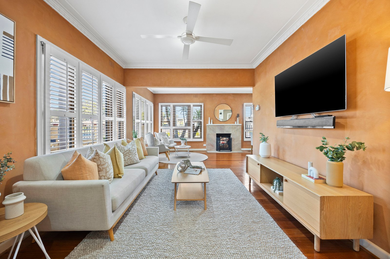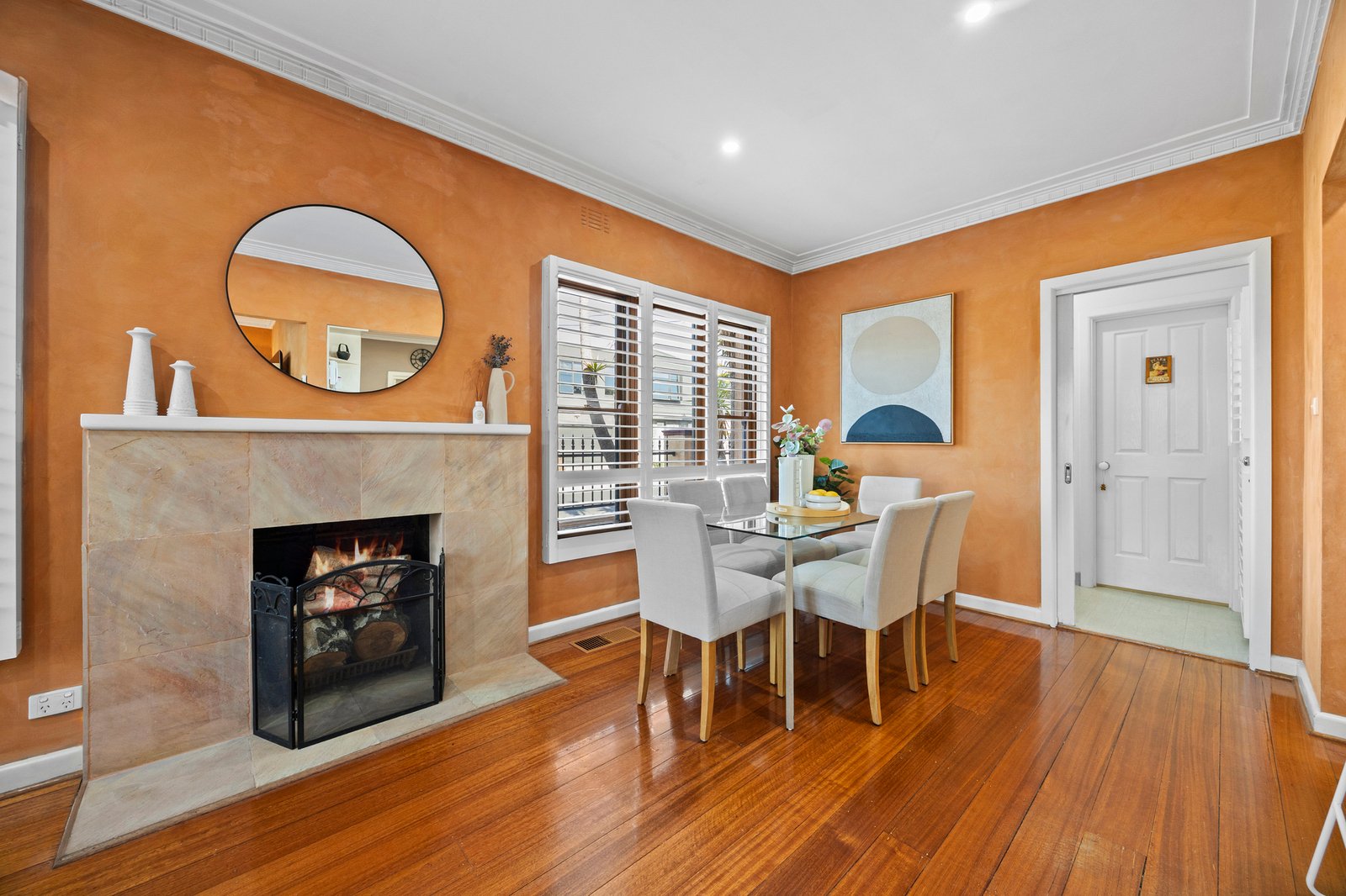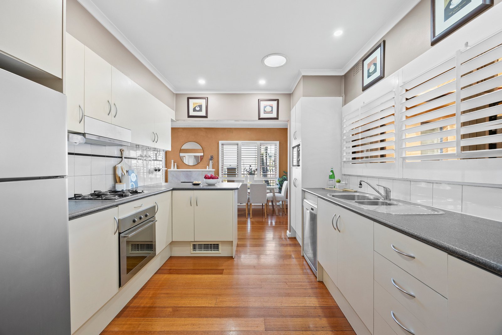 Gleaming timber floors reflect beautiful natural light throughout the open plan living and dining area, highlighted by plantation shutters and feature wood fireplace. The space wraps effortlessly around to reveal a modern galley-style kitchen comprising quality stainless-steel appliances, tiled splashbacks and expansive storage and bench space, offering everything needed for culinary success.