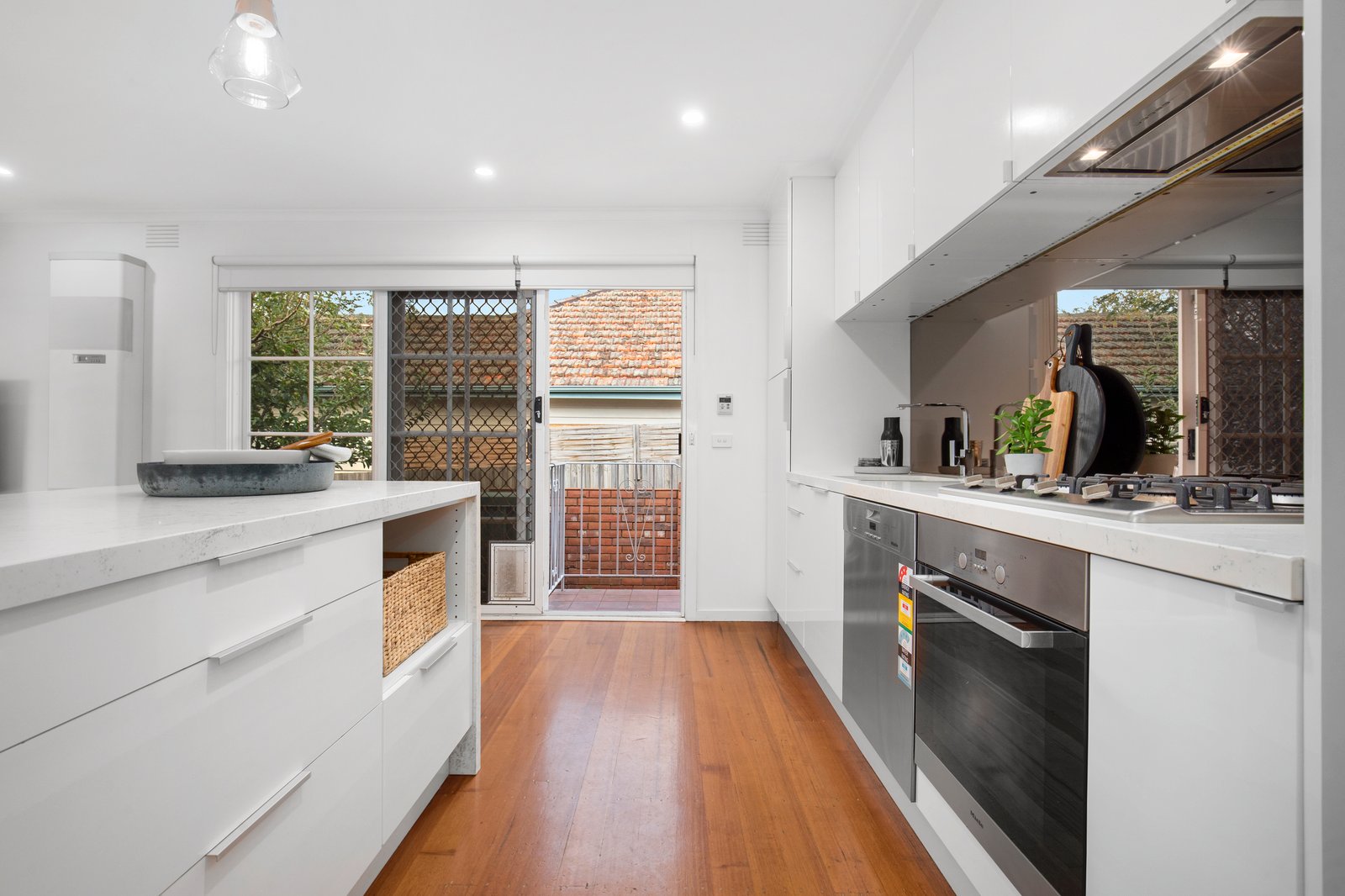This well-appointed rental offers 2 bedrooms with built-in wardrobes, a bright open-plan living and dining area, and a modern Miele kitchen featuring stone-look benchtops, mirrored splashback, and a combined butler’s pantry/laundry. The fully tiled bathroom includes dual vanities, and Tasmanian Oak floors run throughout.