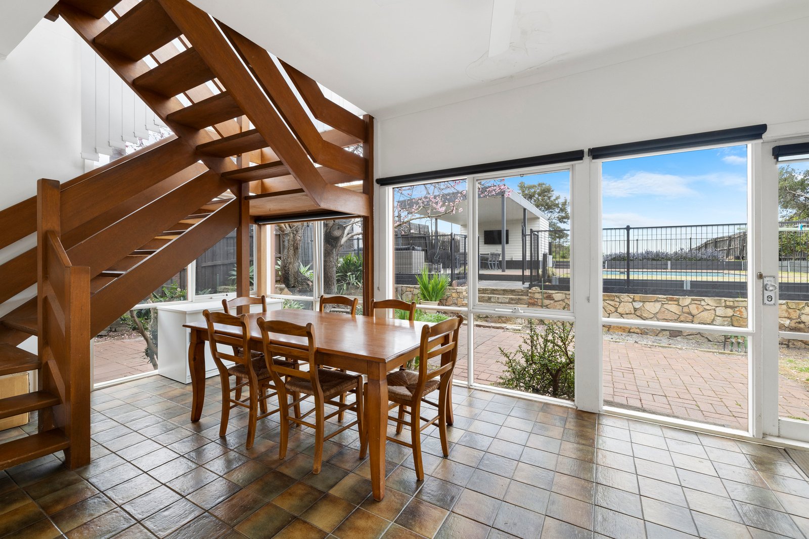 a sheltered alfresco terrace is the perfect spot to relax as the kids play in the pool or on the expansive back lawn.