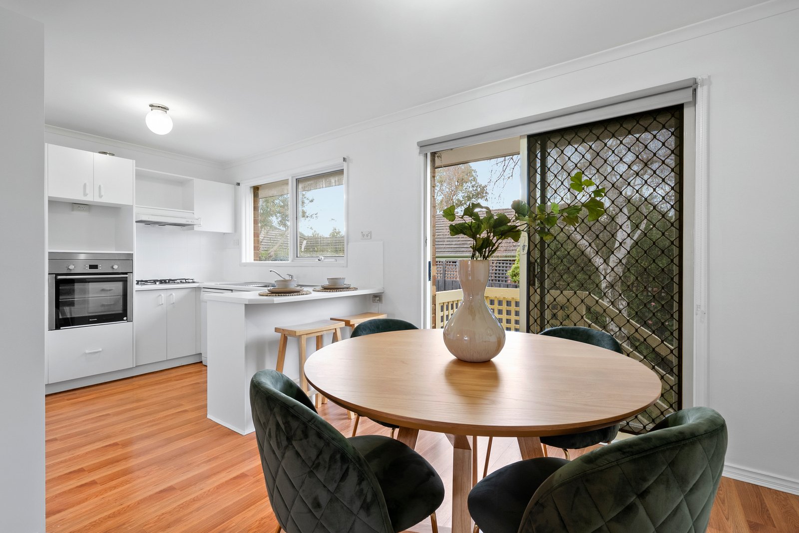 Beyond, the dining area connects seamlessly with the pristine, light-filled kitchen, appointed with stainless steel appliances and anchored by a charming breakfast nook, perfectly placed for slow mornings and garden outlooks. Glass sliders extend from the dining space to low maintenance north-facing gardens – private and peaceful.