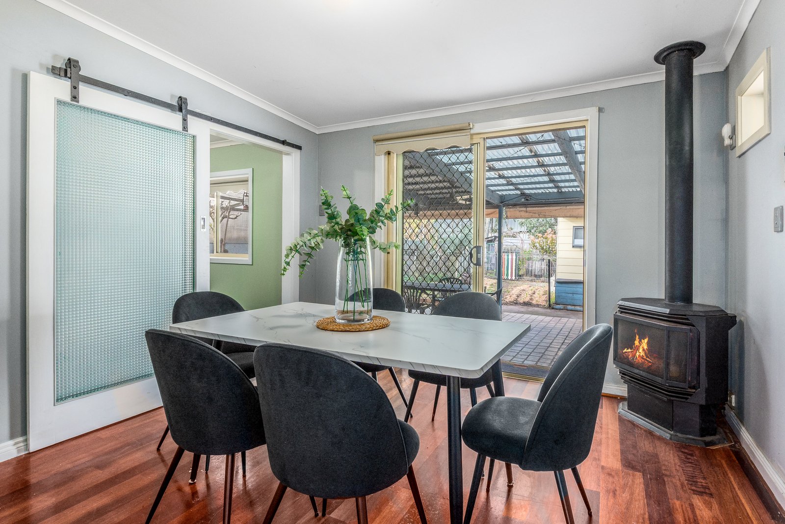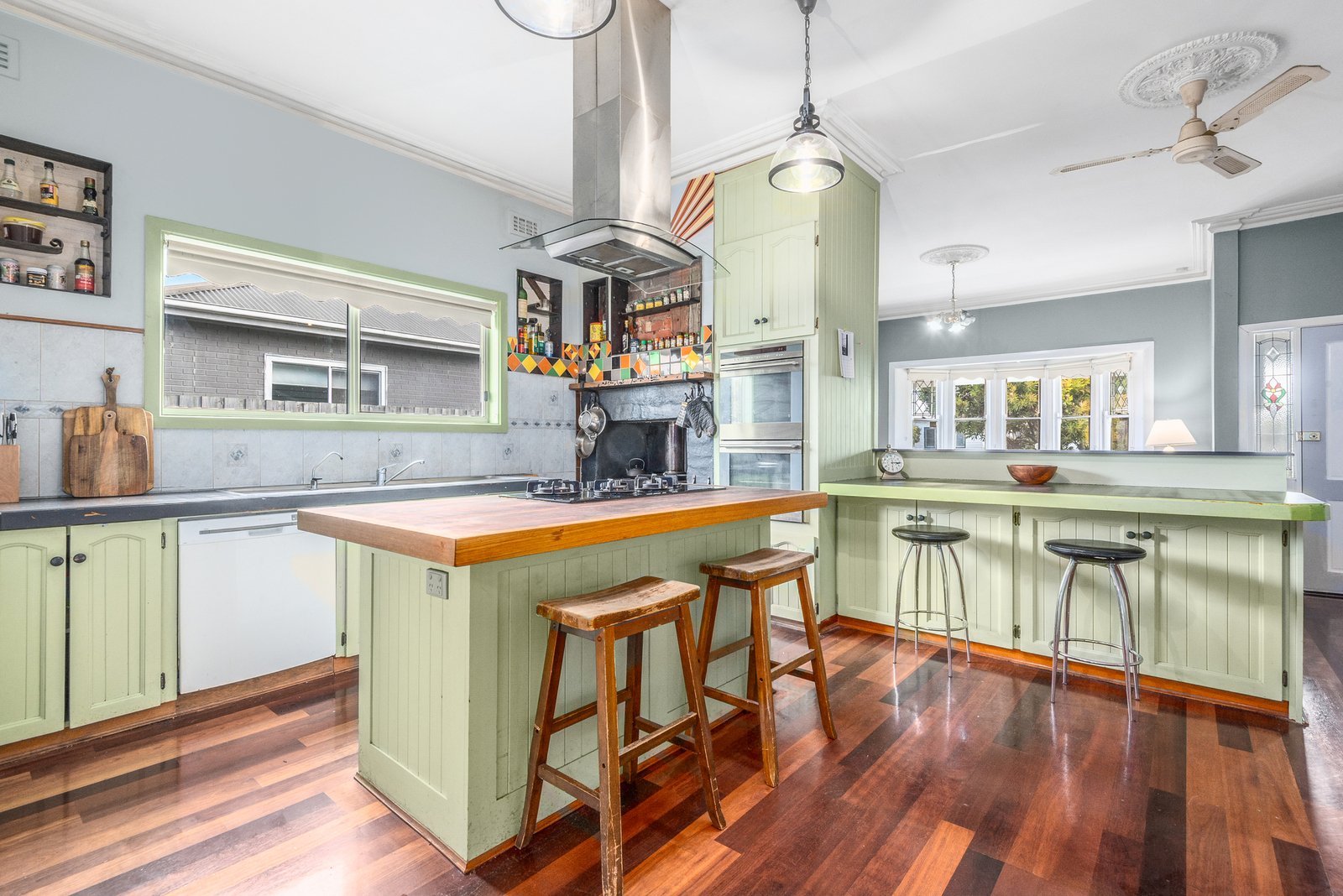 A long verandah and character façade present an enchanting appeal. From the entry, the inviting living room showcases original features including ornate cornice, ceiling rose with pendant lighting, beautiful bay windows, a stunning brick fireplace and timber mantel with gas log fire. Polished timber floors lead through to the kitchen at the heart of the home, with a woodfire heater in the original oven hearth, along with modern appliances including dual 600mm Electrolux ovens, 900mm gas cooktop, dishwasher, central island with timber benchtop, ample bench space, breakfast bar seating and elegant pendant lighting. A second living or dining room at the rear, also includes a gas log fire, continuing the cosy ambience throughout.
