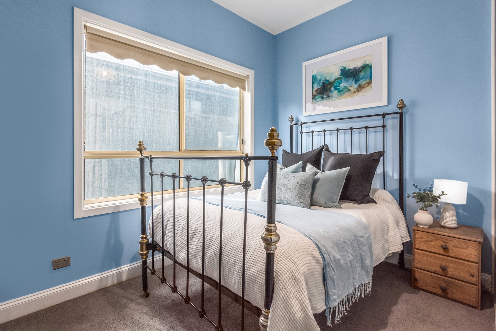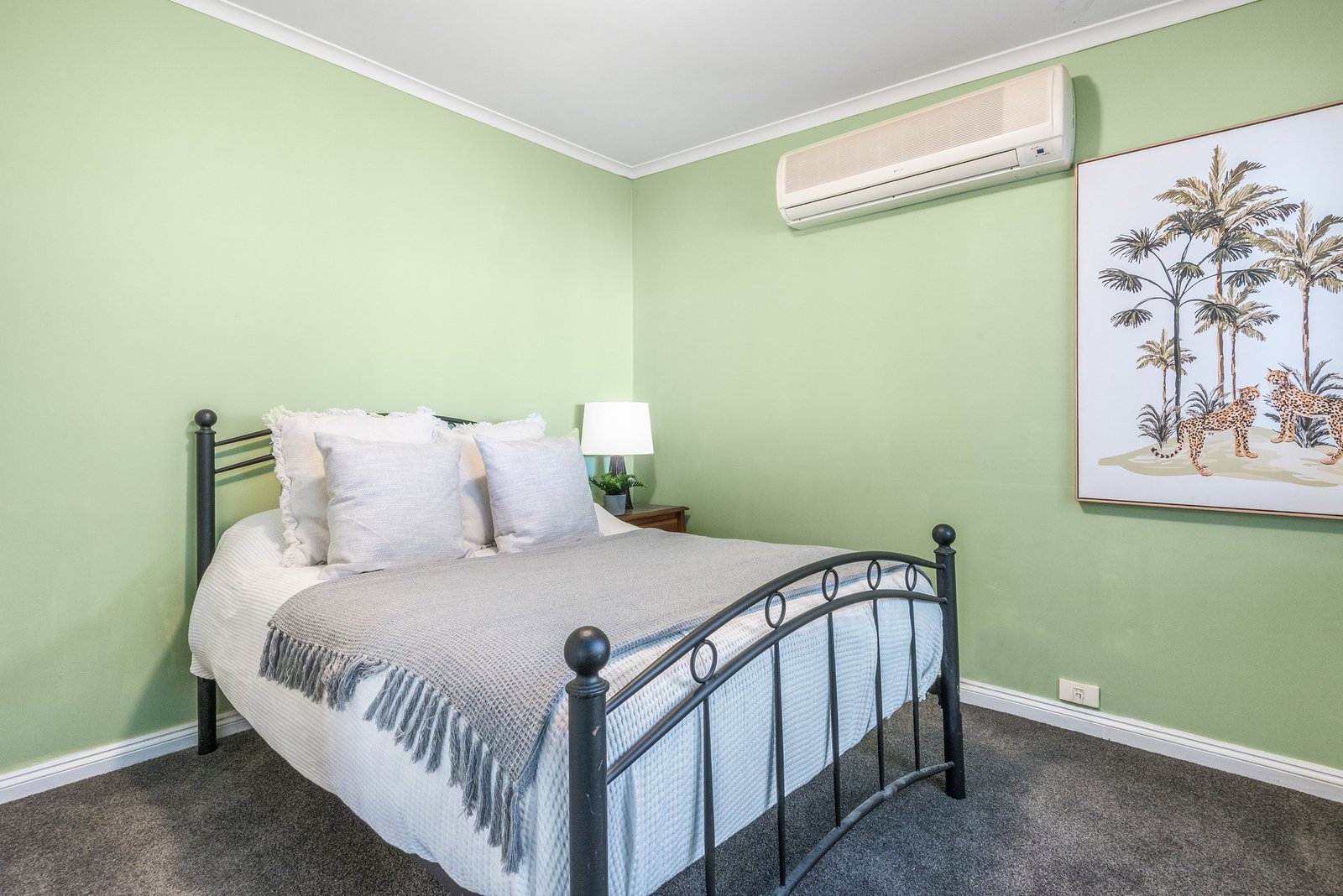 Three bedrooms all include built-in robes, serviced by a classic bathroom, presented in traditional finishes with shower over bath, subway tiles, timber vanity with marble benchtop, sconce lighting and beautiful bronze tapware. A separate laundry with wc, and two split system heating cooling units, complete the well-functioning layout.