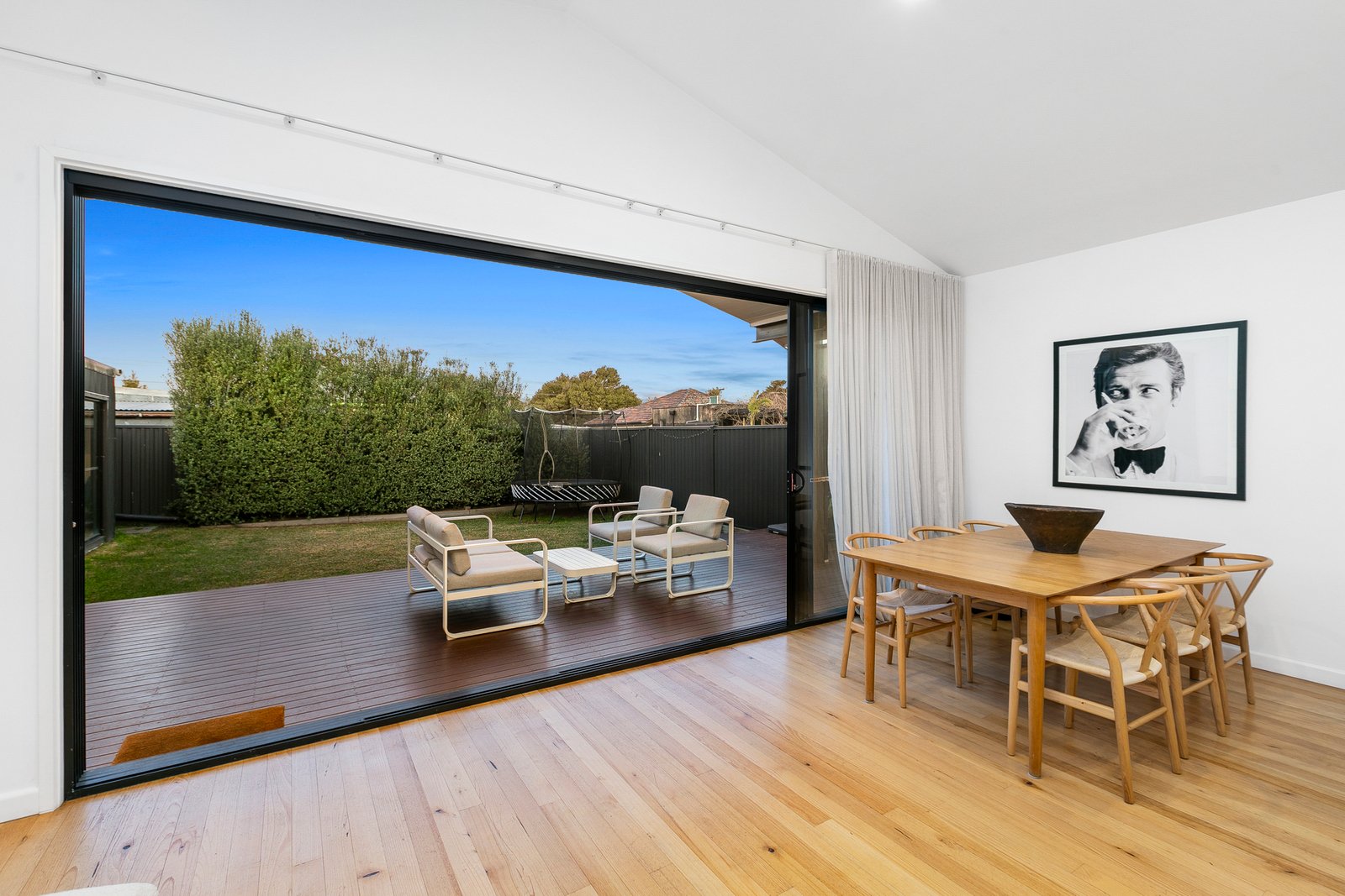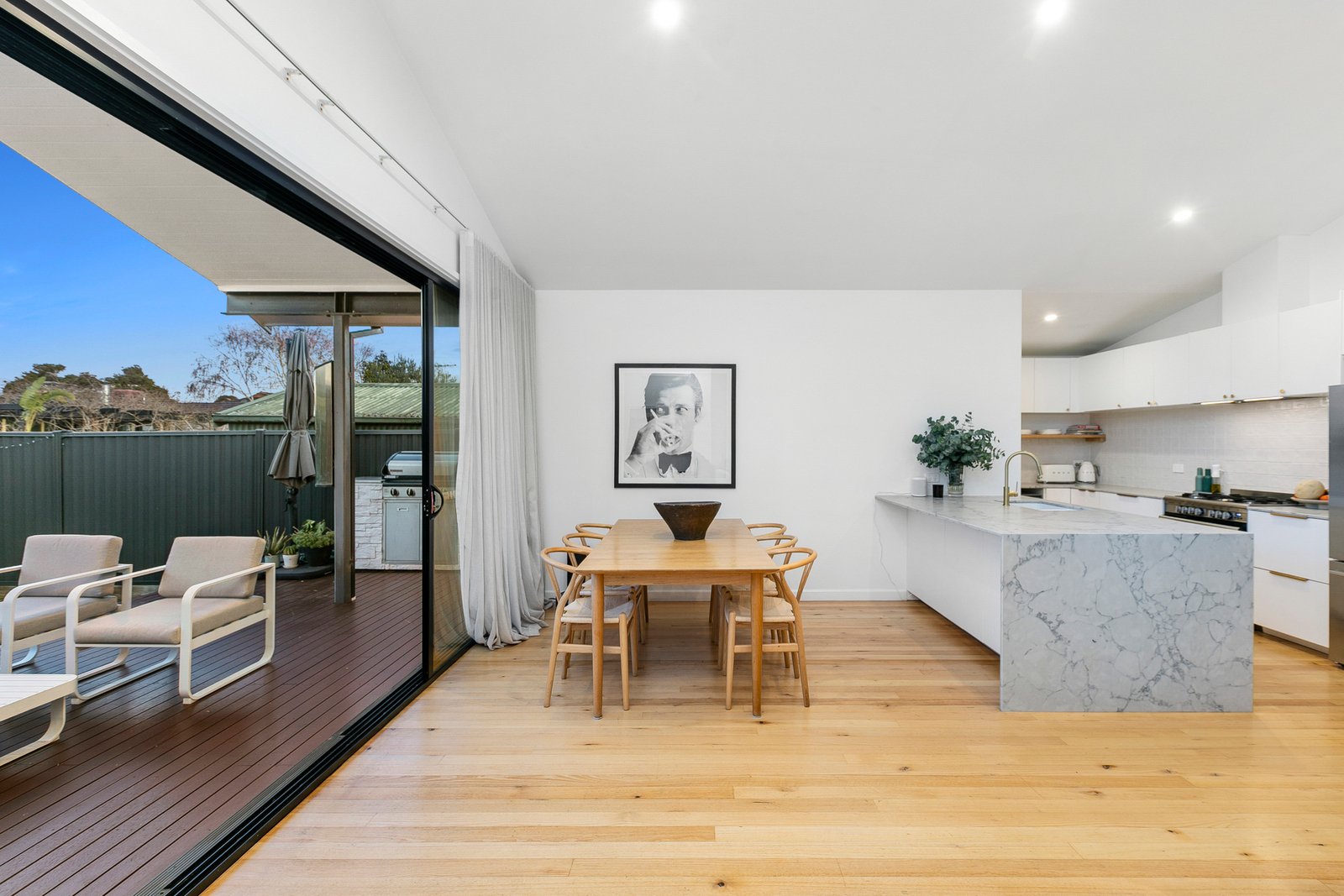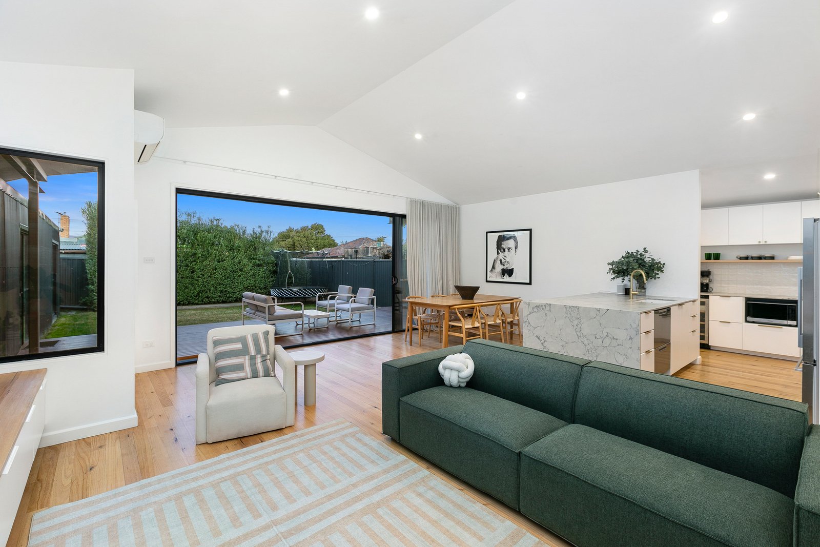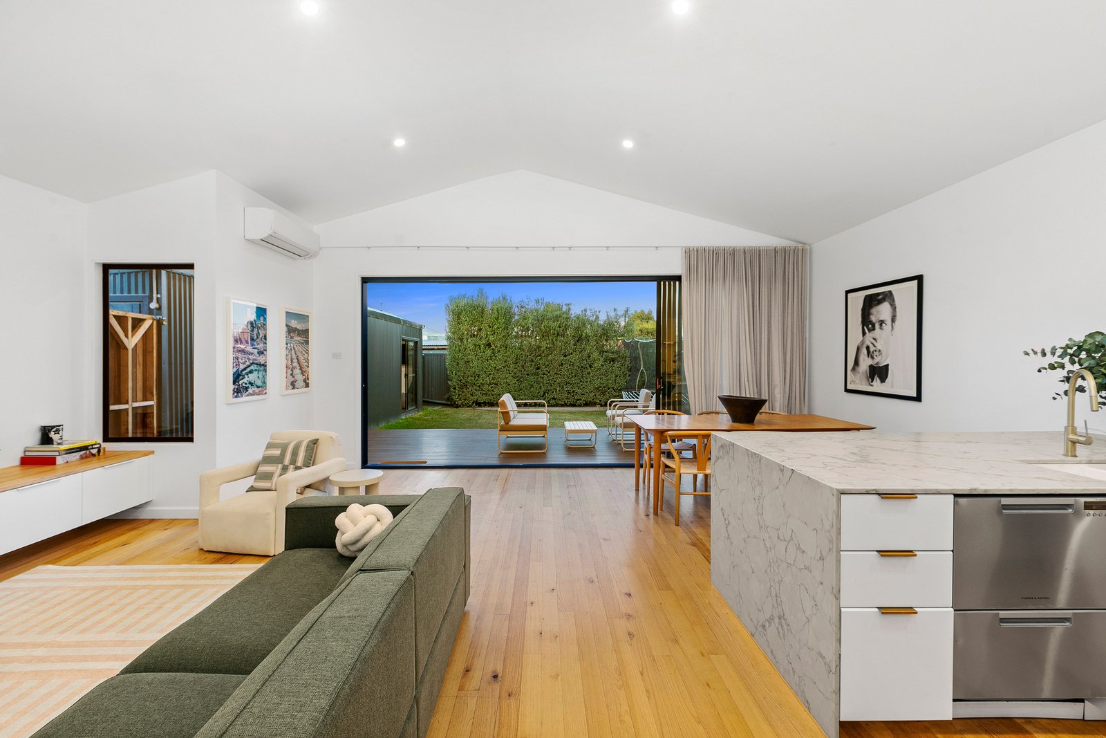 Step inside to discover beautiful Tasmanian Oak hardwood flooring that flows throughout the living spaces, creating warmth and continuity while celebrating the home's quality craftsmanship. The intelligently designed floor plan offers generous proportions throughout, with a spacious open-plan living and dining area that serves as the heart of the home. The superbly appointed kitchen showcases a stunning marble island bench and features freestanding oven, wine fridge and double drawer dishwasher, making entertaining an absolute pleasure while maintaining seamless connection to the outdoor entertaining spaces. Cathedral ceilings in the thoughtfully designed extension create a dramatic sense of space and light, seamlessly flowing into the outdoor entertaining area where the soaring roofline continues to blur the lines between indoor and outdoor living.