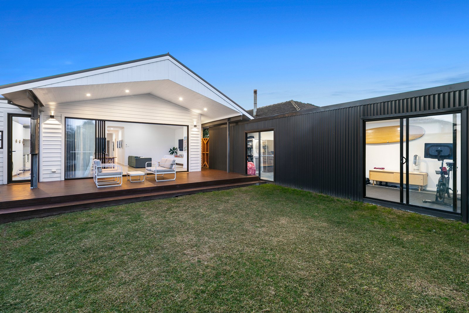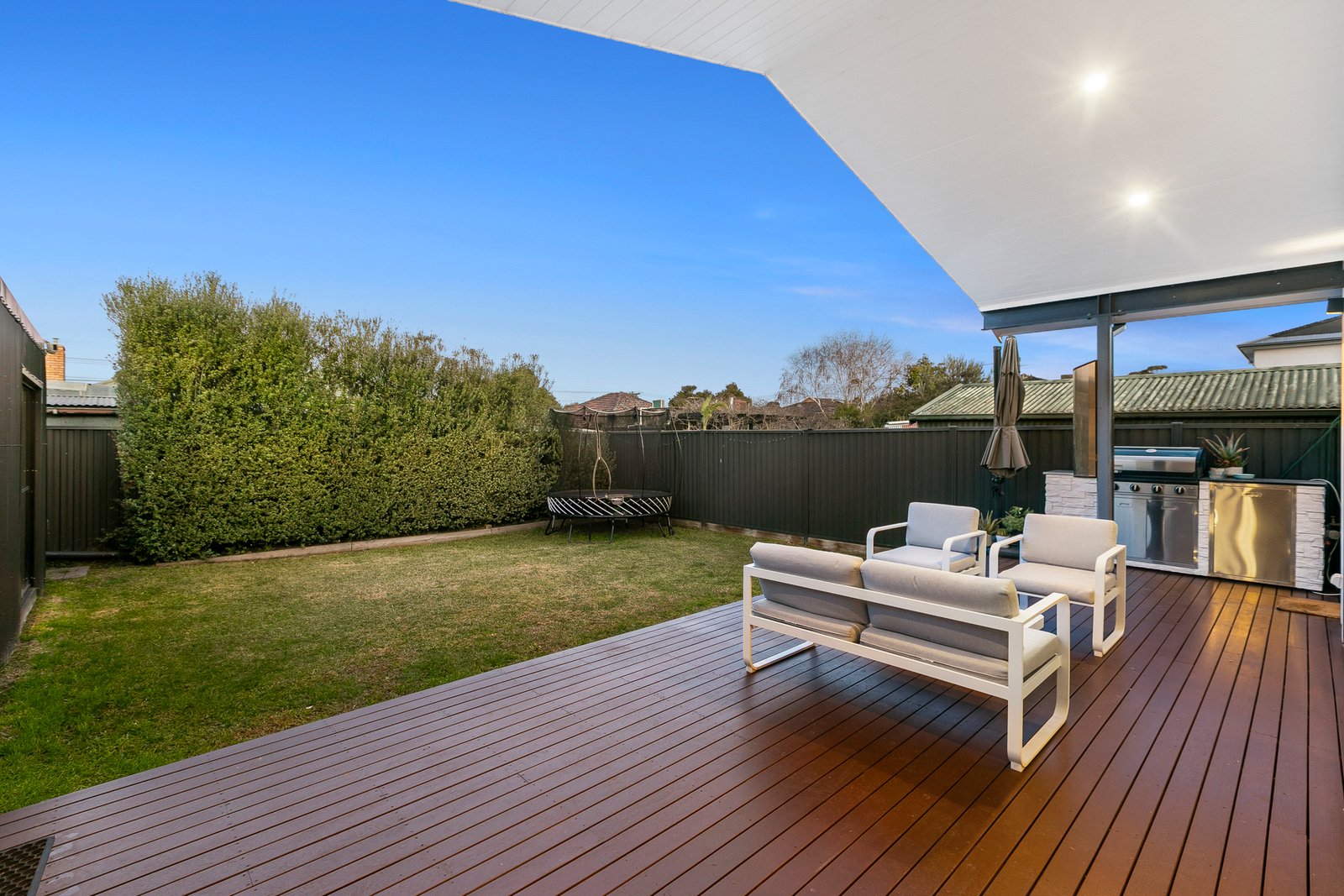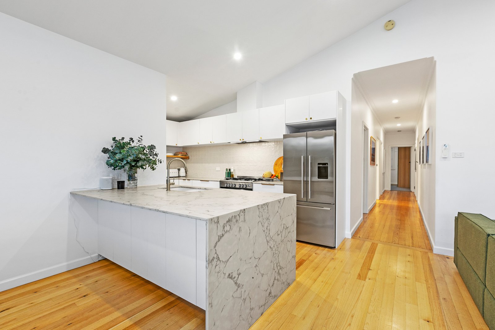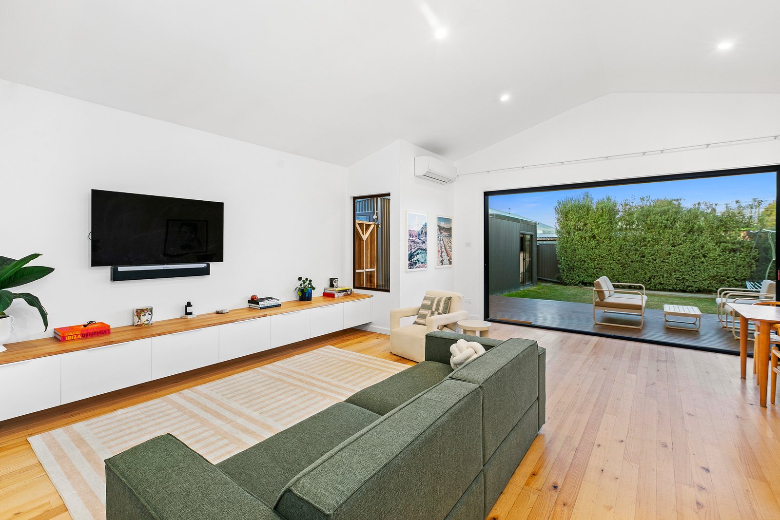 Step inside to discover beautiful Tasmanian Oak hardwood flooring that flows throughout the living spaces, creating warmth and continuity while celebrating the home's quality craftsmanship. The intelligently designed floor plan offers generous proportions throughout, with a spacious open-plan living and dining area that serves as the heart of the home. The superbly appointed kitchen showcases a stunning marble island bench and features freestanding oven, wine fridge and double drawer dishwasher, making entertaining an absolute pleasure while maintaining seamless connection to the outdoor entertaining spaces. Cathedral ceilings in the thoughtfully designed extension create a dramatic sense of space and light, seamlessly flowing into the outdoor entertaining area where the soaring roofline continues to blur the lines between indoor and outdoor living.