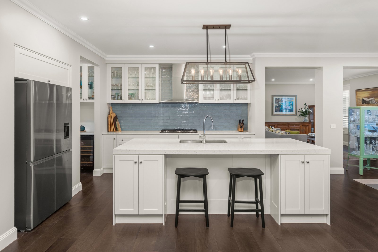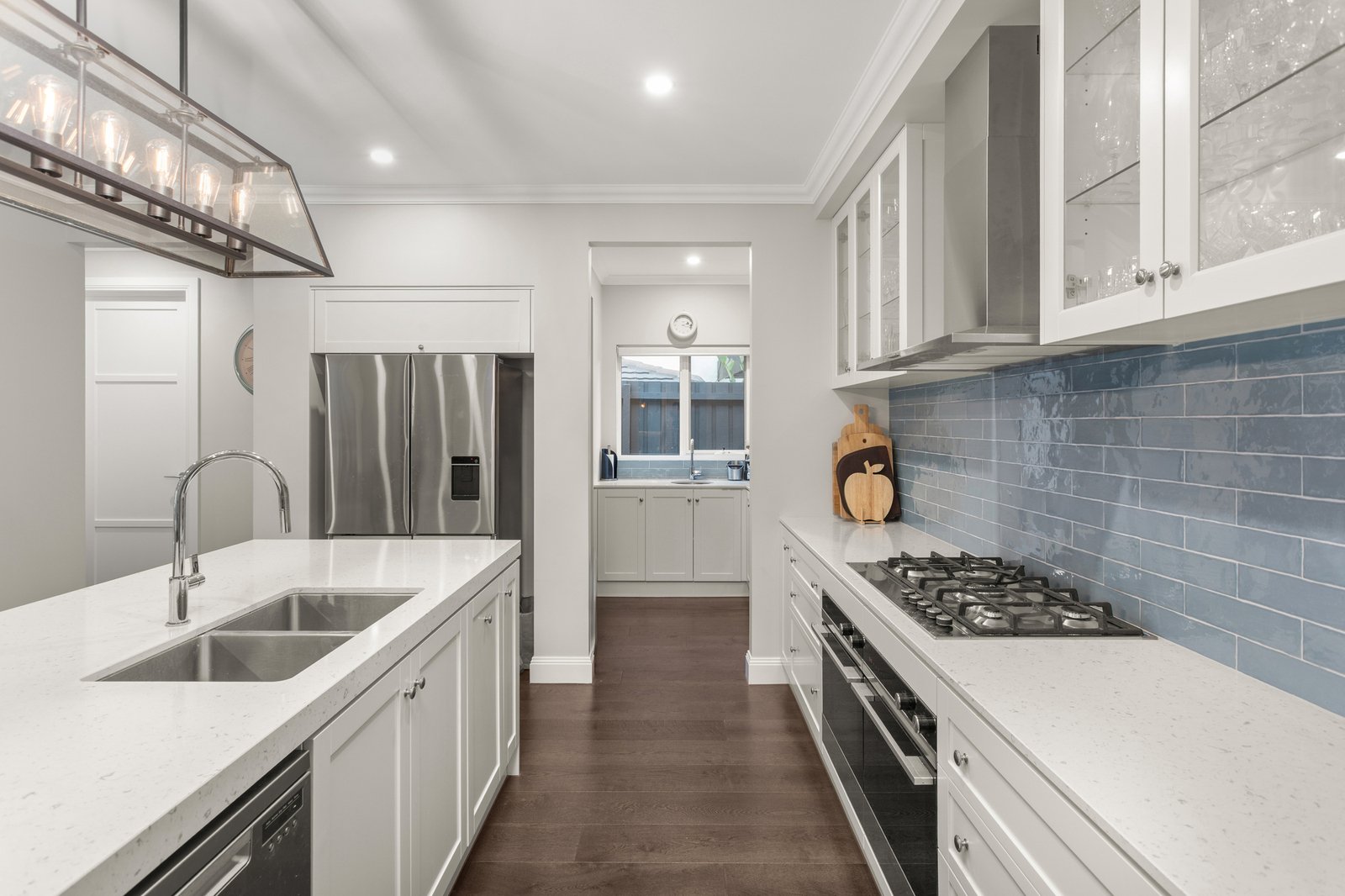 Welcomed by a manicured façade, the home boasts a formal lounge anchored by a fireplace, a huge family zone and paved patio (with outdoor heater) overlooking the landscaped gardens. Complimented by a bright office and a first-floor rumpus room, thoughtfully set up as a theatre room. The stone kitchen will serve your day-to-day and hosting needs with ease appointed with a vast stone island bench to spread out on as well as a walk in butler’s pantry, double ovens, 900mm gas cooking and dishwasher.