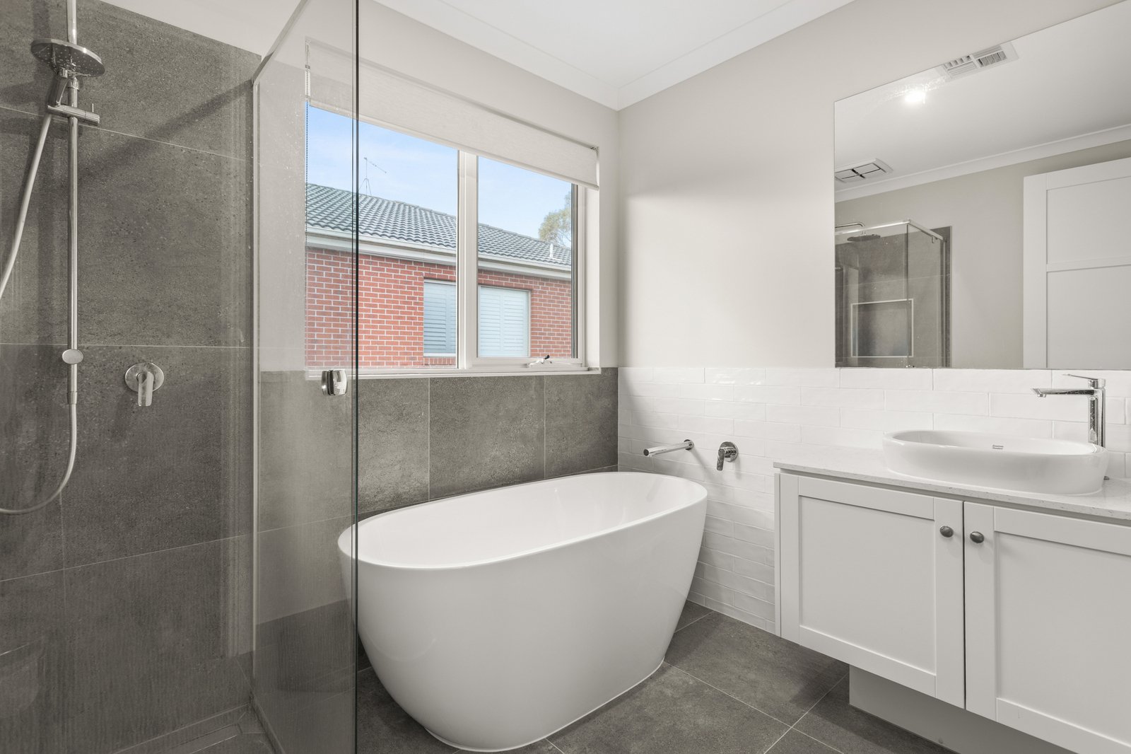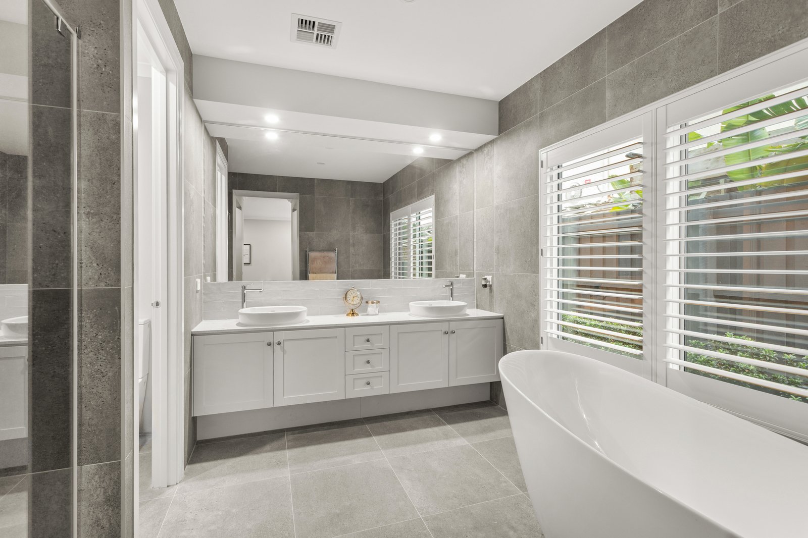 The ground floor master is pampered by a walk thru robe to a twin ensuite with a luxurious freestanding soaking tub. While the first-floor hosts 3 large bedrooms all with WIRs and one with its own ensuite. This substantial residence is also supported by the modern comforts of a guest powder room, double garage with internal access, ducted air conditioning and refrigerated cooling. Additional features include engineered French oak flooring, solar panels, ducted vacuum, and seamless bi-fold doors opening to the alfresco and backyard. The garden is enhanced by established fruit trees, adding charm and practicality to the outdoor setting