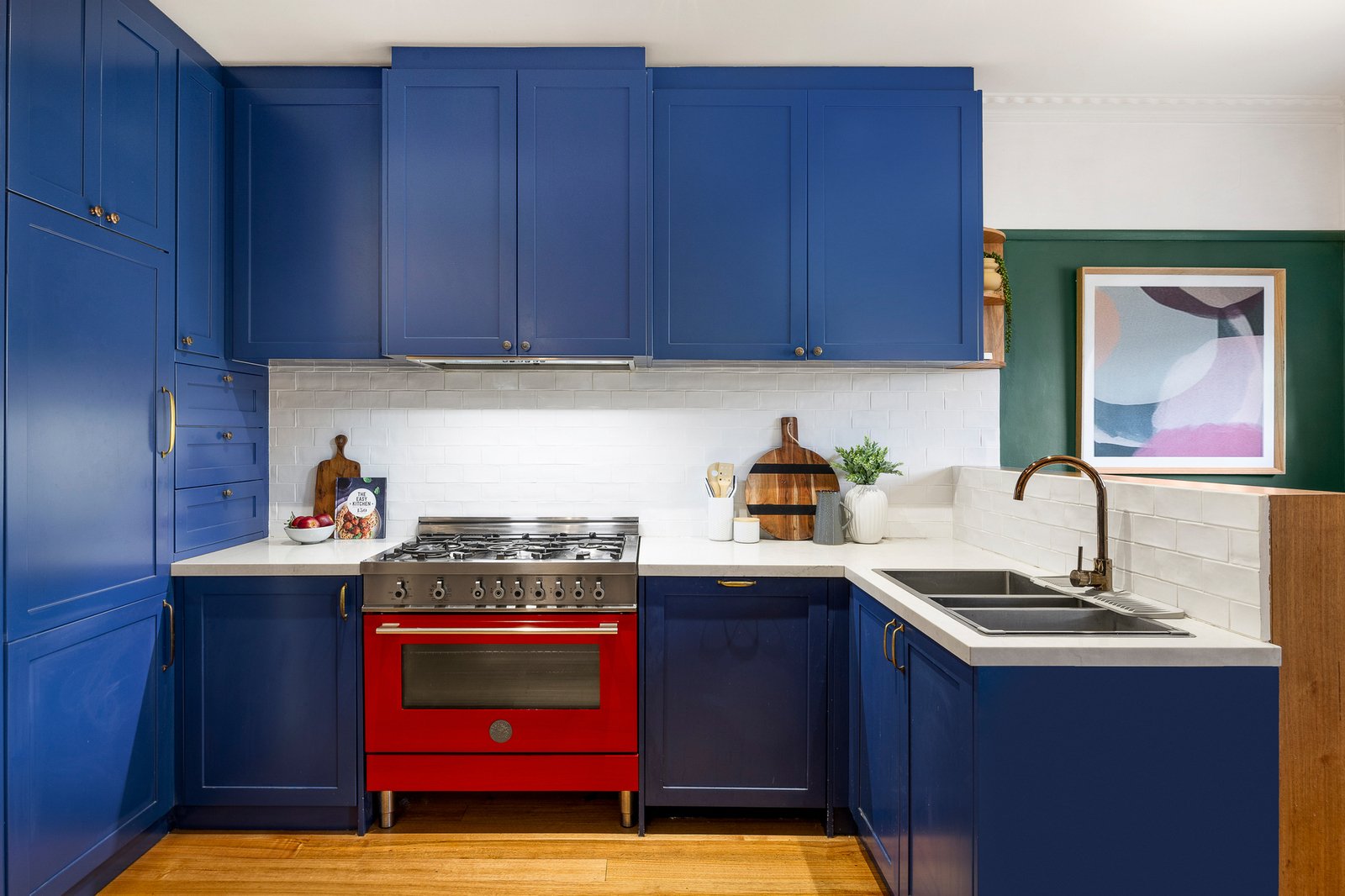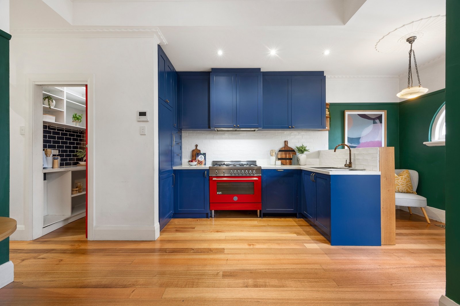 The kitchen is a showstopper, featuring dishwasher, striking blue cabinetry, brass hardware, crisp white subway tiles, double stainless steel sinks, and a stunning freestanding oven with gas cooking for a bold designer statement. An adjoining butler’s pantry for additional storage solutions adds further appeal. Both bedrooms are generously proportioned with a timeless Art Deco ambiance, the main with floor to ceiling cupboard space, and ensuite bathroom - complete with a freestanding bathtub, gorgeous fireplace and dramatic marble tiled walls. A second bathroom services the remainder of the residence.