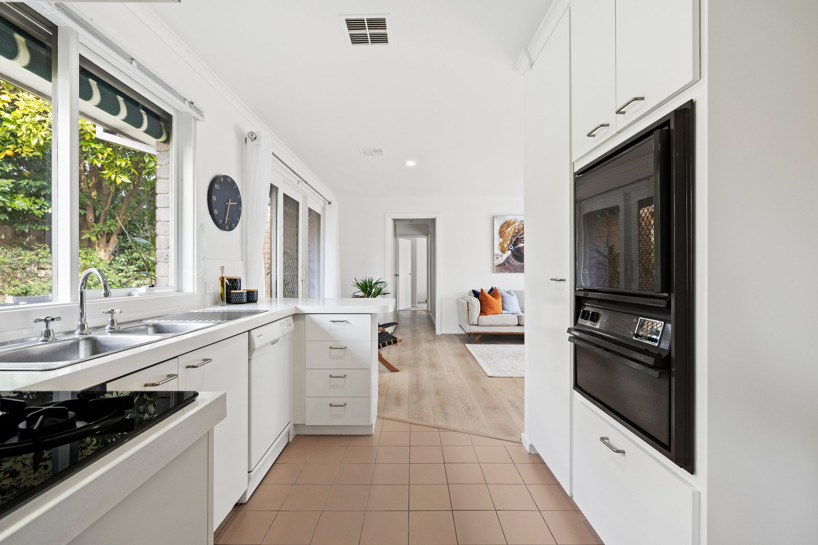 Featuring the rare drawcard of two generous living zones giving options to relax, dine and entertain, the layout features a cleverly rejuvenated central kitchen that takes in views of the incredibly private patio and lush garden stretching the full-length of the property.
