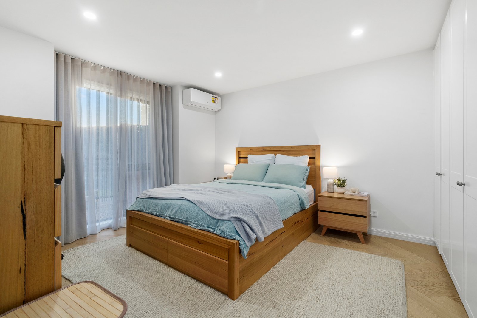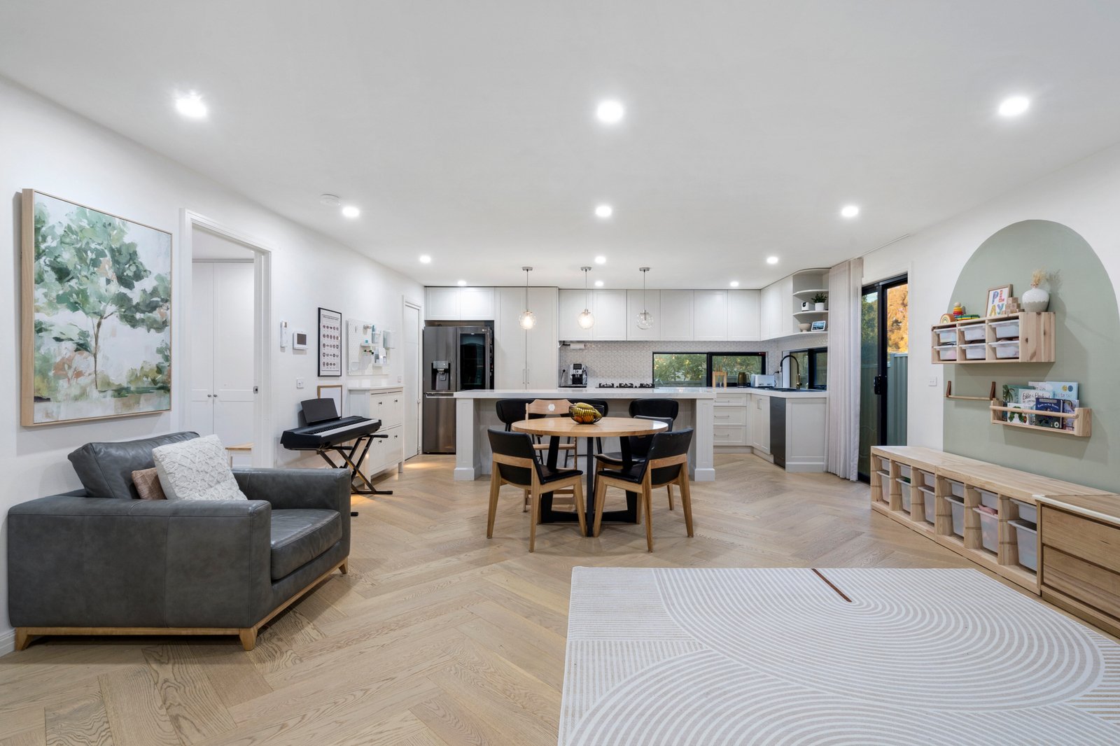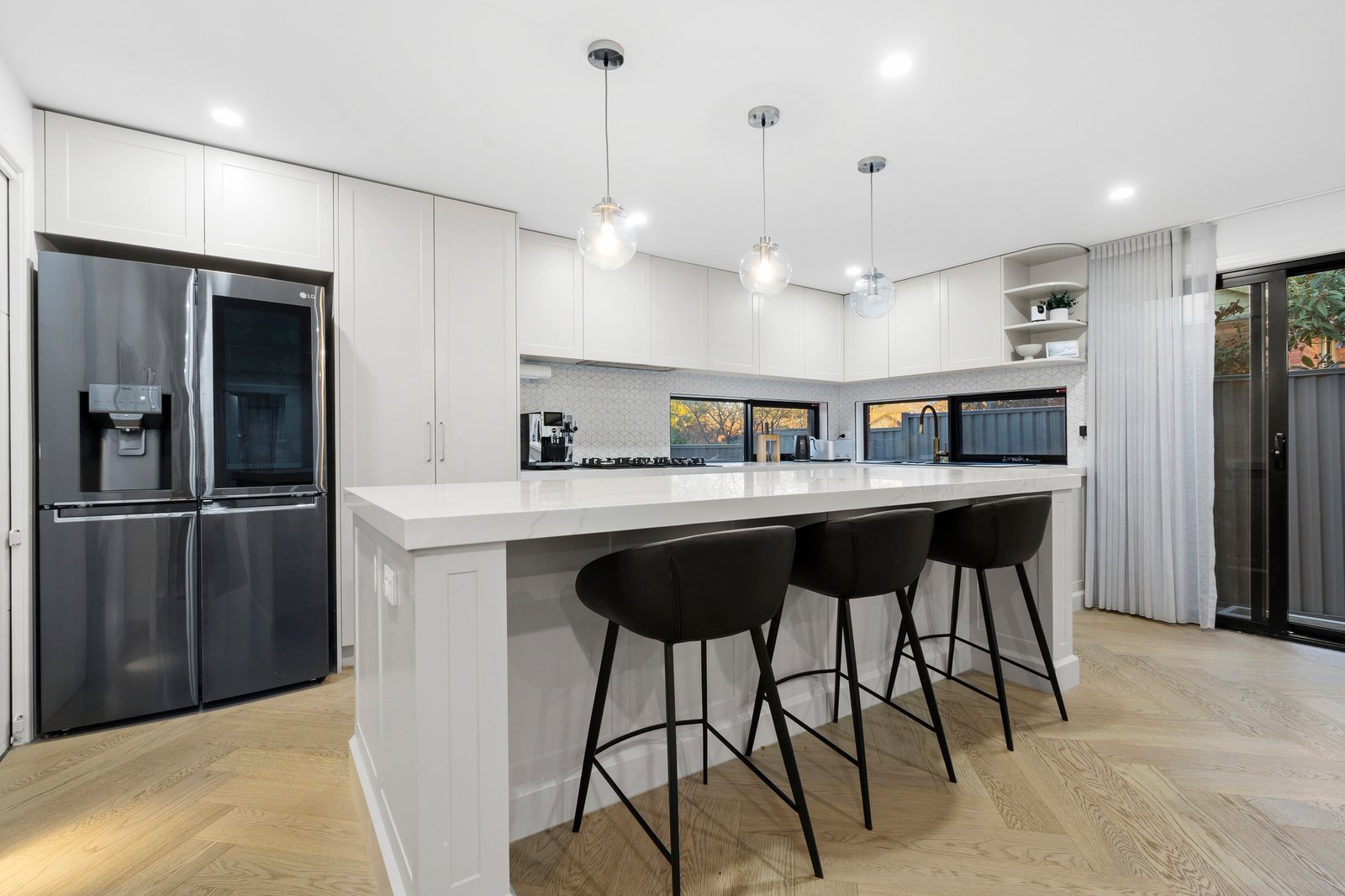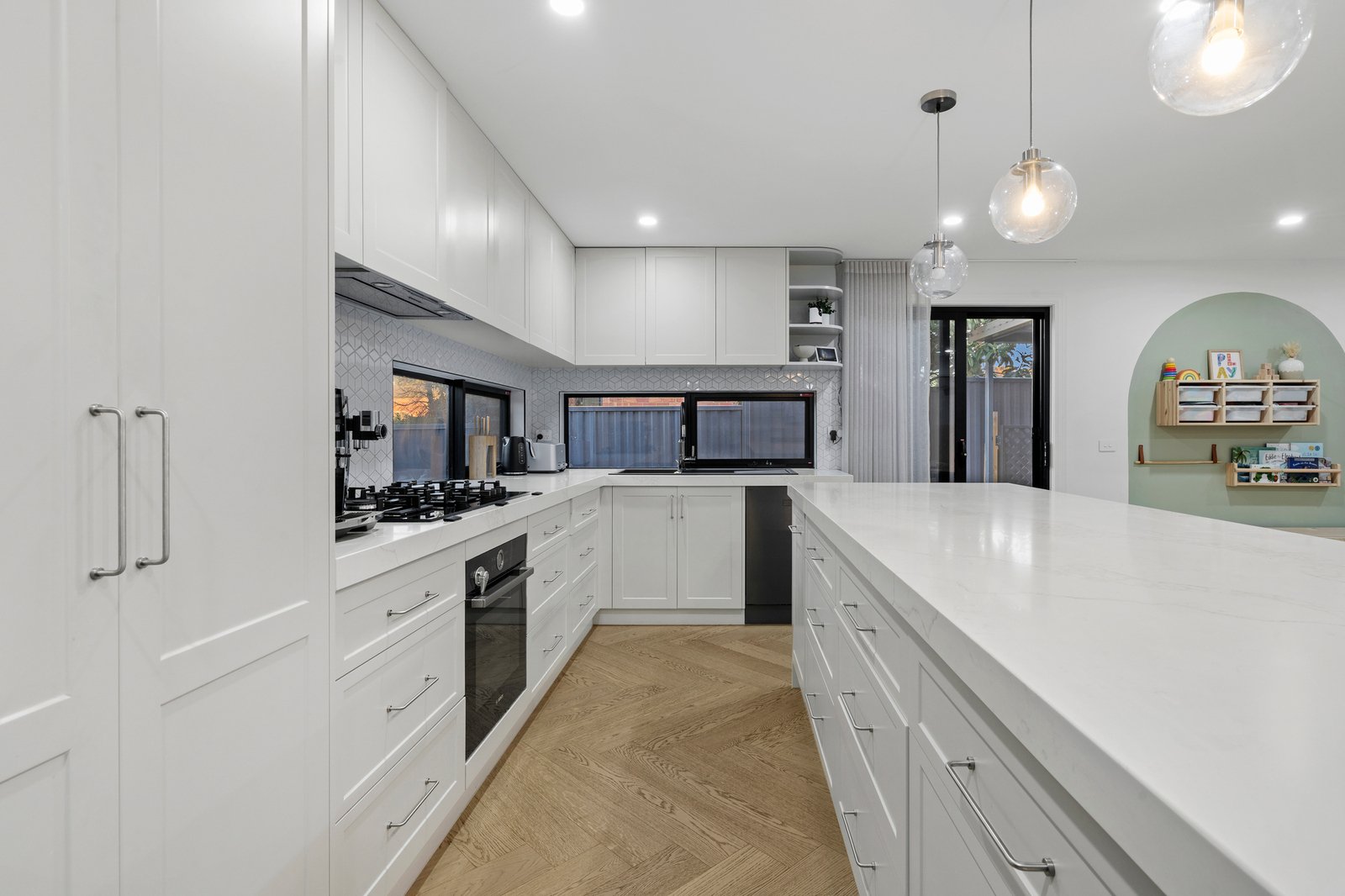 Secure and effortlessly chic, the interiors are elevated by pale oak flooring laid in an exquisite herringbone pattern that flows throughout the open plan living and dining zone. Spacious for families and perfect for entertaining, this space leads into the expansive kitchen, which has been equipped to the nines with Bosch & Asko appliances and flaunts reams of shaker-style cabinetry all topped with stone. The oversized island bench invites long catch-ups with friends, while outside, the landscaped alfresco area offers an exposed aggregate patio and faux grass lawn and is securely fenced for kids and pets.