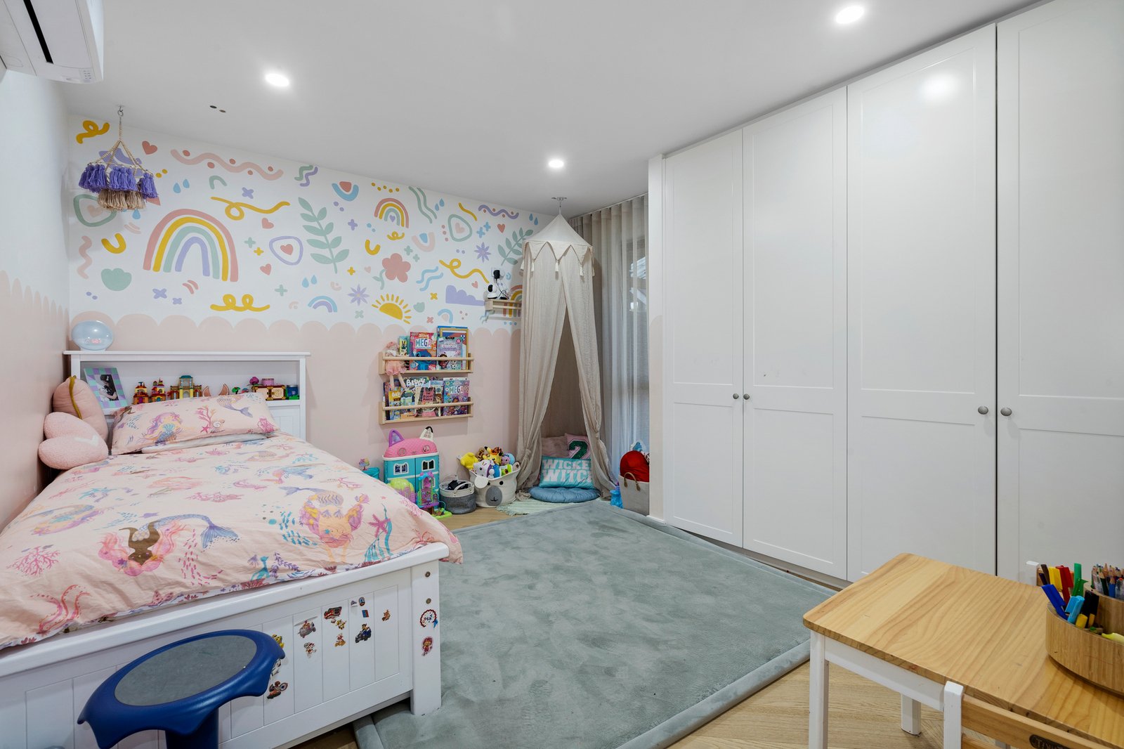 Floaty sheer curtains soften each of the three tranquil bedrooms which also benefit from built-in wardrobing – they share a beautifully renovated bathroom where vertical subway tiles, a bath & drenching shower plus stone-topped vanity and concealed cistern are just some of the highlights.
