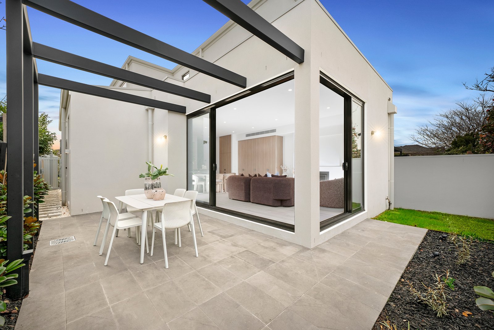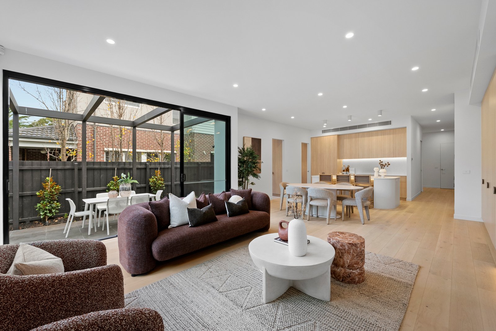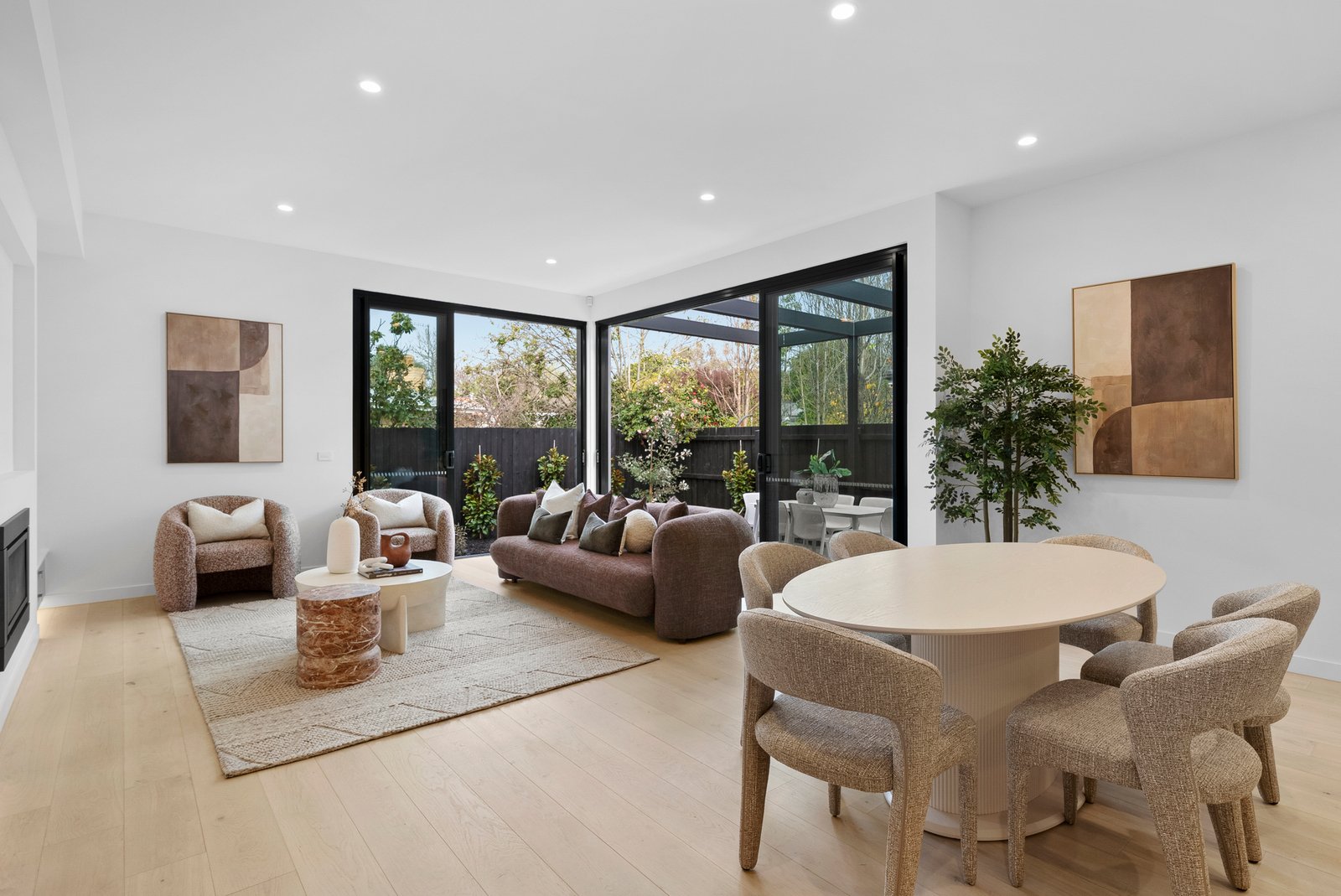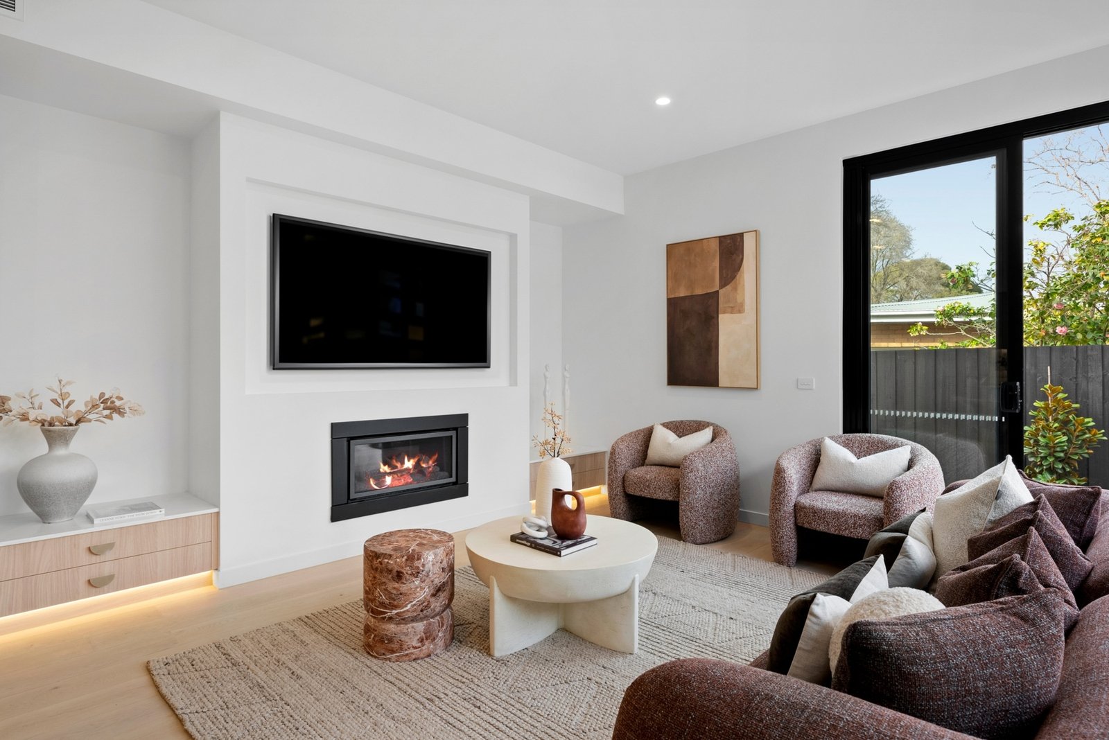 Framed by custom cabinetry and a gas fireplace adding warmth and atmosphere, the open plan living and dining domain opens wide through stacking sliding doors to the sunny al fresco dining terrace - an effortless indoor-outdoor transition, backdropped by leafy, easy care greenery.