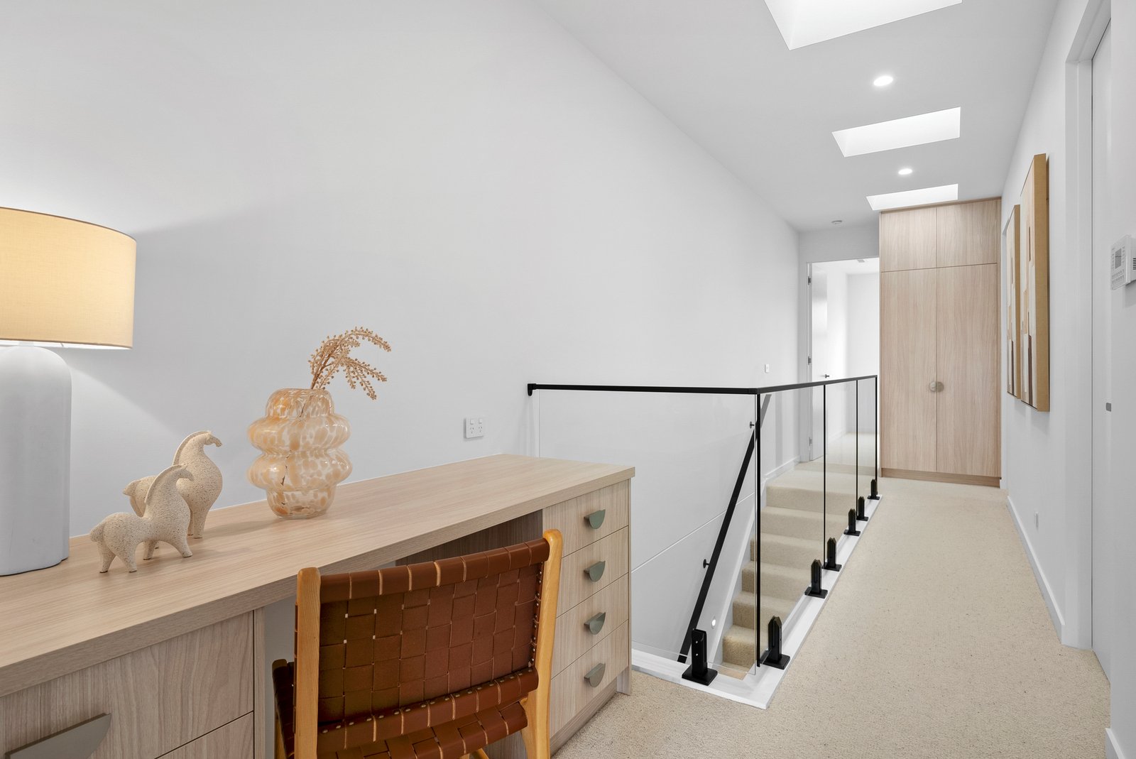 Wide American oak floors flow beneath lofty ceilings, leading through interiors where every material has been carefully selected and proportions are elegantly balanced. Light filters in through skylights and generous glazing, softened by natural textures and a restrained, enduring palette.