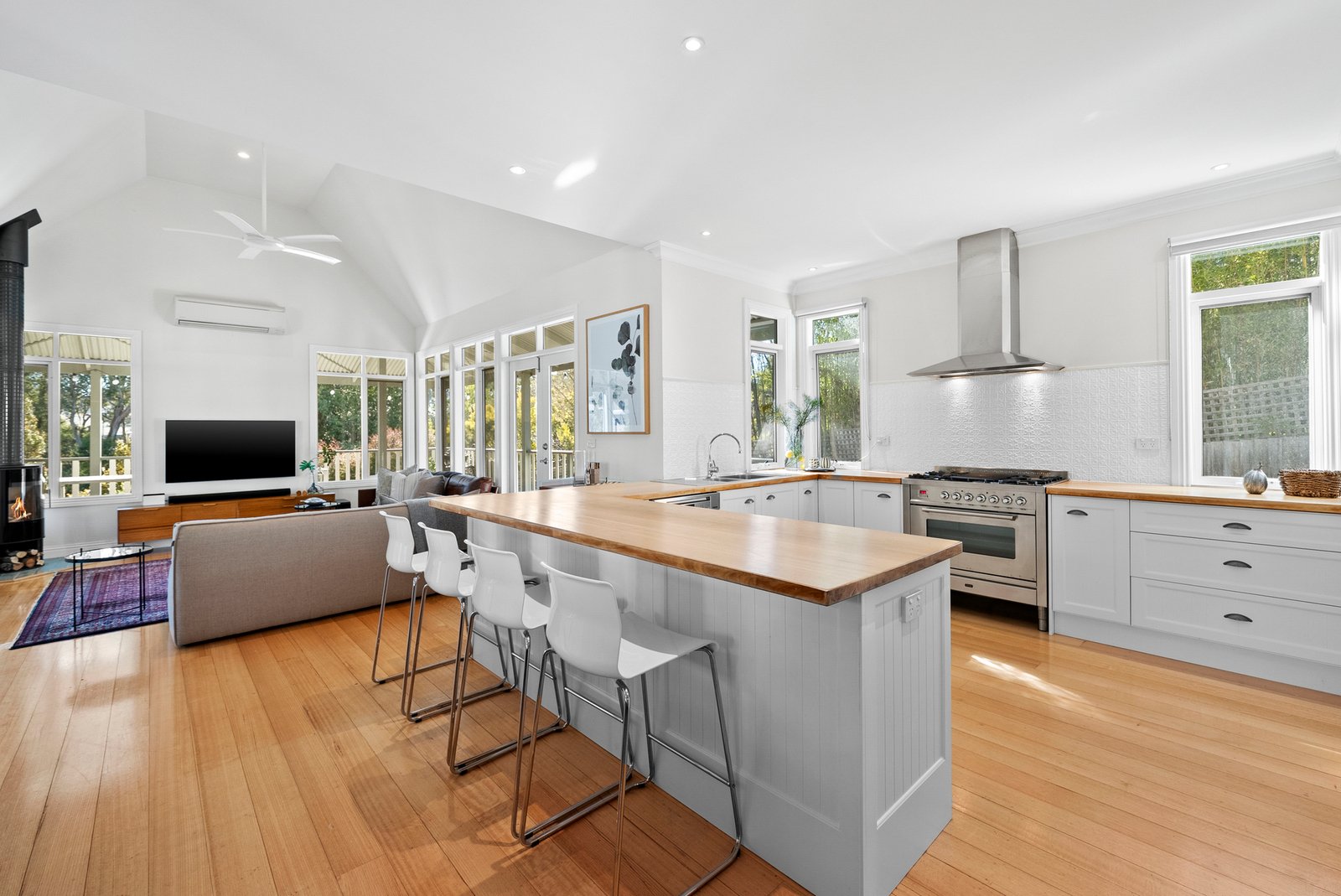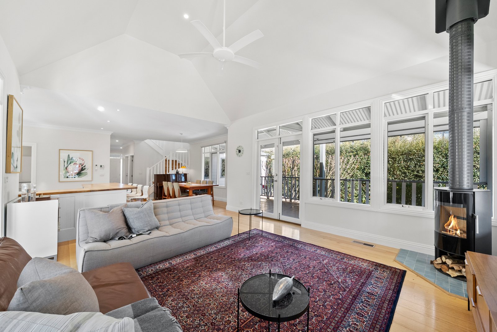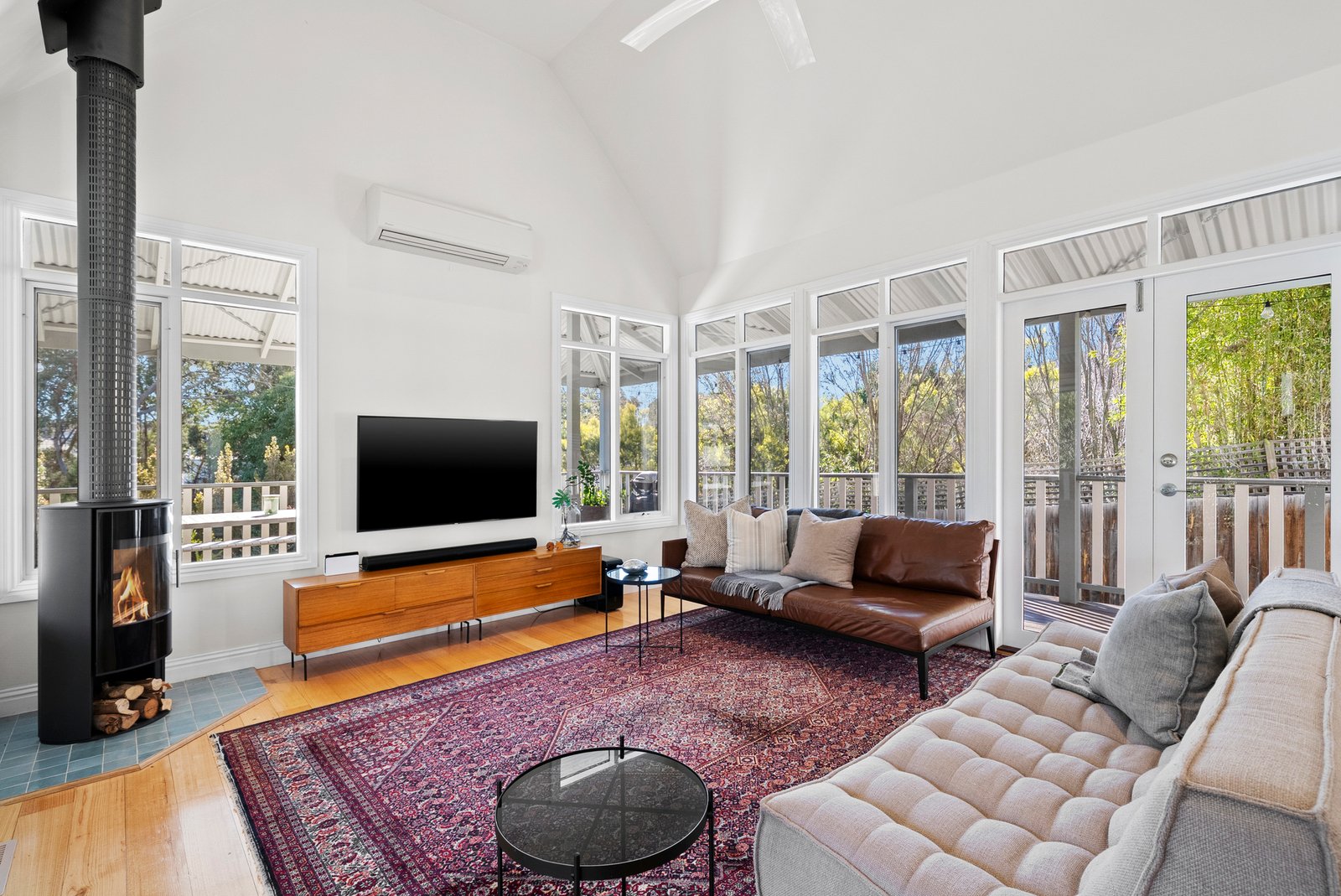 A north-facing main living and dining domain with surrounding windows offers an abundance of light, highlighted by timber flooring and Morso woodfire providing ambience, comfort and warmth. The central gourmet kitchen flaunts timber benchtops, ILVE cooker, Miele dishwasher and lavish butler’s pantry/laundry. Double glass doors reveal a wraparound verandah alfresco backdropped by treetop views with outdoor blinds to keep the western sun at bay whilst entertaining during summer.