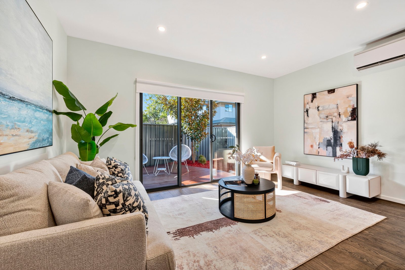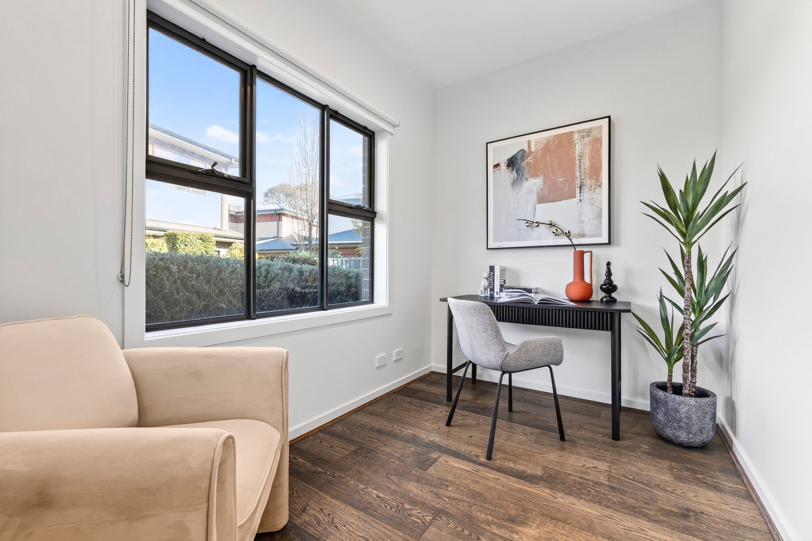Designed for easy living, the light-filled interiors feature an open-plan living and dining area, a well-appointed kitchen with quality appliances, and a private courtyard ideal for low-maintenance outdoor entertaining. The master bedroom enjoys its own ensuite, while two additional bedrooms share a central bathroom, also featuring a study, ideal for work from home.