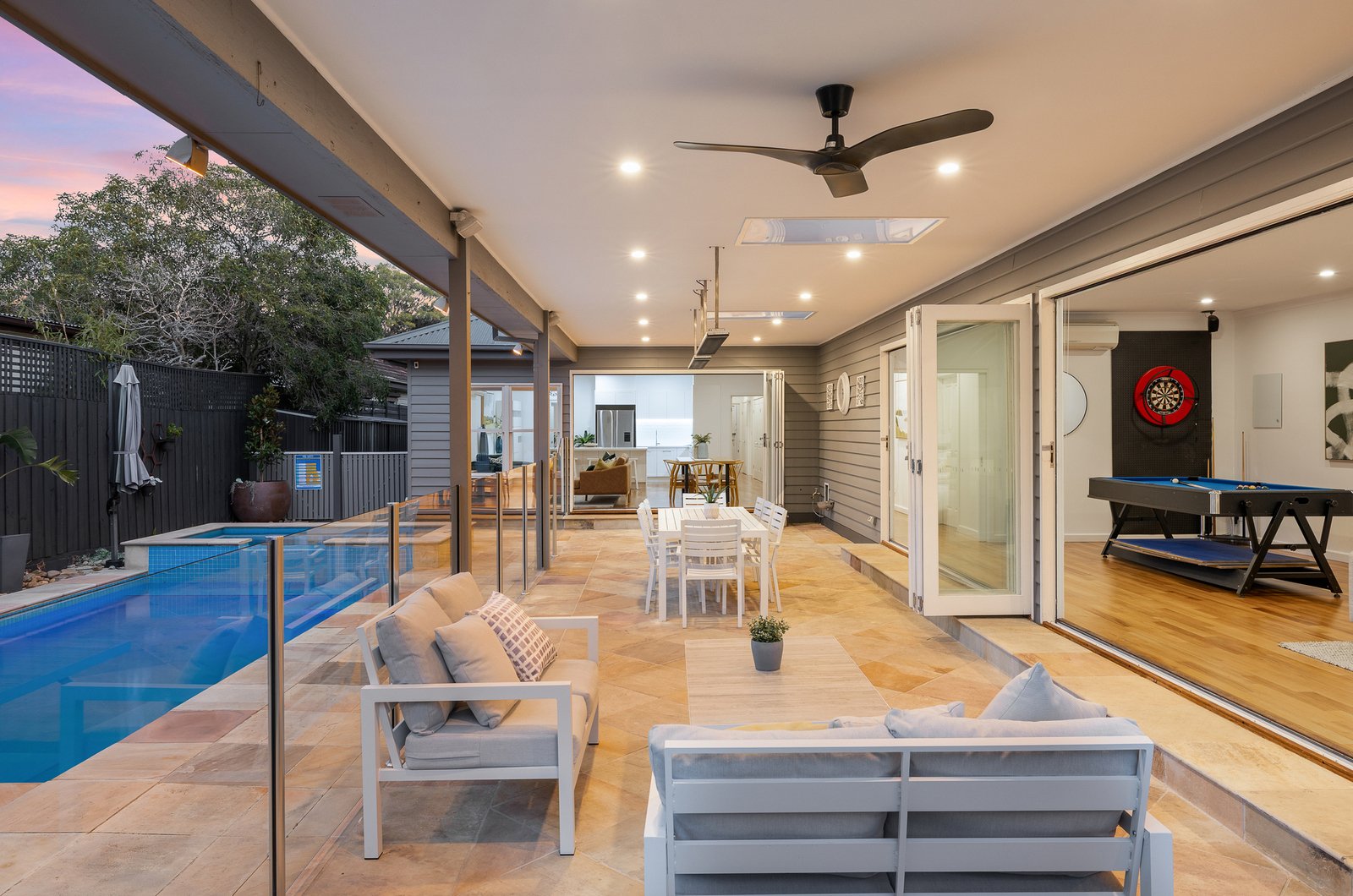 Multiple living areas provide flexibility for growing families, while the open-plan kitchen, meals, and living zone is the natural heart of the home — featuring stone benchtops, premium appliances, and expansive storage. Sliding doors reveal a resort-style outdoor oasis, with a sparkling in-ground pool and spa, lush gardens, and a covered sandstone alfresco area perfect for entertaining.