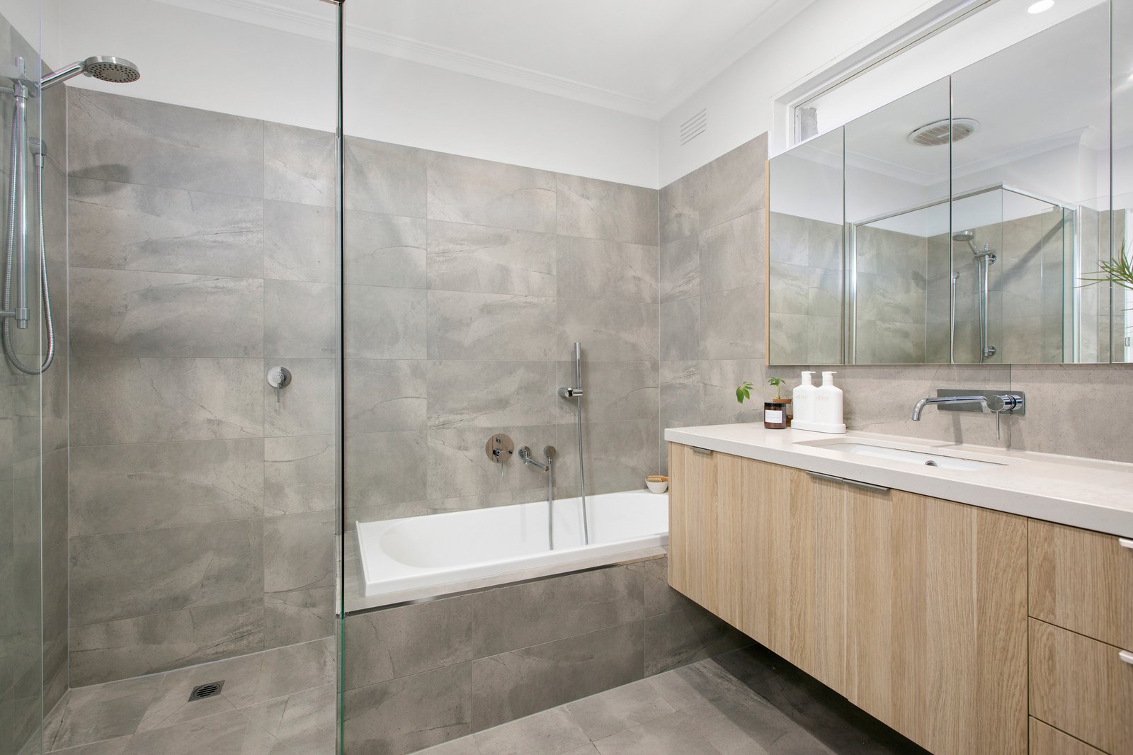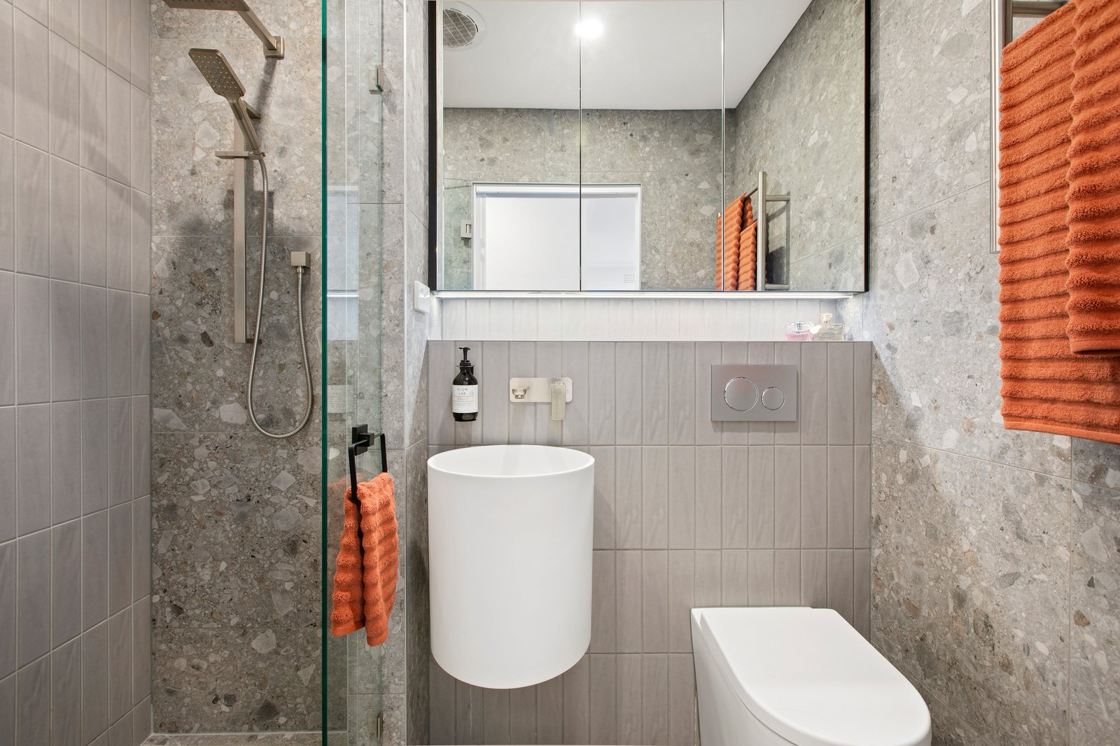 A statement cylindrical basin is a highlight of the magazine-worthy main ensuite – an equally stylish central bathroom with floating vanity, mirrored storage and sumptuous bath services the remaining bedrooms, each with built-in storage.