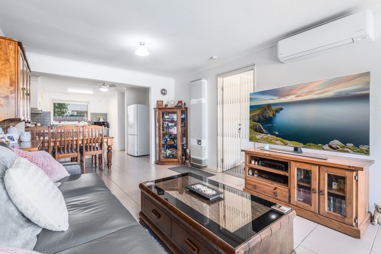 The kitchen is well-equipped with ample cabinetry, an electric cooktop, and breakfast bar, overlooking the dining area and flowing through to a spacious lounge — a perfect space to relax or entertain.