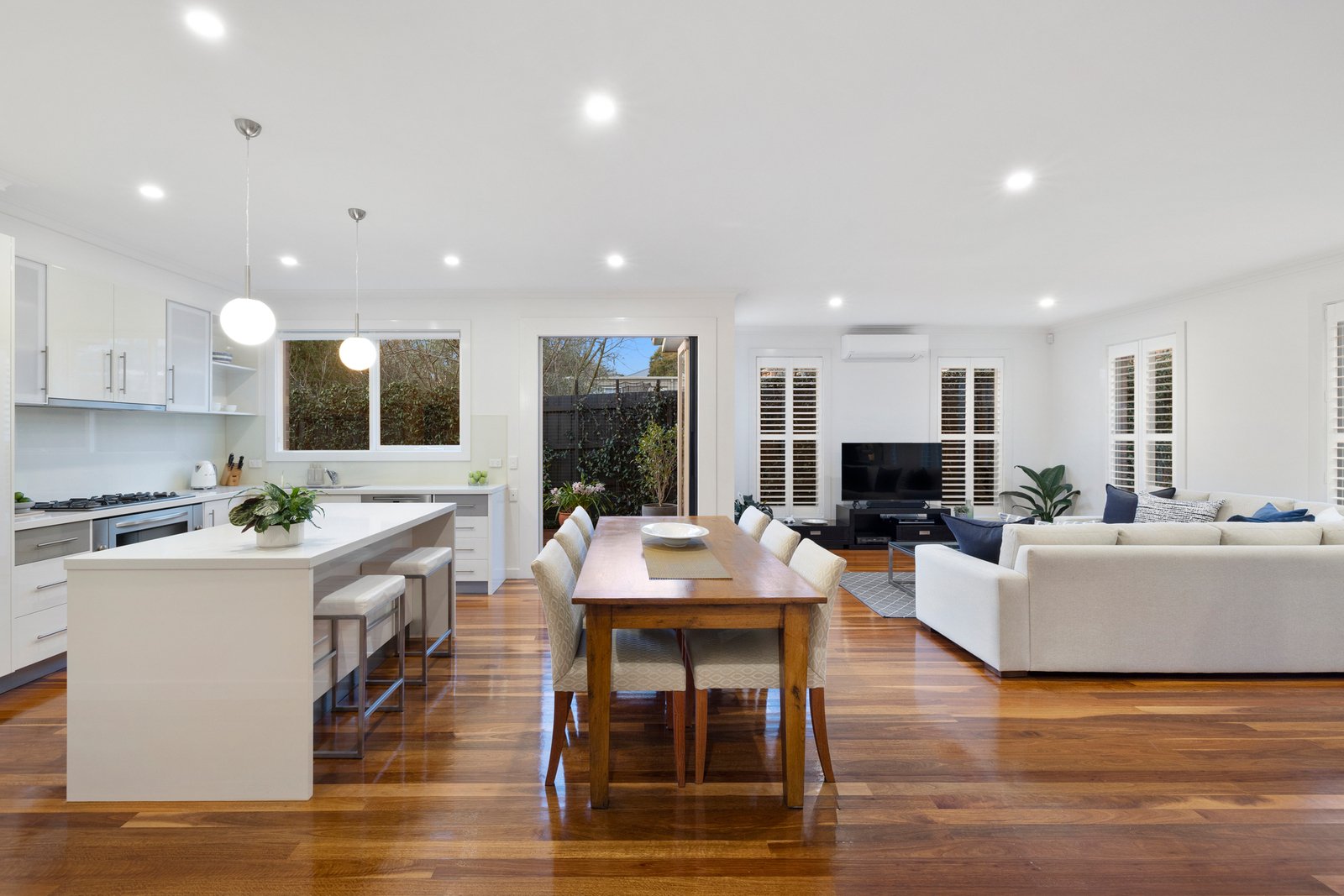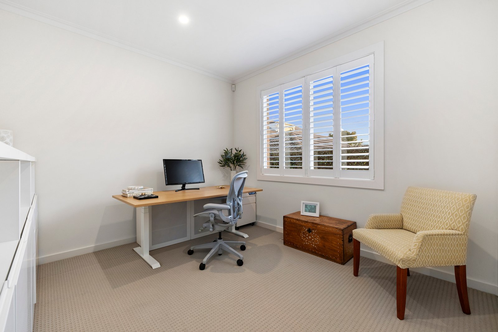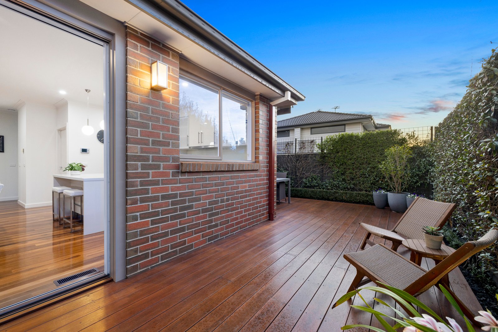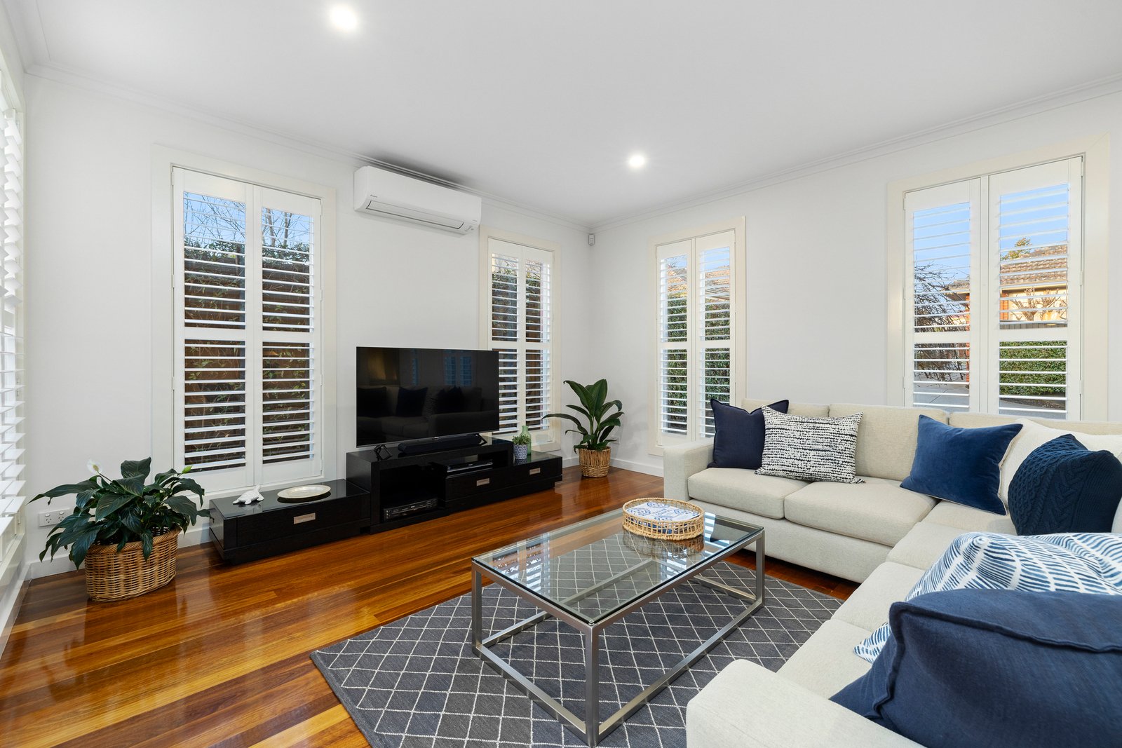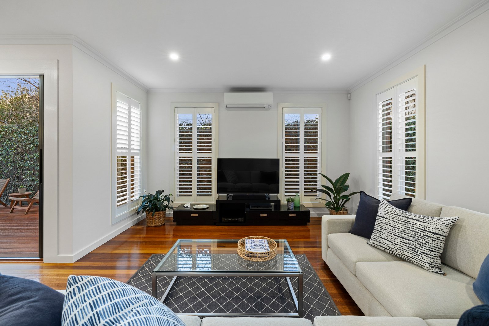 Enriched by solid Spotted Gum flooring, plantation shutters and crowned by lofty ceilings, the north-facing layout is filled with glorious natural light through the expansive living and dining zone. Desirably open plan, this connects with a stone kitchen boasting 900mm cooking appliances and an as-new Miele dishwasher, whilst outside the entertaining space continues to a sundrenched wraparound alfresco deck.