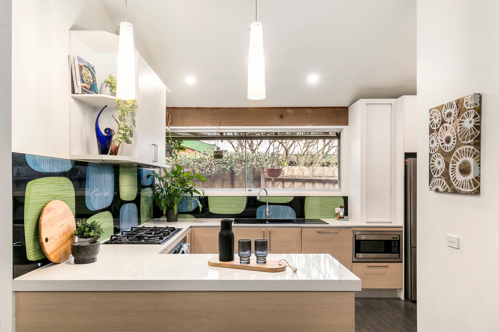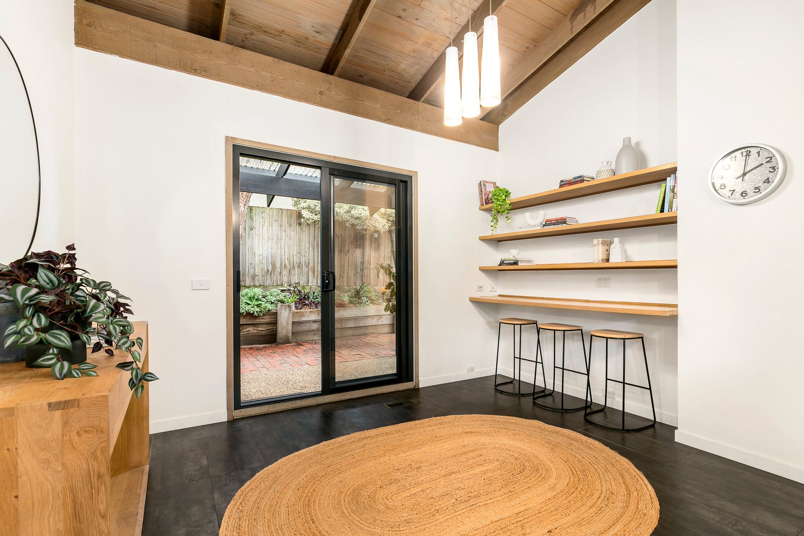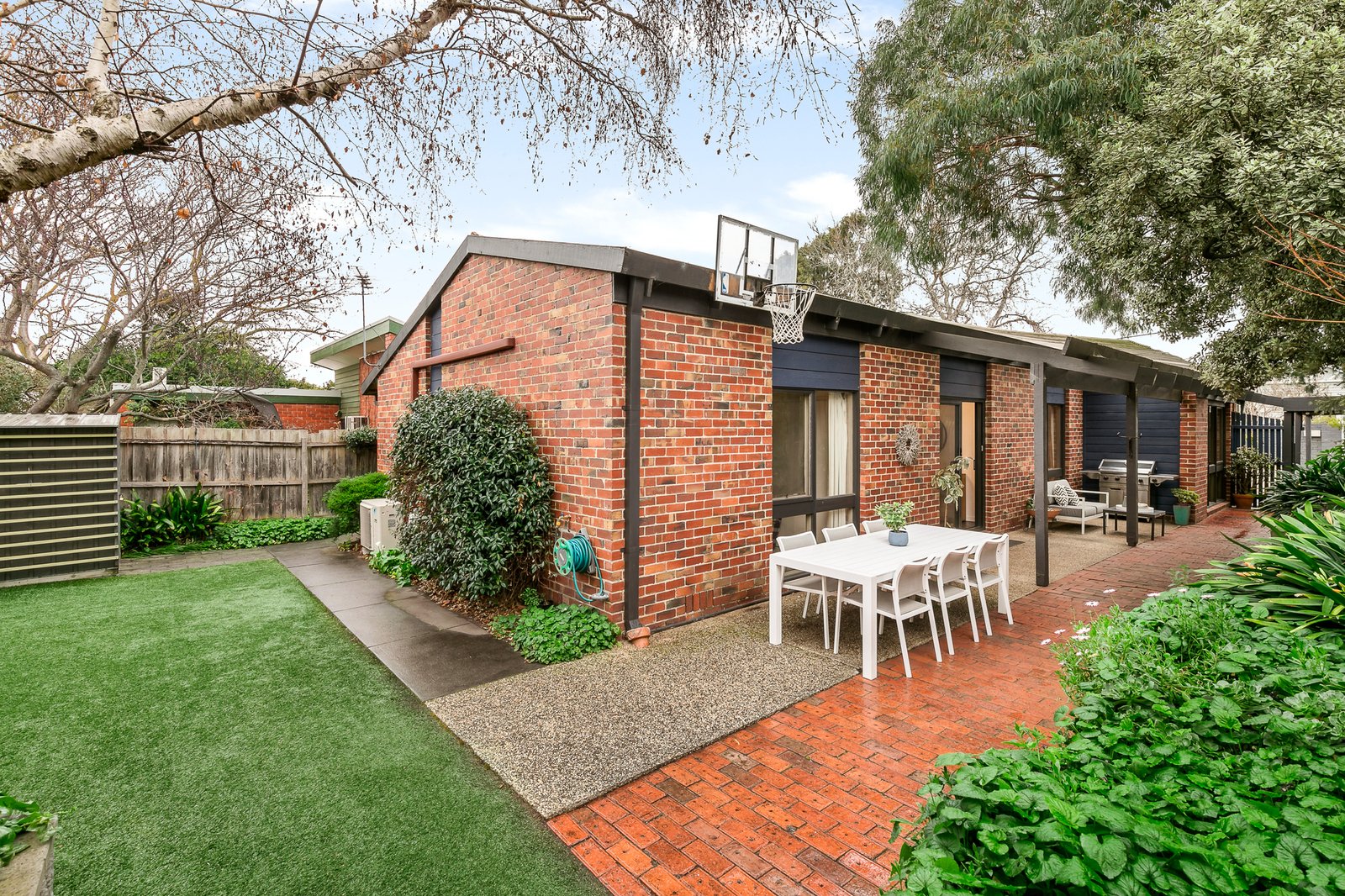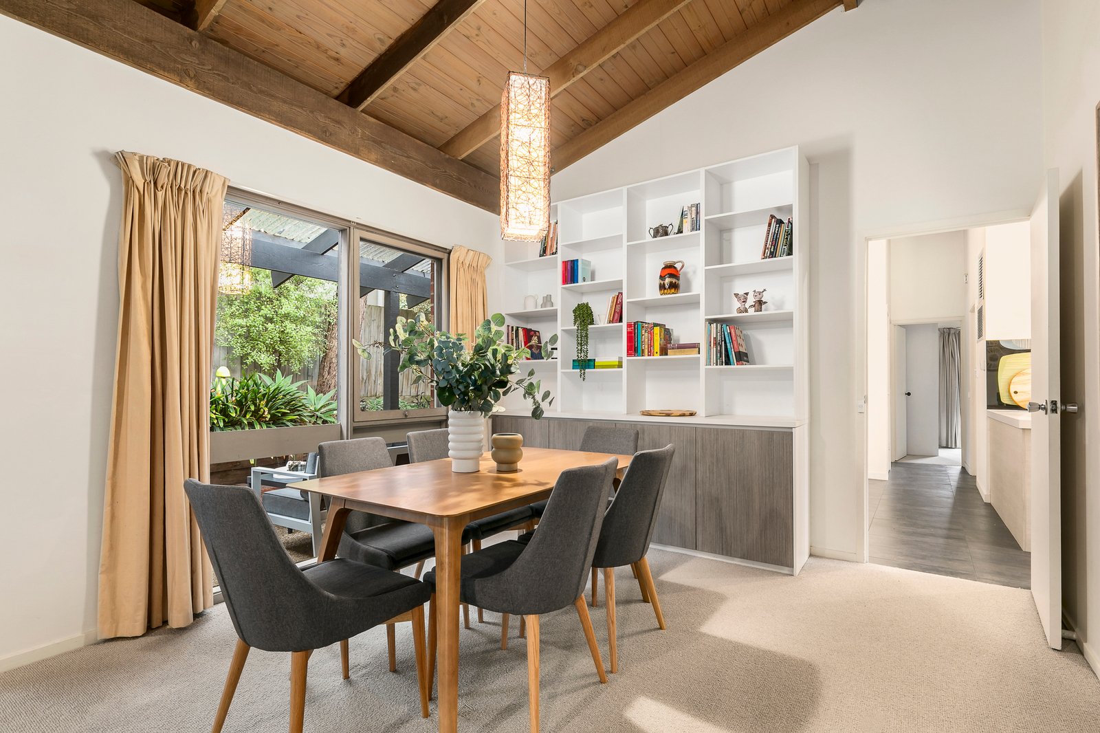 Glass sliders open to a covered, outdoor entertaining area providing the ideal spot to catch the sun whilst entertaining and watching the kids play in the backyard that offers a cubby house, raised garden beds and an ever-green synthetic lawn. Inside, the garden-view living and dining room is enhanced by a vaulted, timber-lined ceiling, floor-to-ceiling windows and a wall of custom cabinetry.