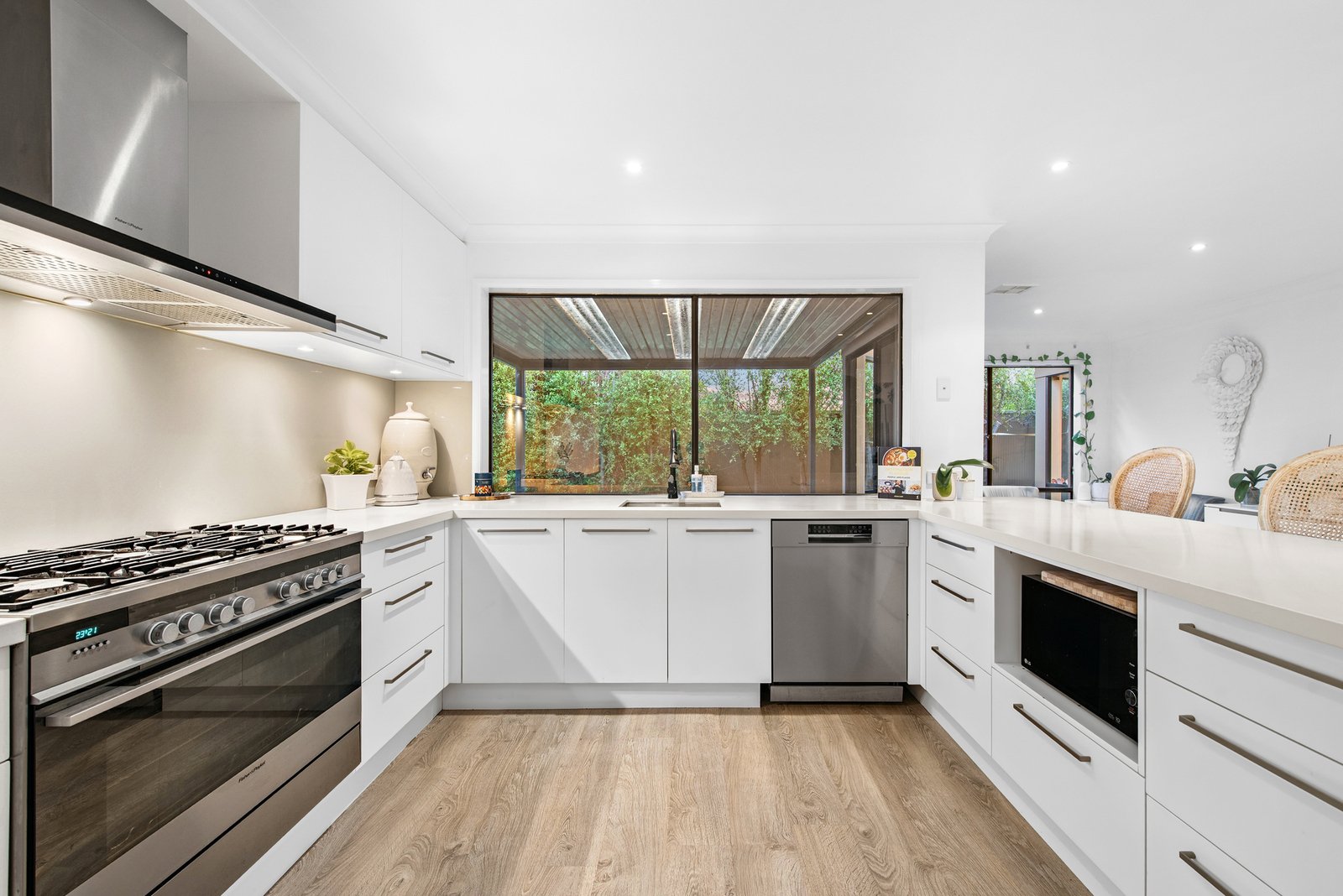 The centrepiece is a sparkling in-ground pool framed by lush artificial turf and a sprawling wraparound pergola-perfect for alfresco dining, family gatherings, or simply unwinding in style. The centre of the home is a gourmet stone-top kitchen fitted with premium Fisher & Paykel stainless steel appliances, including a gas cooktop with wok burner, and an open café-style servery window that connects directly to the outdoor entertaining space.