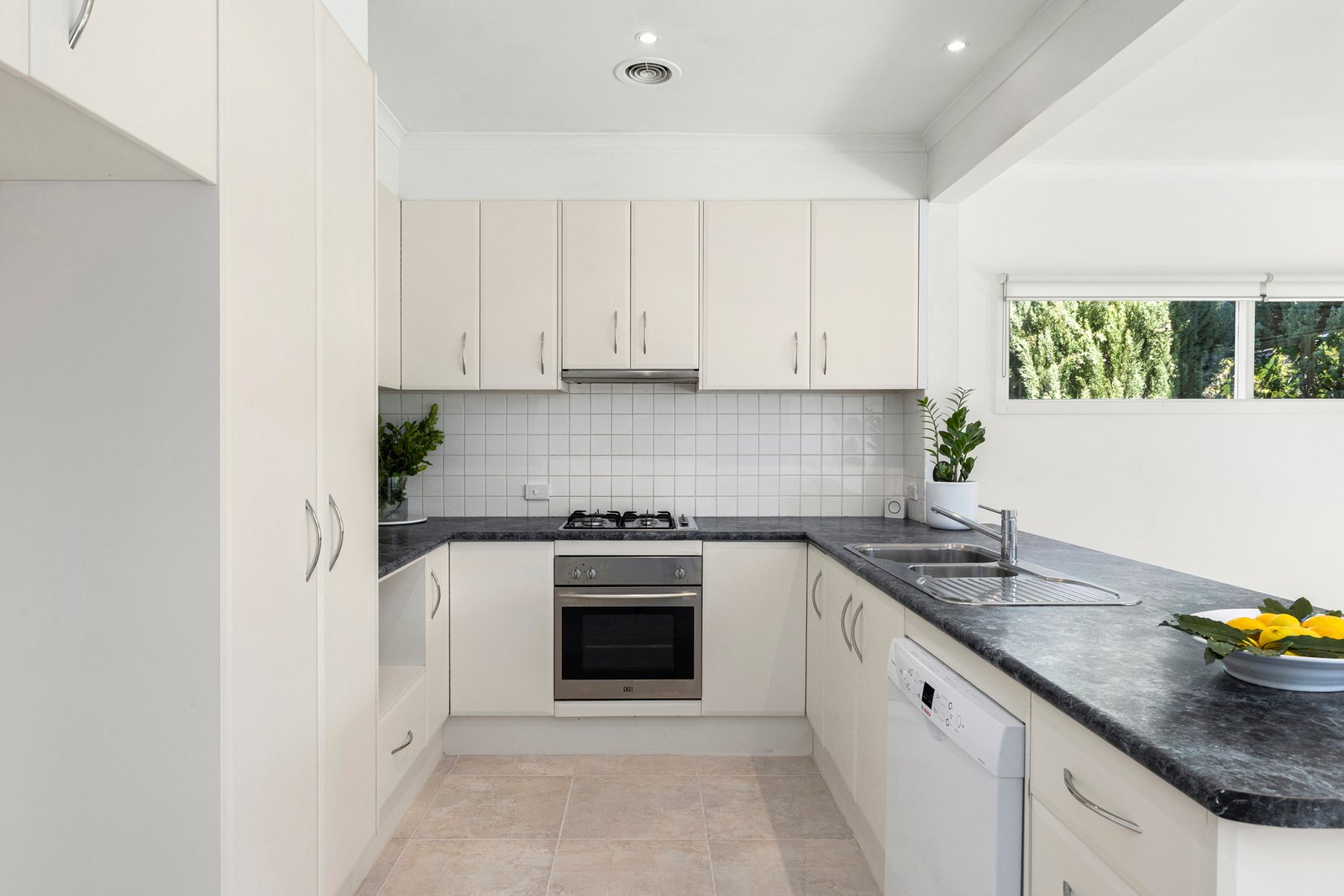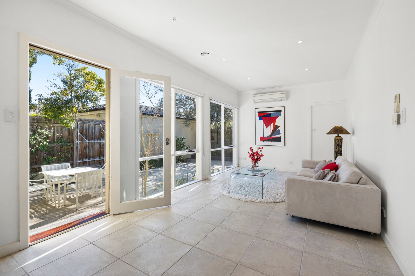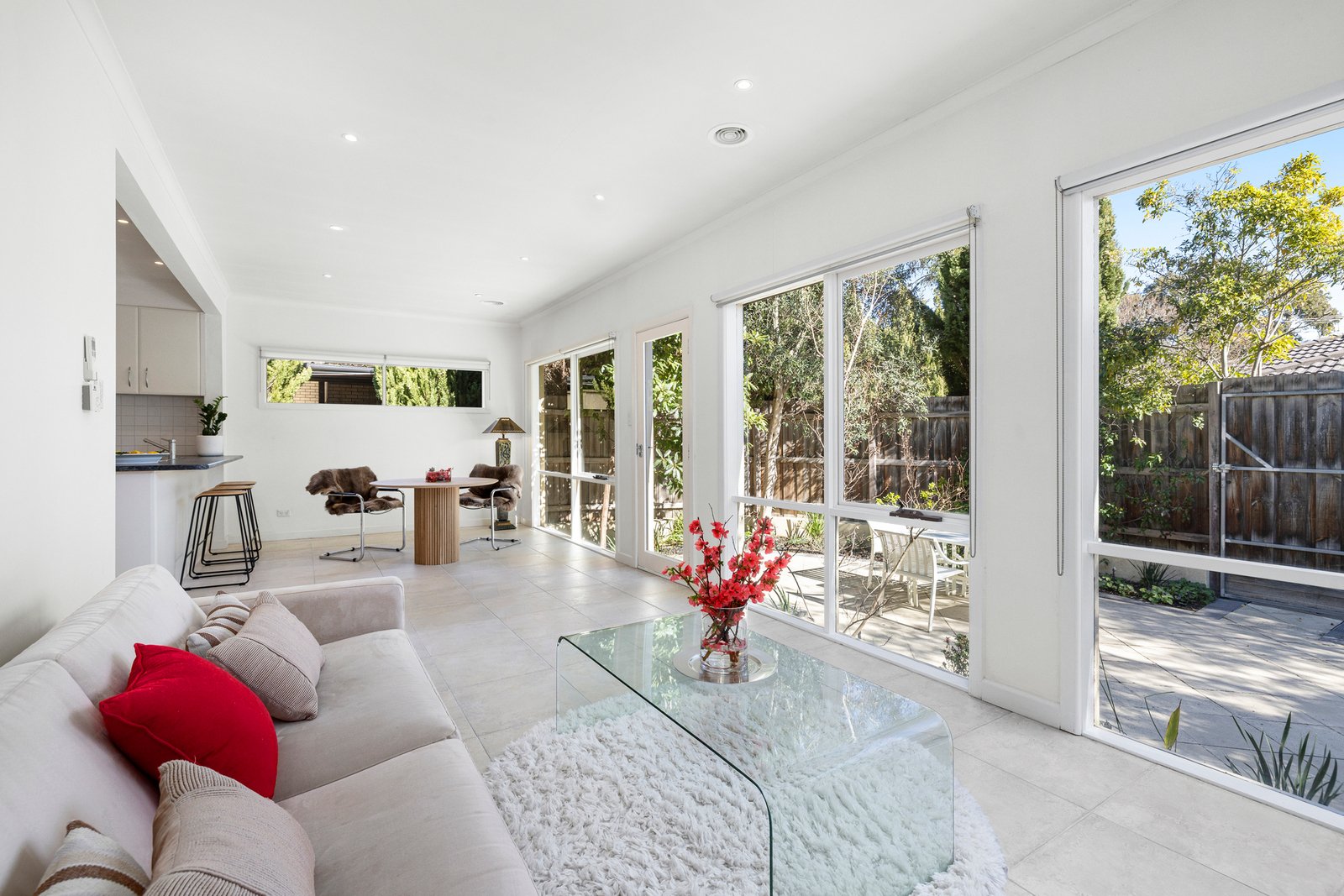 A skylit entrance welcomes guests to interiors that include a serene garden-view front lounge with fireplace, a smartly-appointed modern kitchen (gas cooktop and Bosch dishwasher) and an impressive light filled meals/family room that looks out , through floor to ceiling windows, to the large sunny rear courtyard, embraced by manicured easy-care landscaping and the gentle splash of a water fountain feature – perfect for relaxing or entertaining in the open air.
