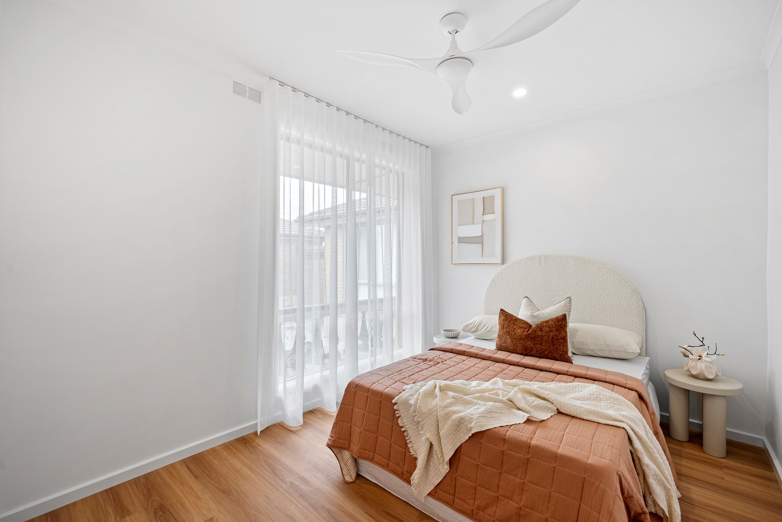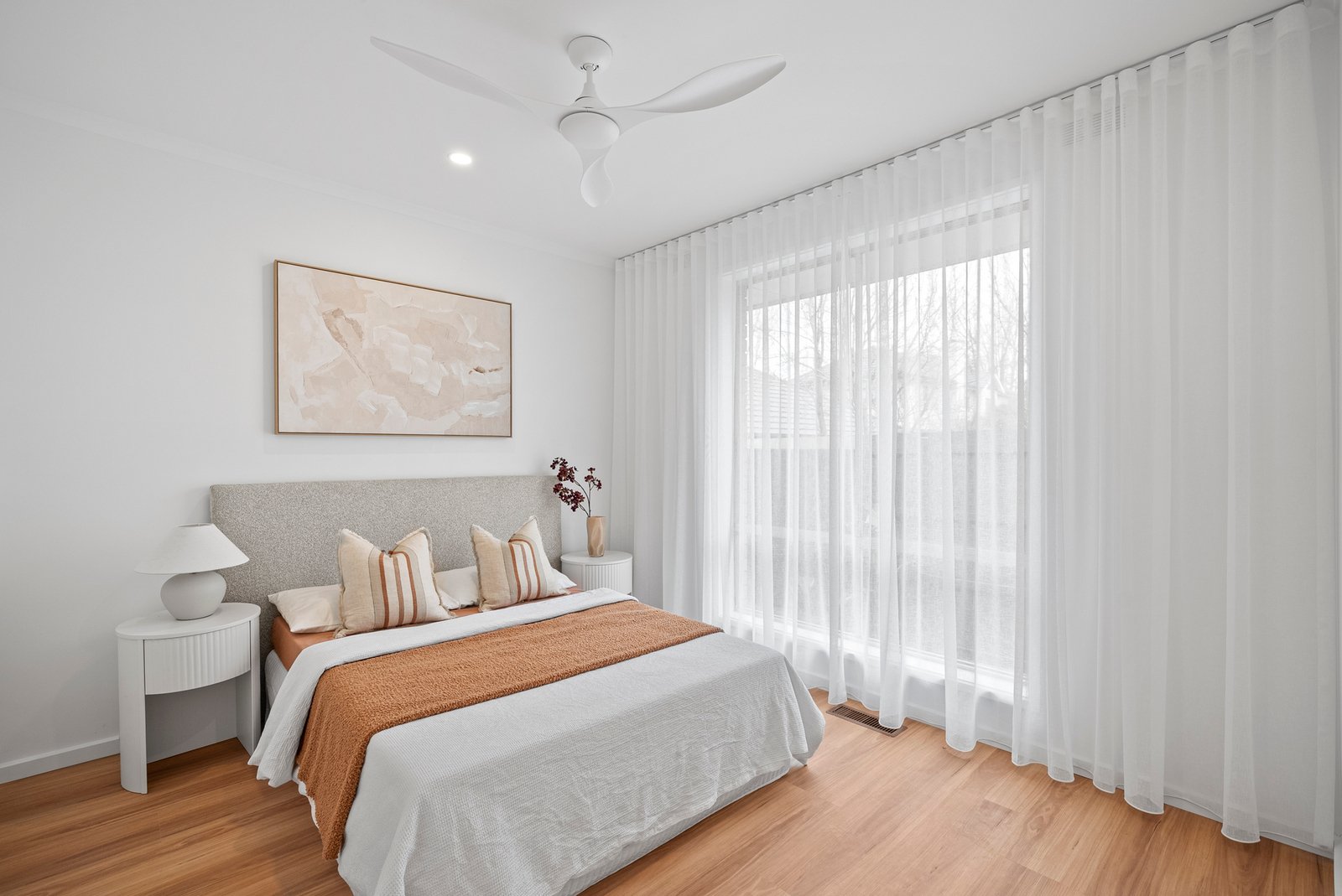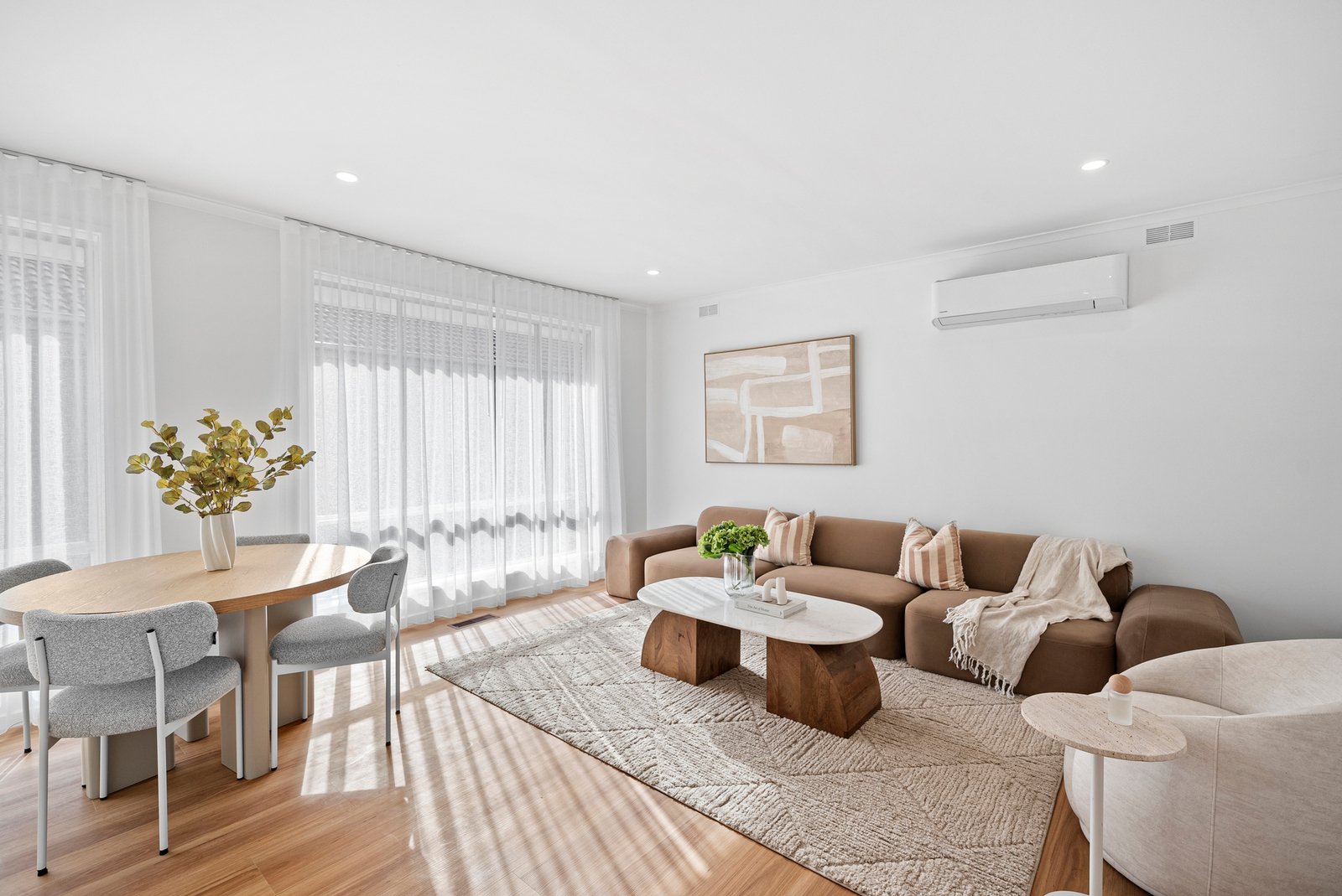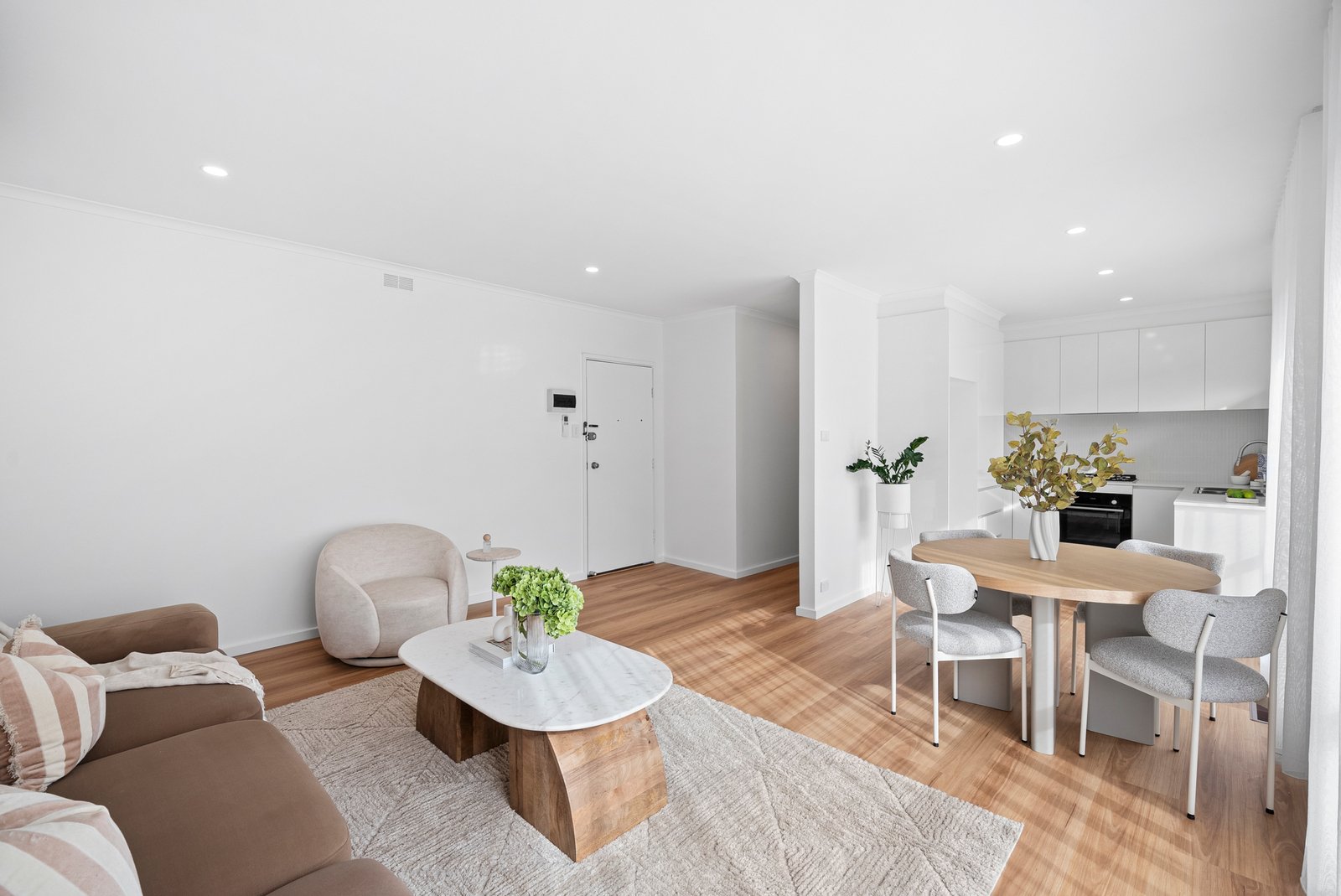 This top-to-toe renovation has transformed an original unit into a bright, contemporary haven. Tucked privately to the rear, it now features a light-filled open-plan living and dining space with crisp white walls and ceilings that amplify the abundant natural light, complemented by warm-toned timber flooring for texture and warmth.
