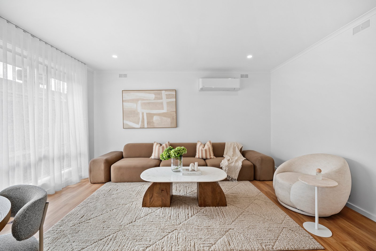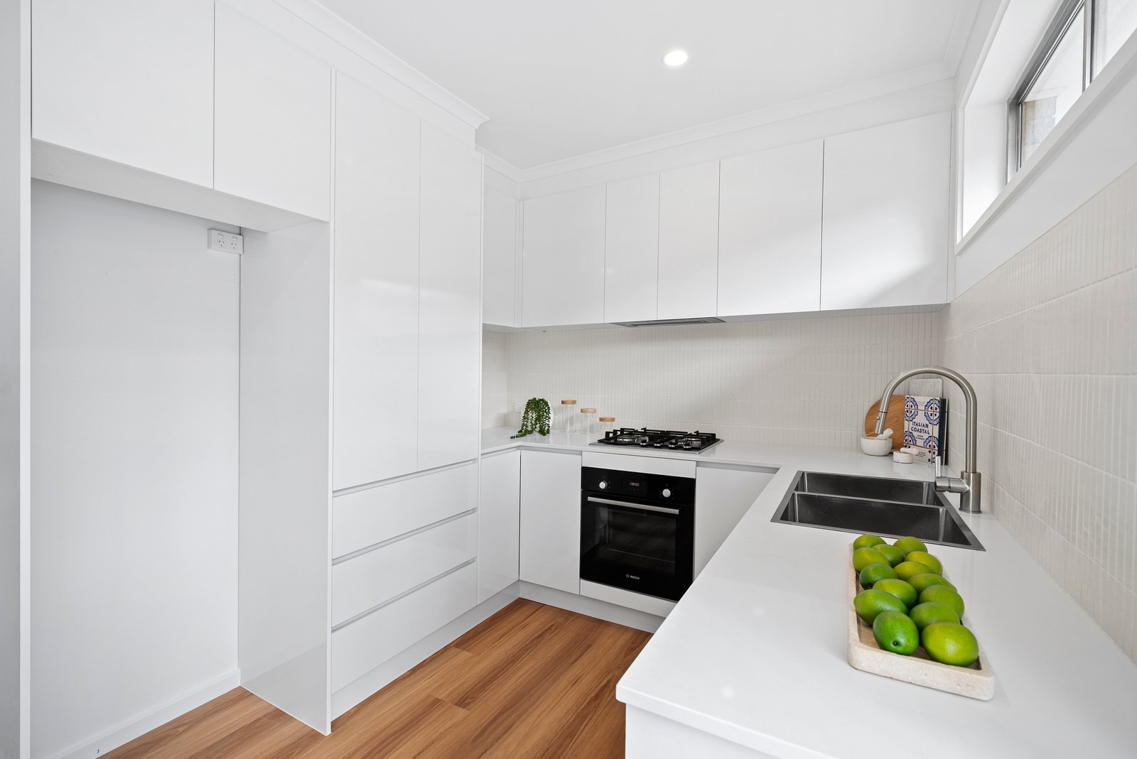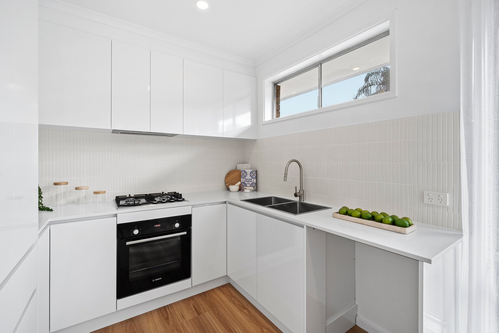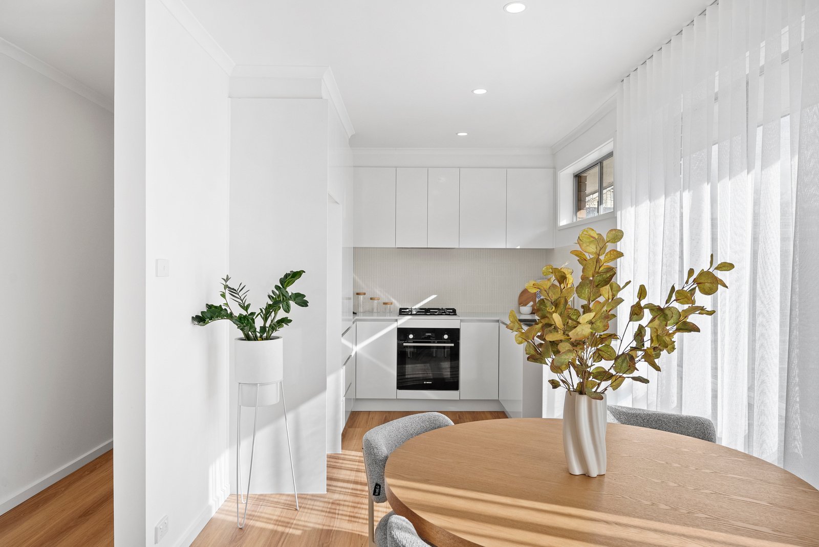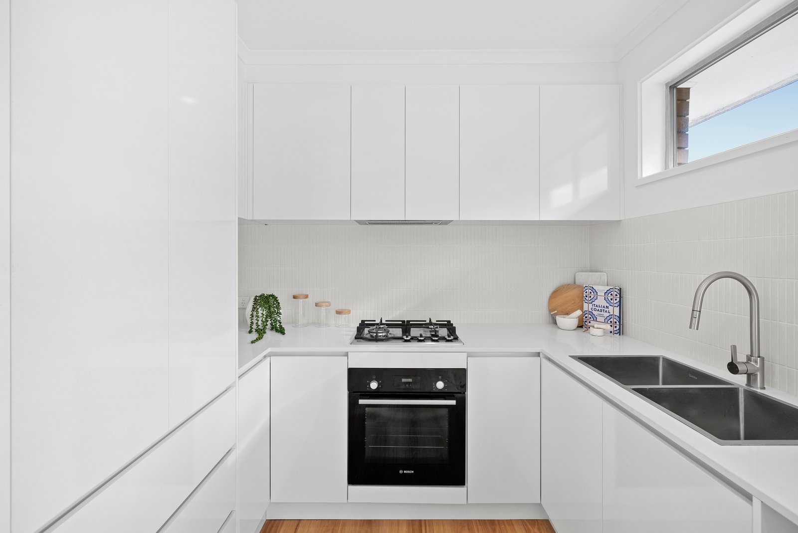 The sleek kitchen flows seamlessly into the living zone, offering brand new white cabinetry, a feature tiled splashback, and new appliances including a Bosch oven and Westinghouse gas cooktop.