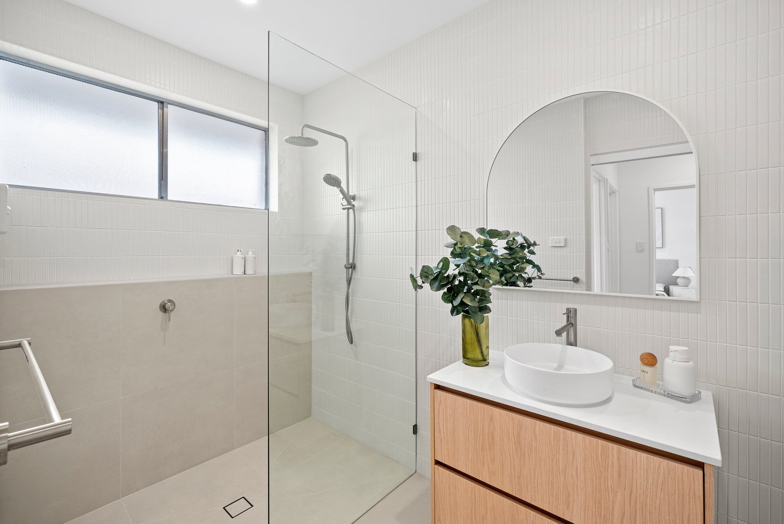 Both bedrooms include built-in robes and ceiling fans, with a fully tiled bathroom showcasing feature tiling that echoes the kitchen splashback. Ducted heating, split-system comfort, new plumbing, electrics, and hybrid flooring ensure you can move straight in.