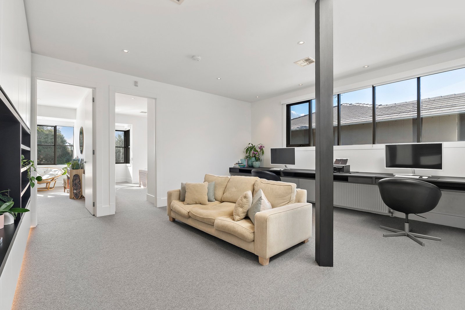 Luxury and comfort continue with opulent ensuites and bathrooms, each beautifully appointed with high-end fixtures and finishes. Additional comforts include hydronic heating, air conditioning throughout, and dedicated study zones for those working or studying from home. Practicality meets convenience with a double garage, extra storage space, and a workshop with rear access, offering ample room for hobbies, projects, or additional storage needs.