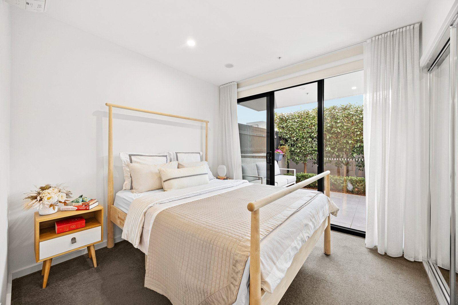 The generously sized bedroom is filled with natural light, featuring mirrored robes and serene terrace views through glass sliders.