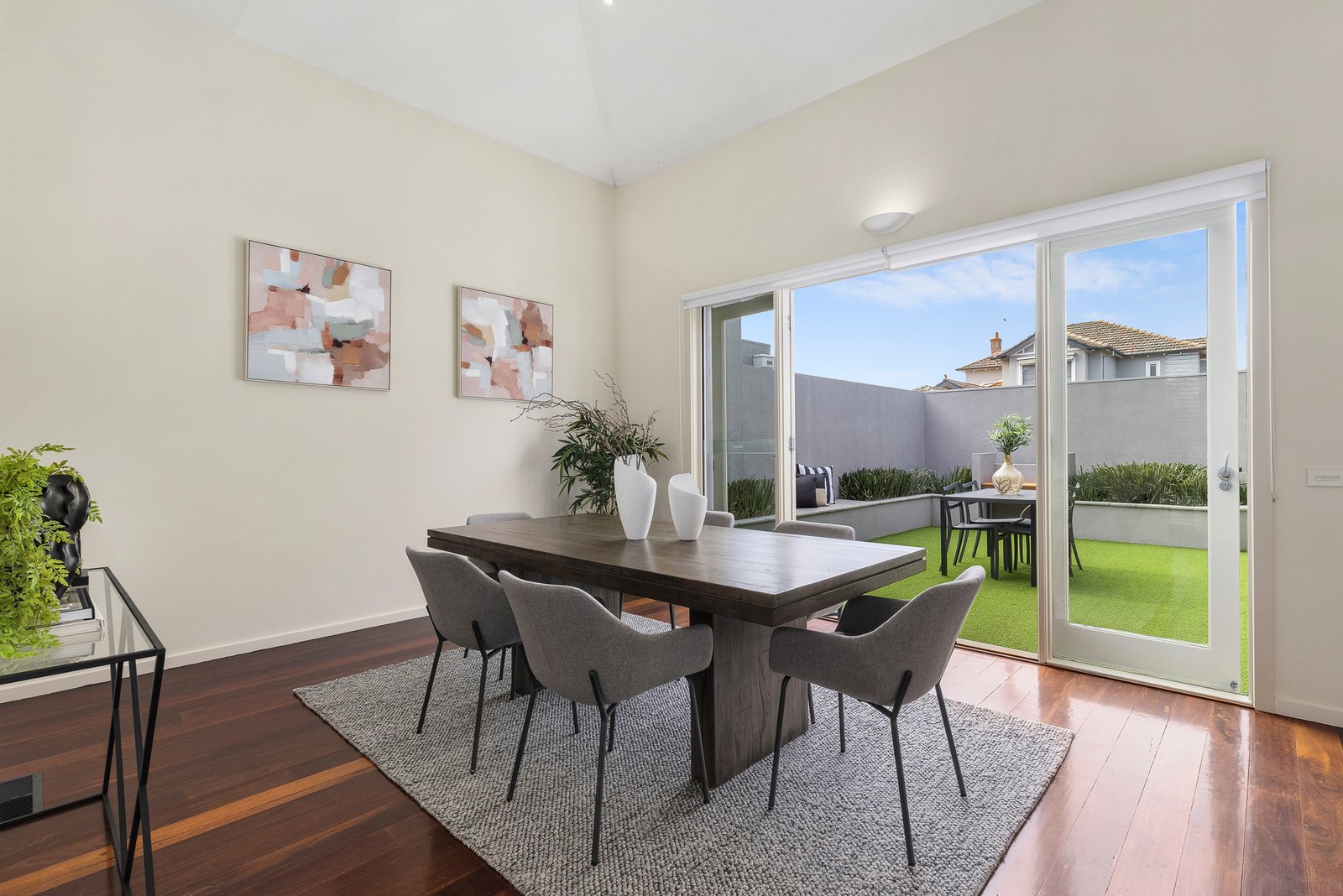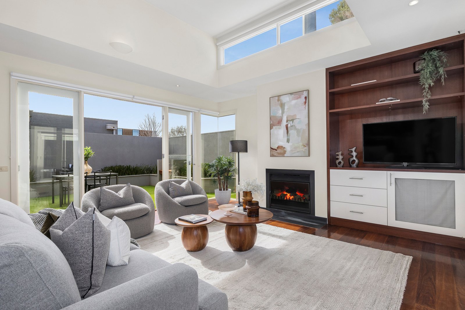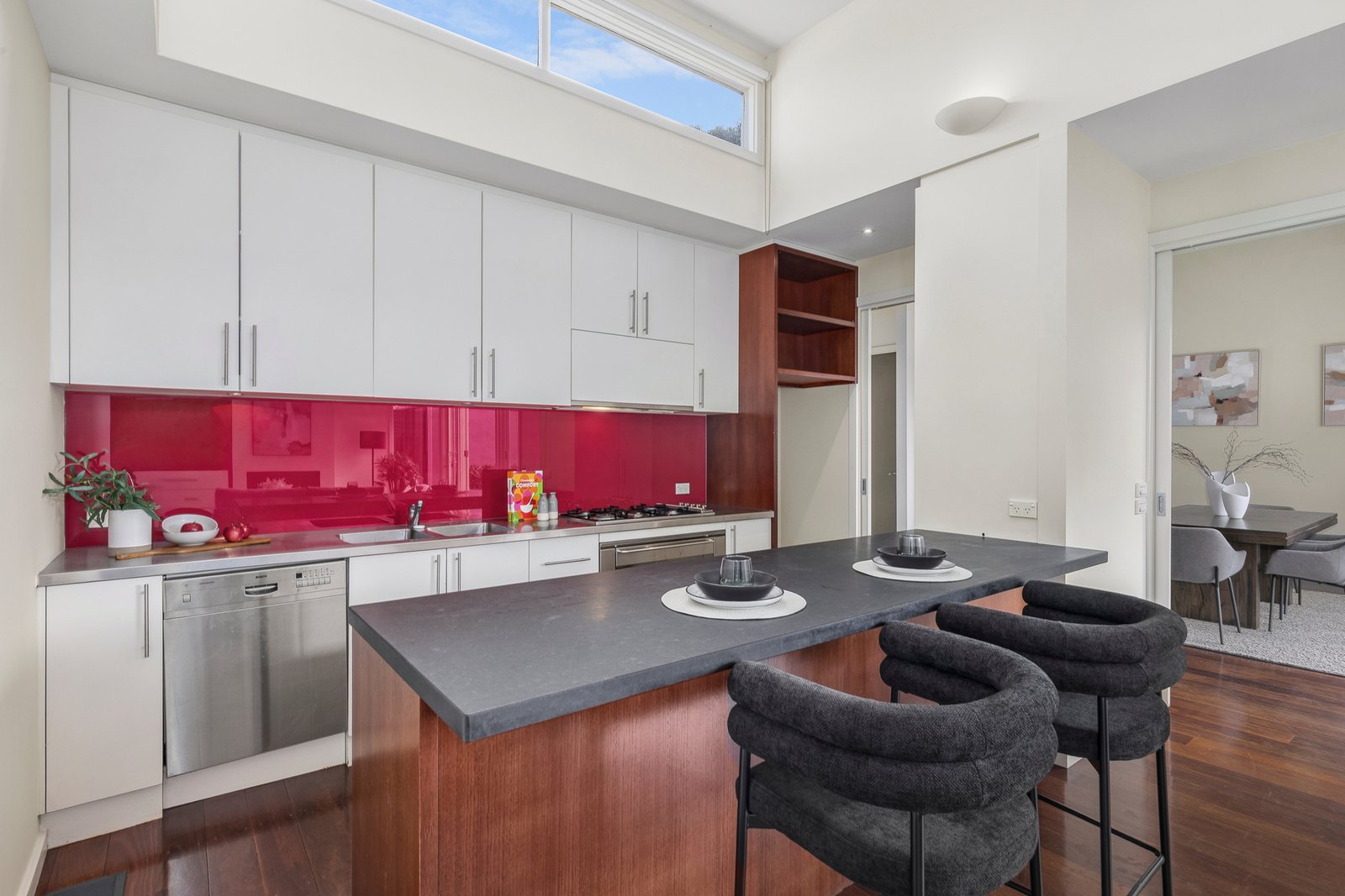 Part of an exclusive boutique group, this expansive three-bedroom, 2.5-bathroom home immediately impresses with its quality and style. Richly toned hardwood floors flow from the spacious dining area to a separate living domain with fireplace, where double-height ceilings and clerestory windows bathe the space in natural light. A striking Smeg-appointed kitchen with long stone breakfast bar, stainless steel prep areas, a 700mm oven and a dishwasher serves both everyday living and large-scale entertaining with ease.