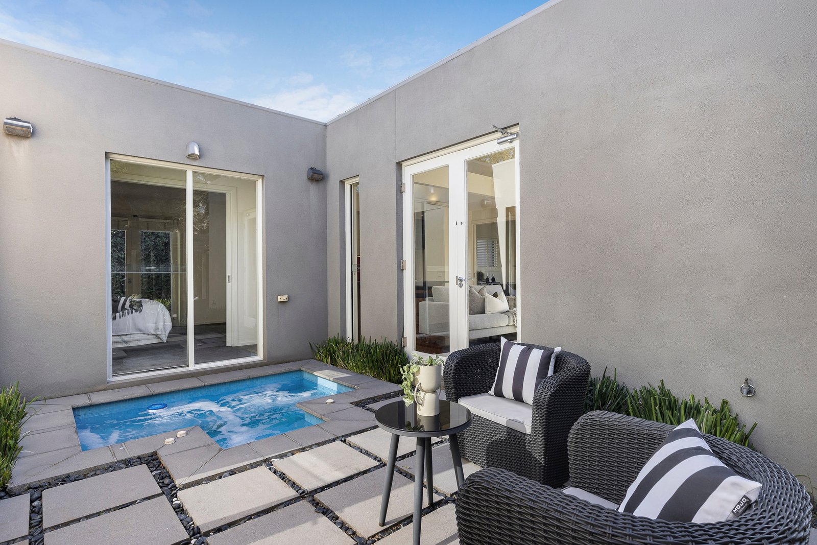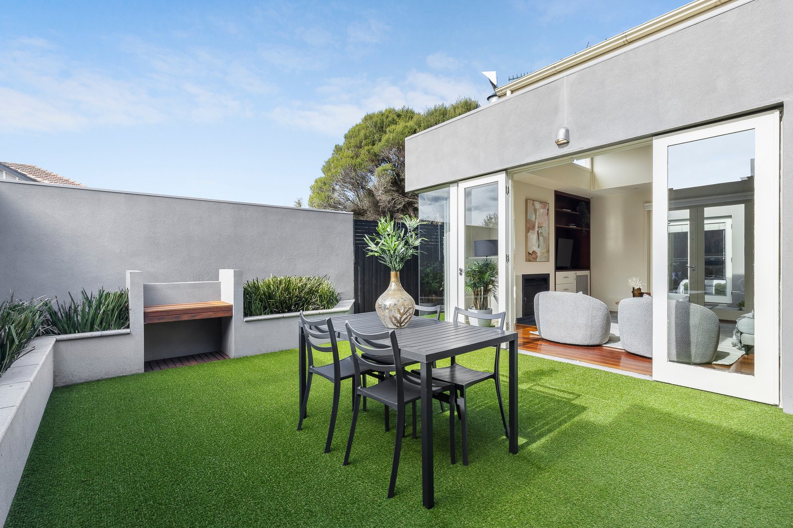 Privately tucked to the rear just footsteps from Brighton’s finest cafes, this McKimm-designed single-level residence achieves a rare harmony of architecture and lifestyle. Every room spills through French doors to one of three private courtyards, culminating in a mosaic-tiled spa. With The Little Ox, Gumtree Supermarket and Superrandom moments away, it’s a low-maintenance oasis of light, space and seamless indoor-outdoor living.