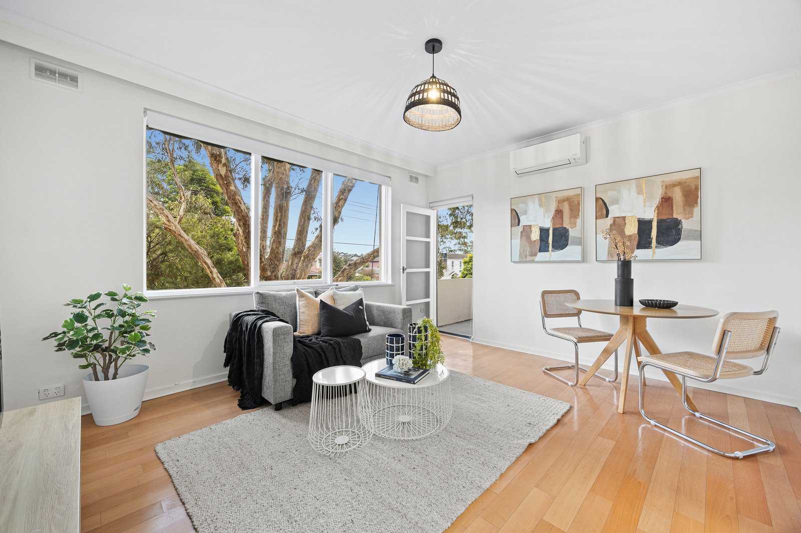 The refined living and dining area is a sun-kissed haven, with year-round comfort ensured by a split system air conditioner and expansive picture windows capturing peaceful treed views. A glass door leads out to a covered balcony - ideal for quiet moments or unwinding as the day fades.