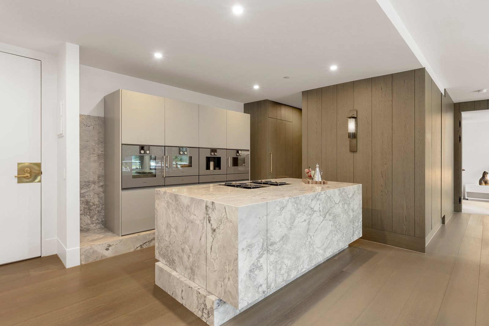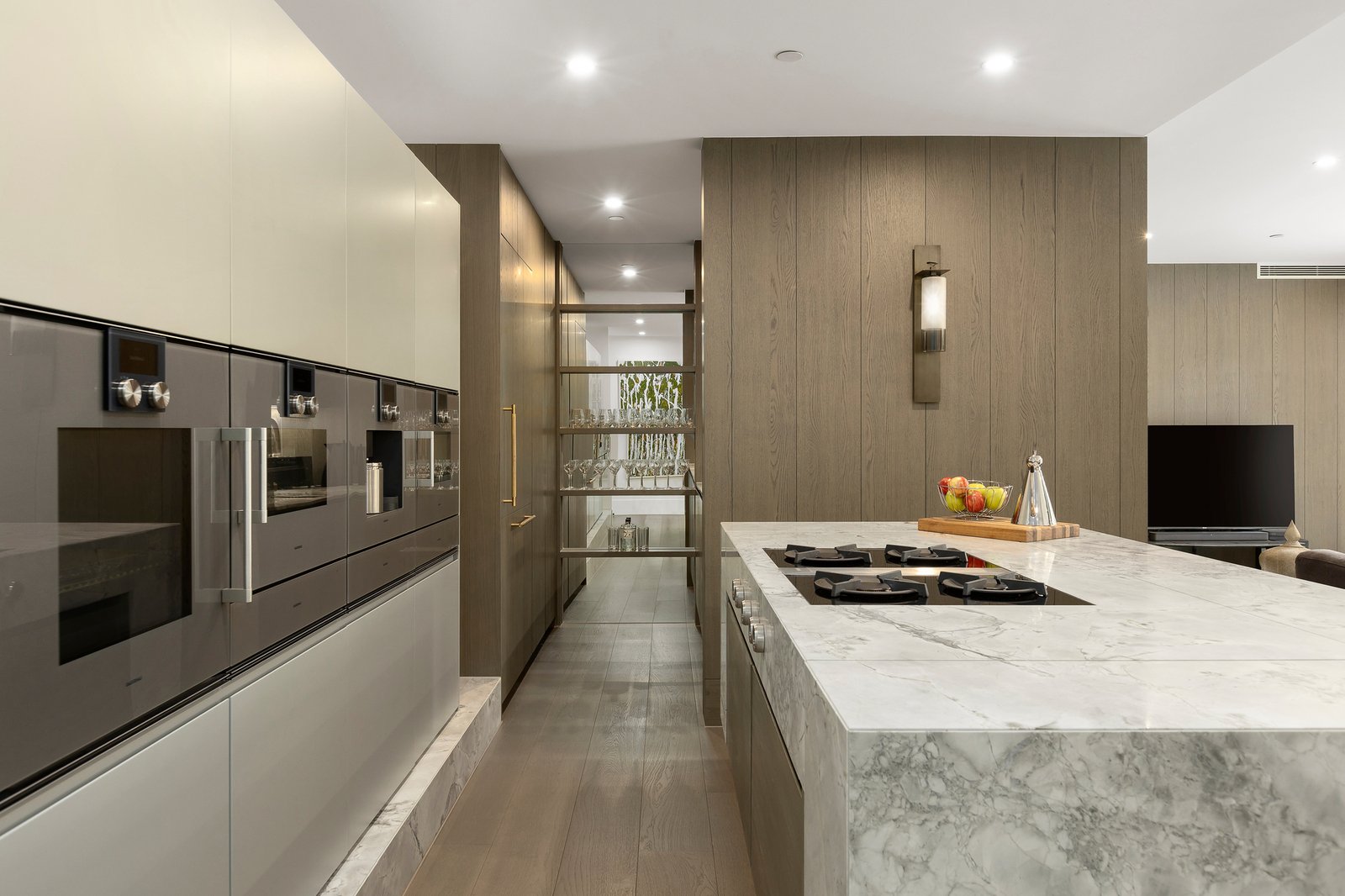 A masterpiece of bespoke design, it showcases a vast living and dining space anchored by a state-of-the-art kitchen. A striking slab of Italian Dolomite has been crafted into a stunning floating island, with the same exquisite marbled stone gracing benchtops and splashbacks before continuing into a butler’s pantry. Four Premium Gaggenau Appliances (Convection Oven, Combi-Microwave Oven, a never used Steam Oven and Espresso Machine), Four Warming Drawers, a Bora 4-Burner Glass Ceramic Cooktop incorporating a concealed Downdraft Extractor and fully integrated refrigeration, all unite for a streamlined aesthetic.