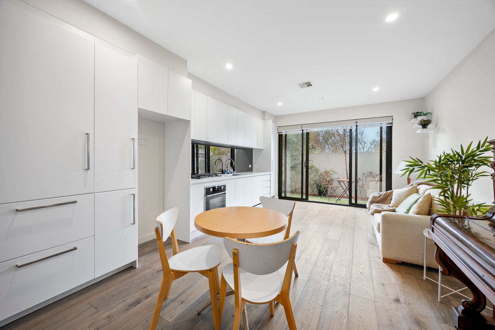 The sophisticated façade sets the tone for low-maintenance living at its finest, complemented by a fabulous courtyard garden perfect for year-round alfresco entertaining. Sun-filled open-plan living flows to a sleek La Germania-appointed kitchen with stone benchtops and a smoky mirrored splash back that reflects ambient light.