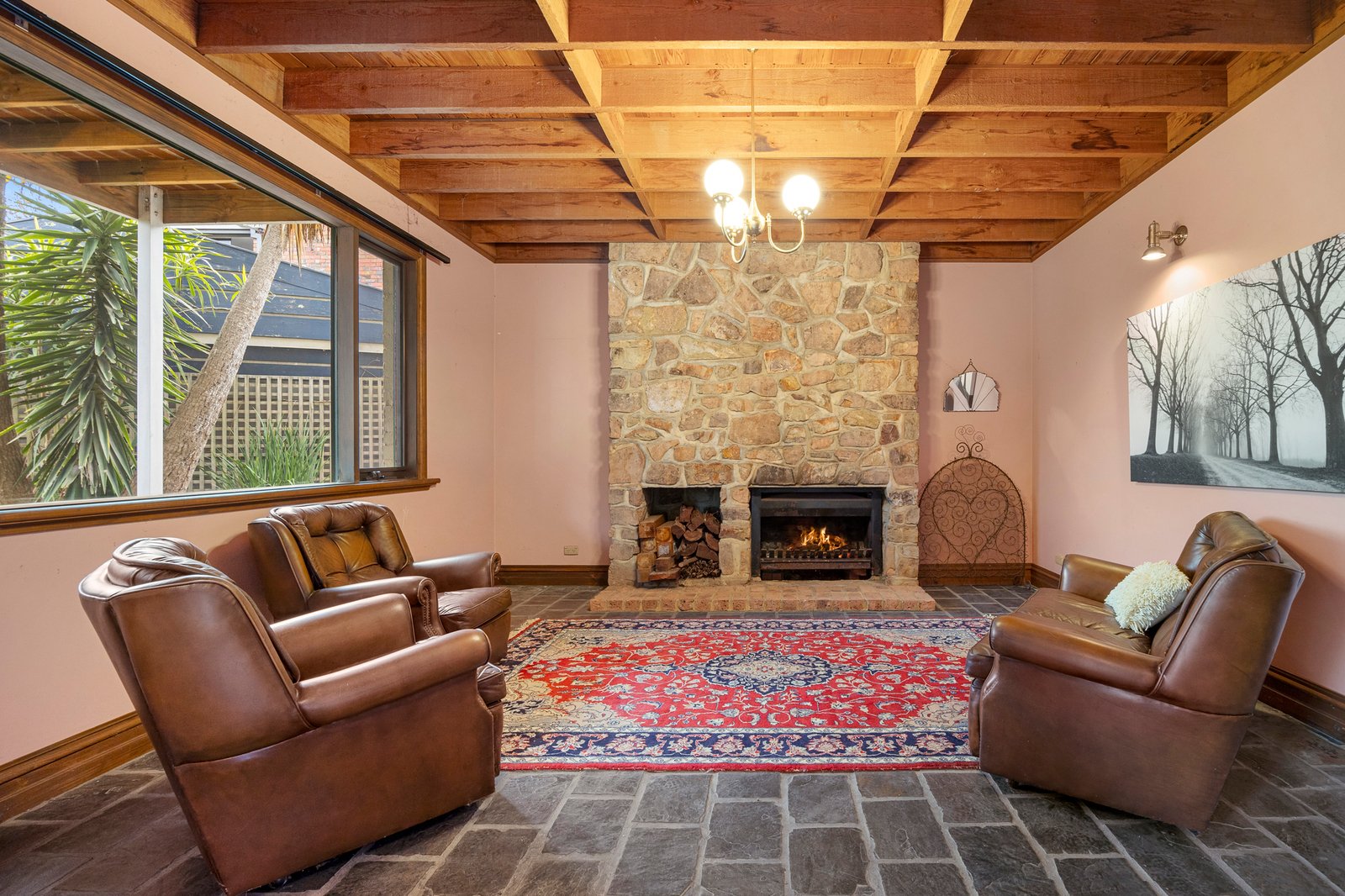 With timeless bagged brick construction, a series of three living areas accommodate both refined entertaining and relaxed family living including a sumptuous lower lounge with stone open fireplace and a generous upper level living and dining area with another stone fireplace and French doors to the bullnose verandah while a large blackwood kitchen offers space for the serious cook or entertainer.