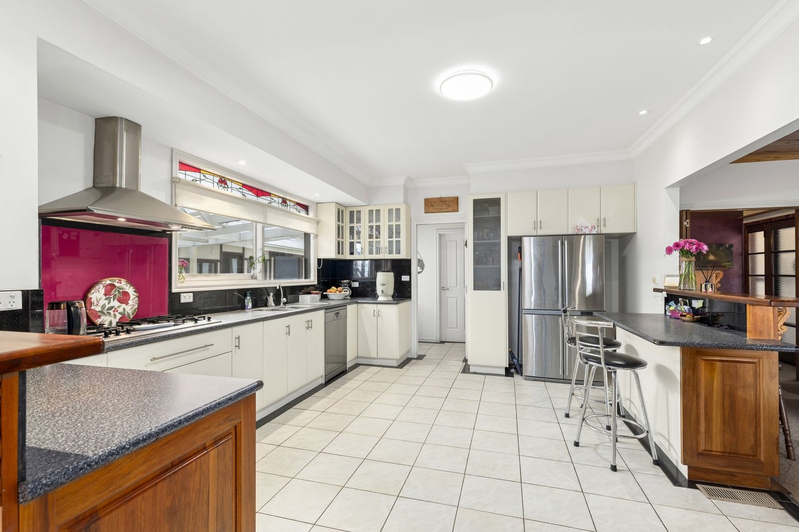 A tree-lined driveway leads to the two-storey Tudor style home, set amongst manicured gardens. On the ground floor, two inviting living areas feature timber-lined ceilings and fireplaces, creating a cosy ambience throughout. A formal dining room provides a sophisticated space to entertain, adjoining the central kitchen, well-equipped with quality appliances, ample bench space and generous storage.