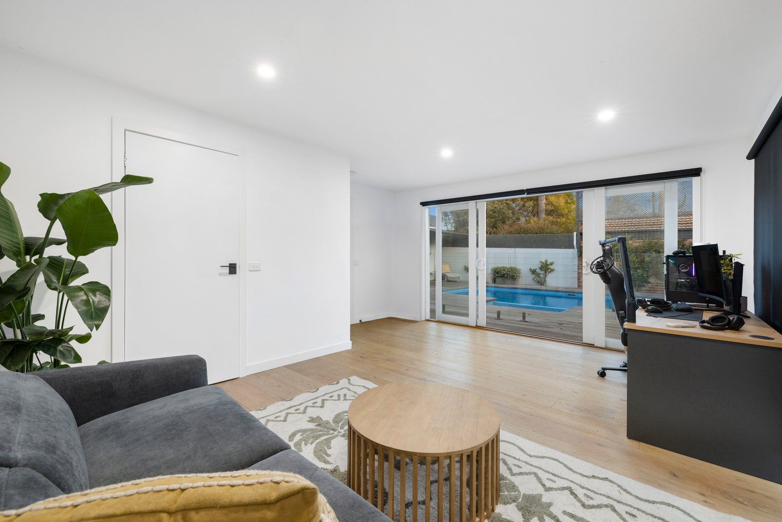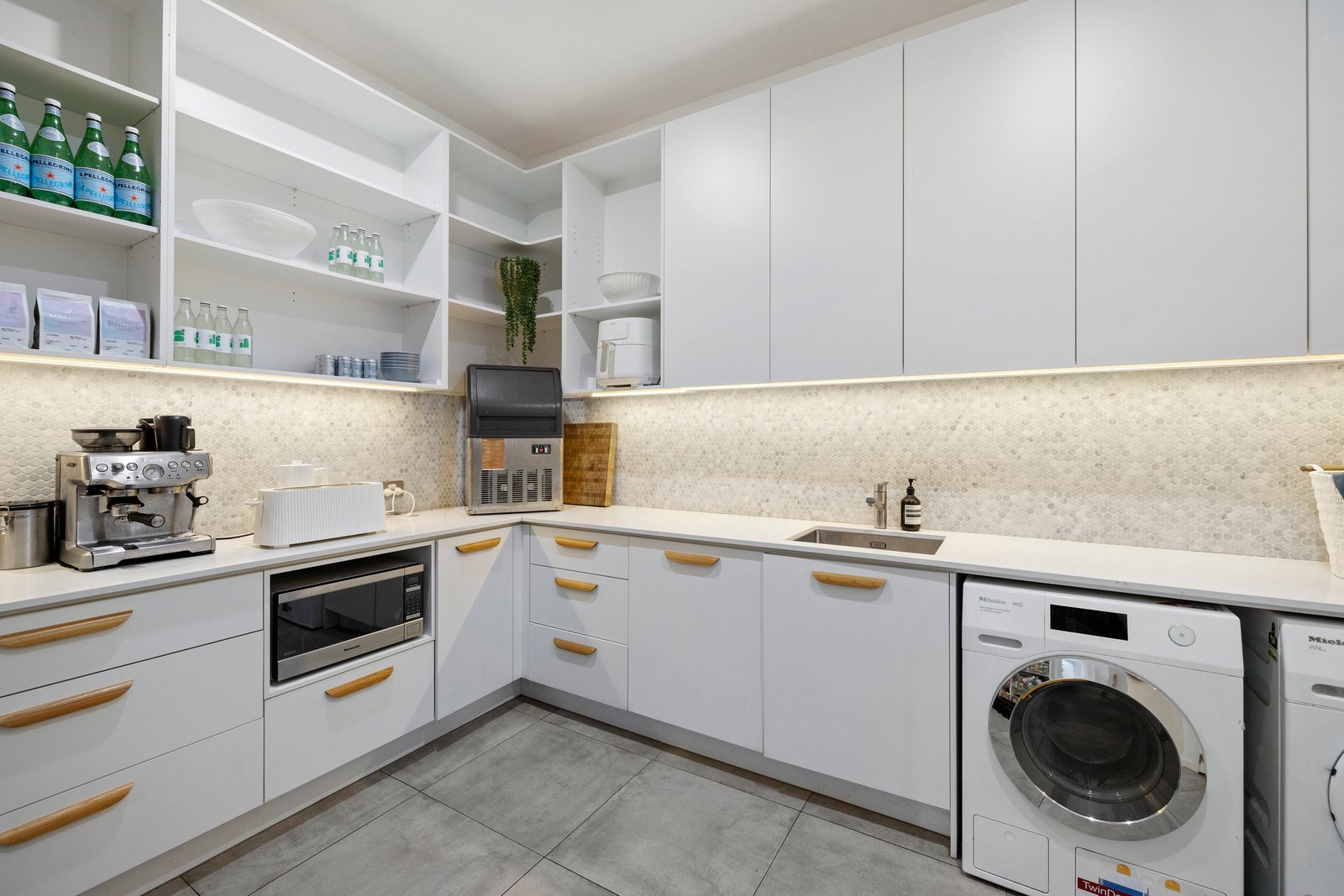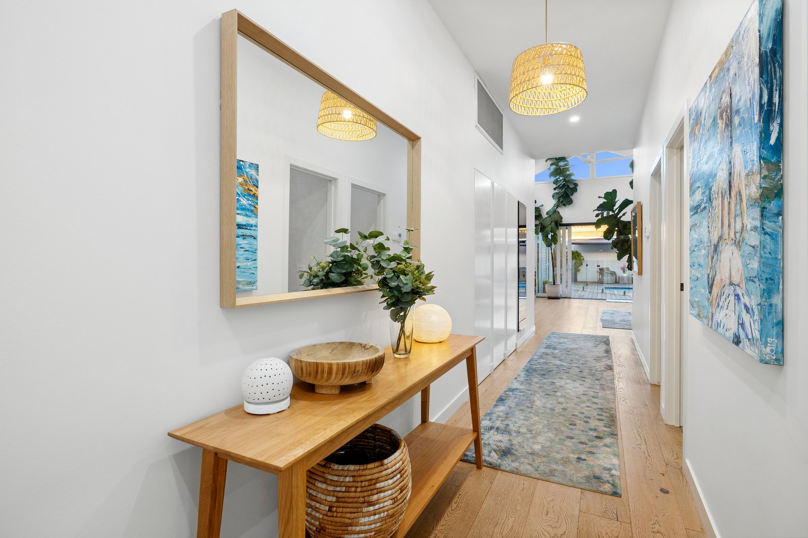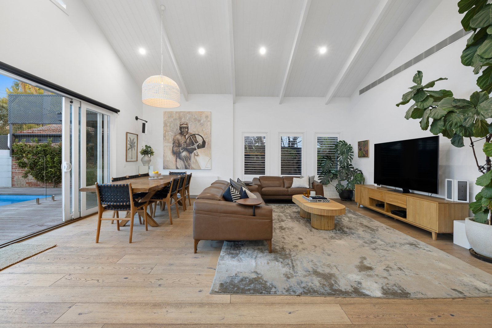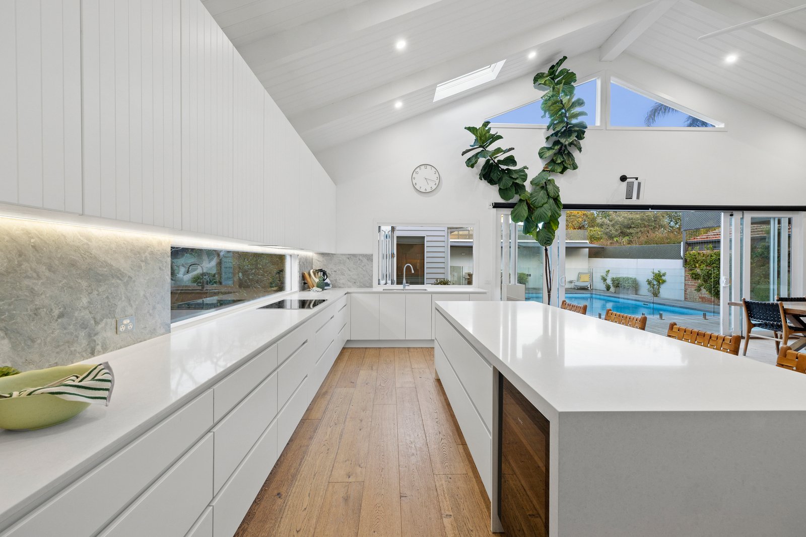Making an everlasting first impression, the home’s classic verandaed façade opens to high-calibre interiors designed to delight at every turn. Enhanced by chic wide-board oak floors and crisp plantation shutters, among its standout features is its open plan living/dining zone; a space crowned by a soaring cathedral ceiling, flooding the interiors with natural light and warmth. Seamlessly connected to the home’s surroundings and its sundrenched poolside oasis, this incredible domain is tailored for family relaxation as well as grand-scale entertaining. Taking pride of place here, and perfectly positioned for indoor and outdoor dining, is a stunning Miele-equipped kitchen with colossal kitchen waterfall-edge island, a marble splashback, integrated fridge/freezer, Vintec wine fridge , servery window - and a handy dedicated study nook.