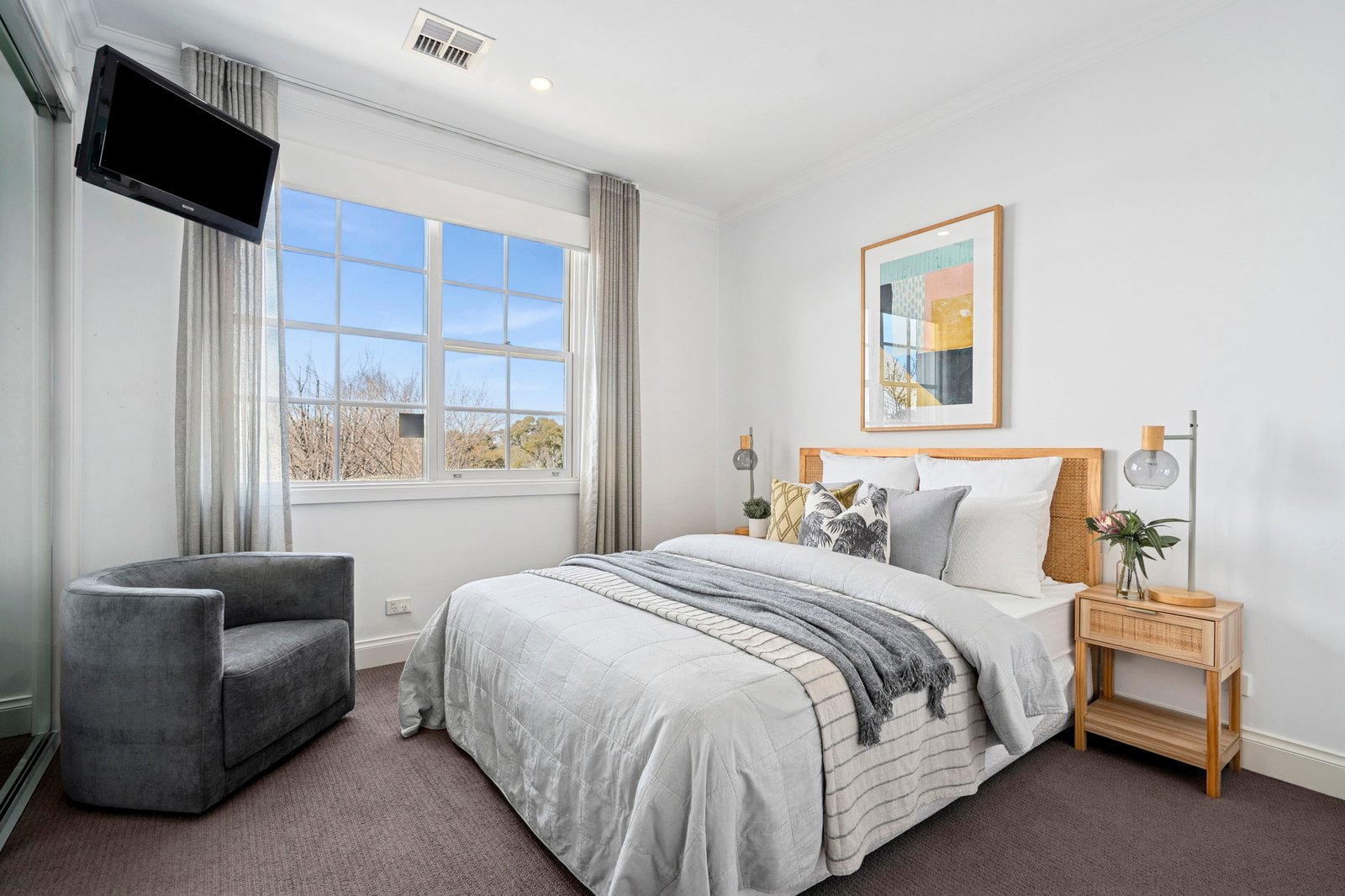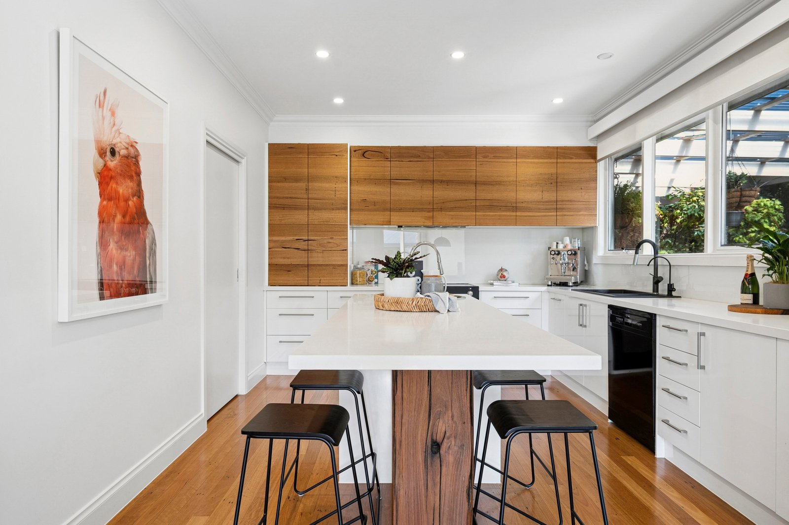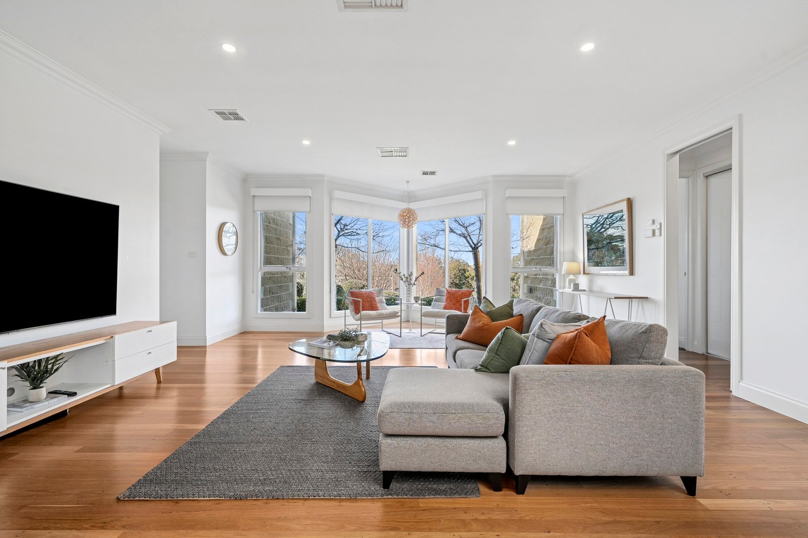 On arrival, the grand sandstone façade introduces the sophisticated theme of the home. Stepping inside, polished timber floors, high ceilings, and alluring angles offer an inviting atmosphere throughout. The open plan kitchen, dining and living area forms the heart of the home, with a woodfire heater and floor-to-ceiling stone surround creating a cosy atmosphere. The elegant kitchen features a central island with seating, stone benchtops, quality Smeg appliances, sleek modern cabinetry and a large walk-in pantry. Well-positioned to overlook the dining space and rear deck, the design caters for effortless entertaining, indoors and out. A spacious second living area features striking angular bay windows, with picturesque garden outlooks, providing a stunning space to relax, play or entertain.
