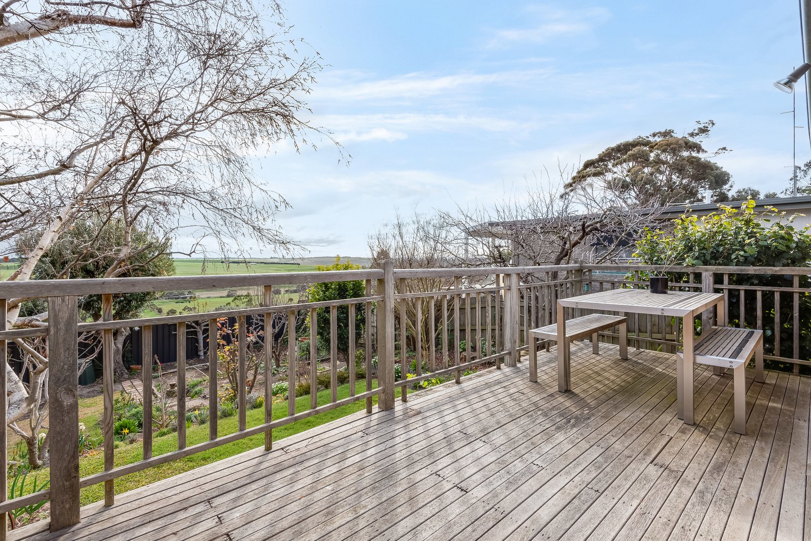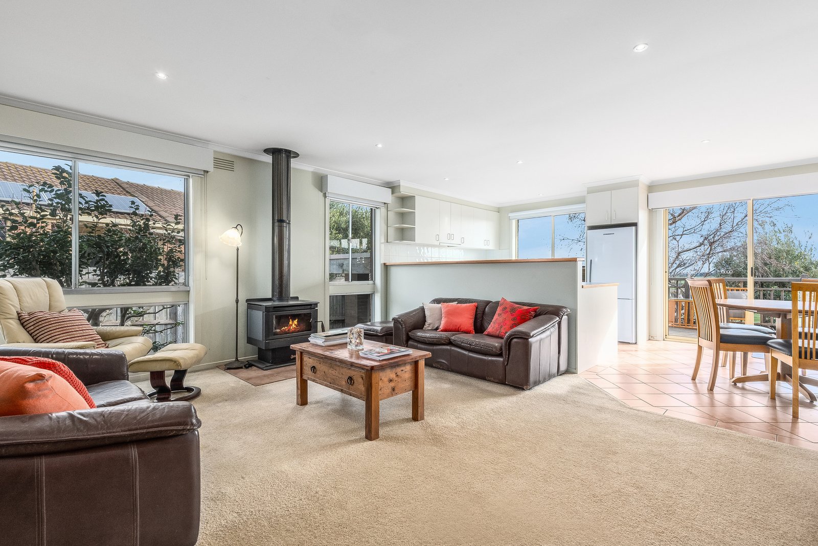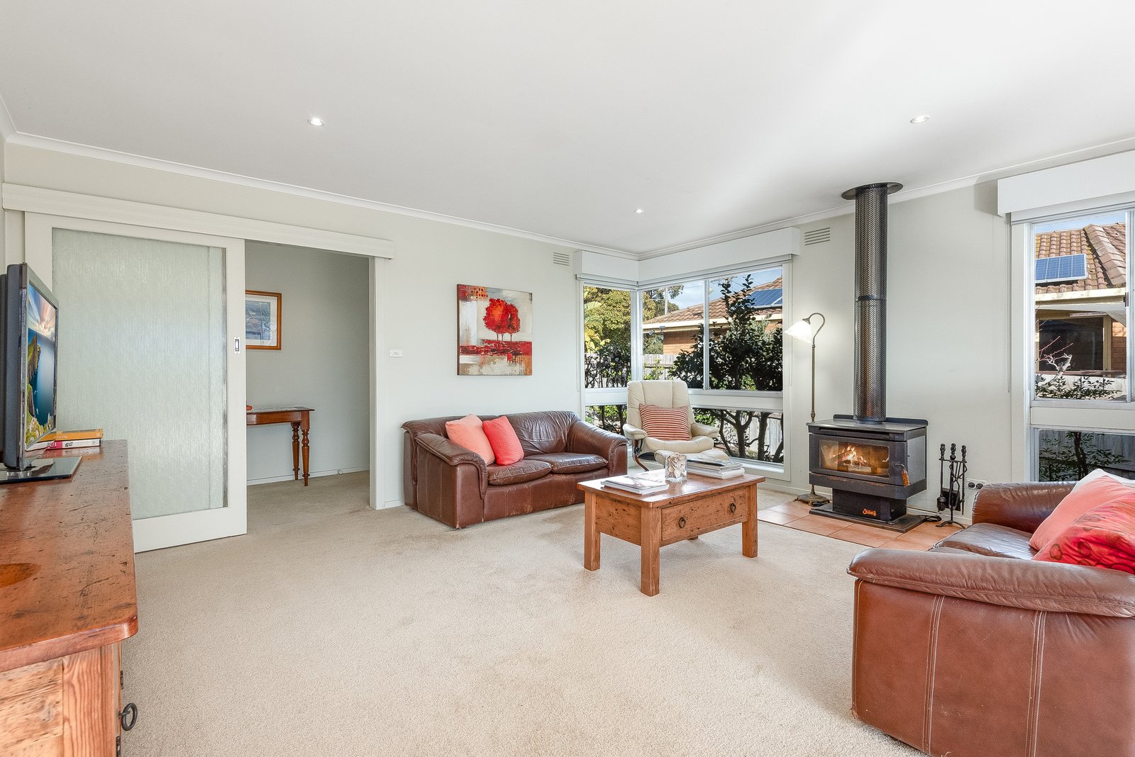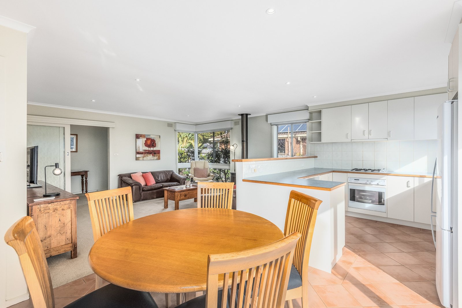 The classic brick veneer home is nestled in a leafy garden setting. From the entry, an inviting open plan kitchen, dining and living area features a woodfire heater for a cosy atmosphere, along with split system heating and cooling for year-round comfort. The well-appointed kitchen is equipped with 600mm oven, gas cooktop, and dishwasher. Perfectly positioned to overlook the dining space, rear deck, and take in the picturesque views, the layout is ideal for everyday living and effortless entertaining.