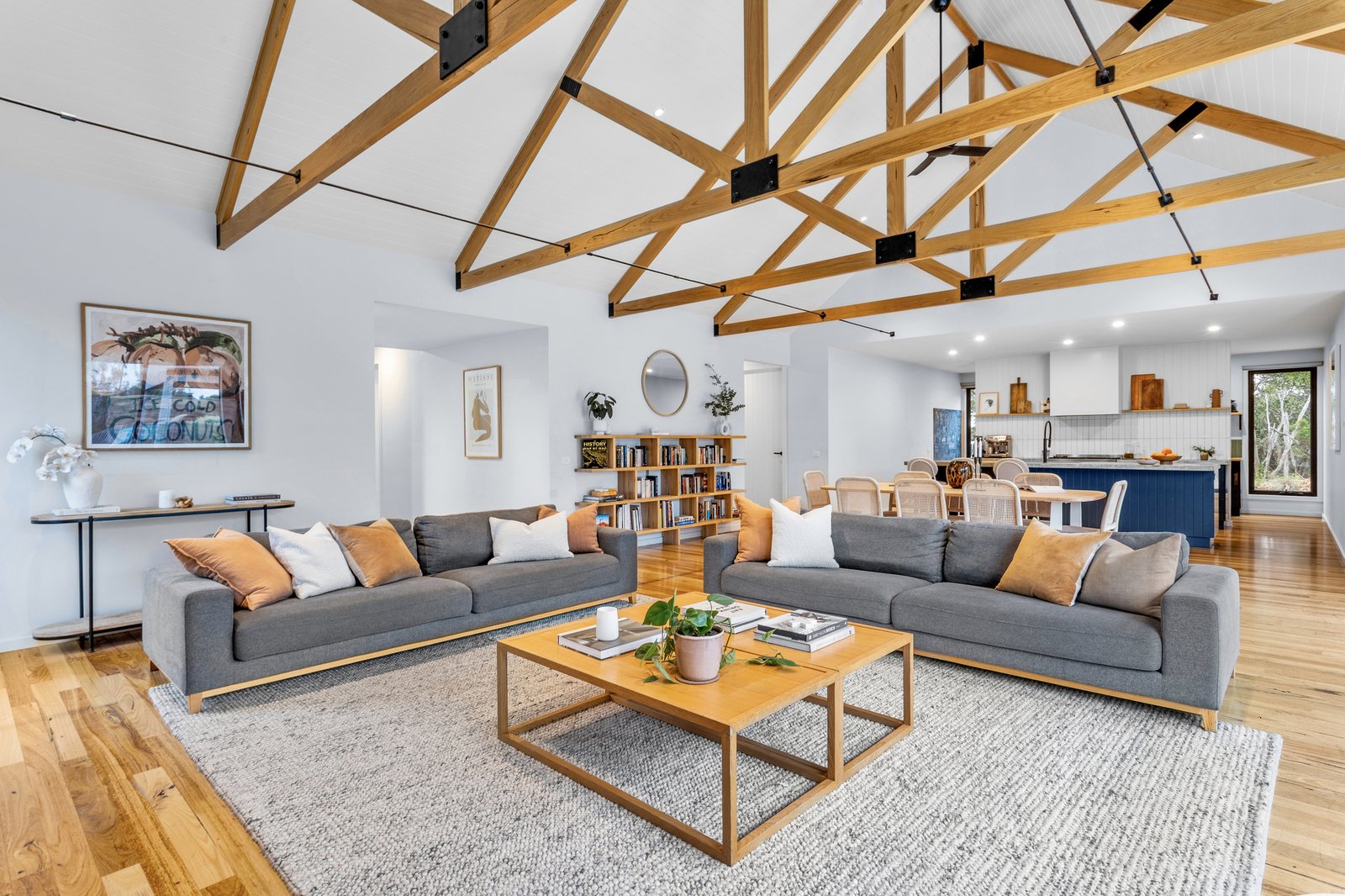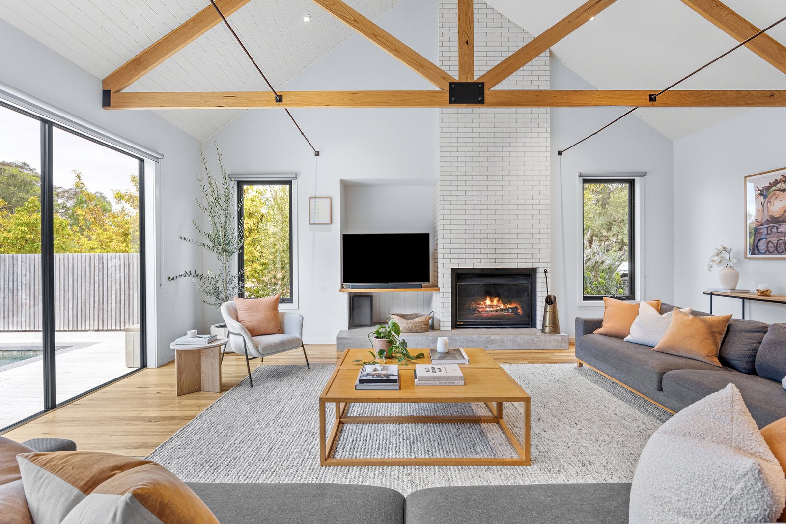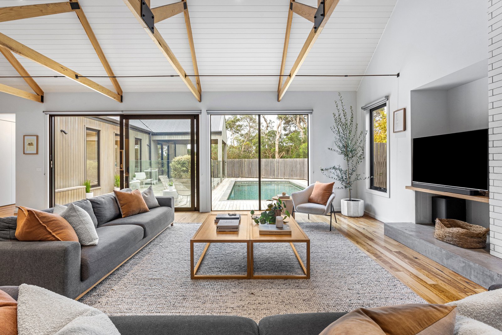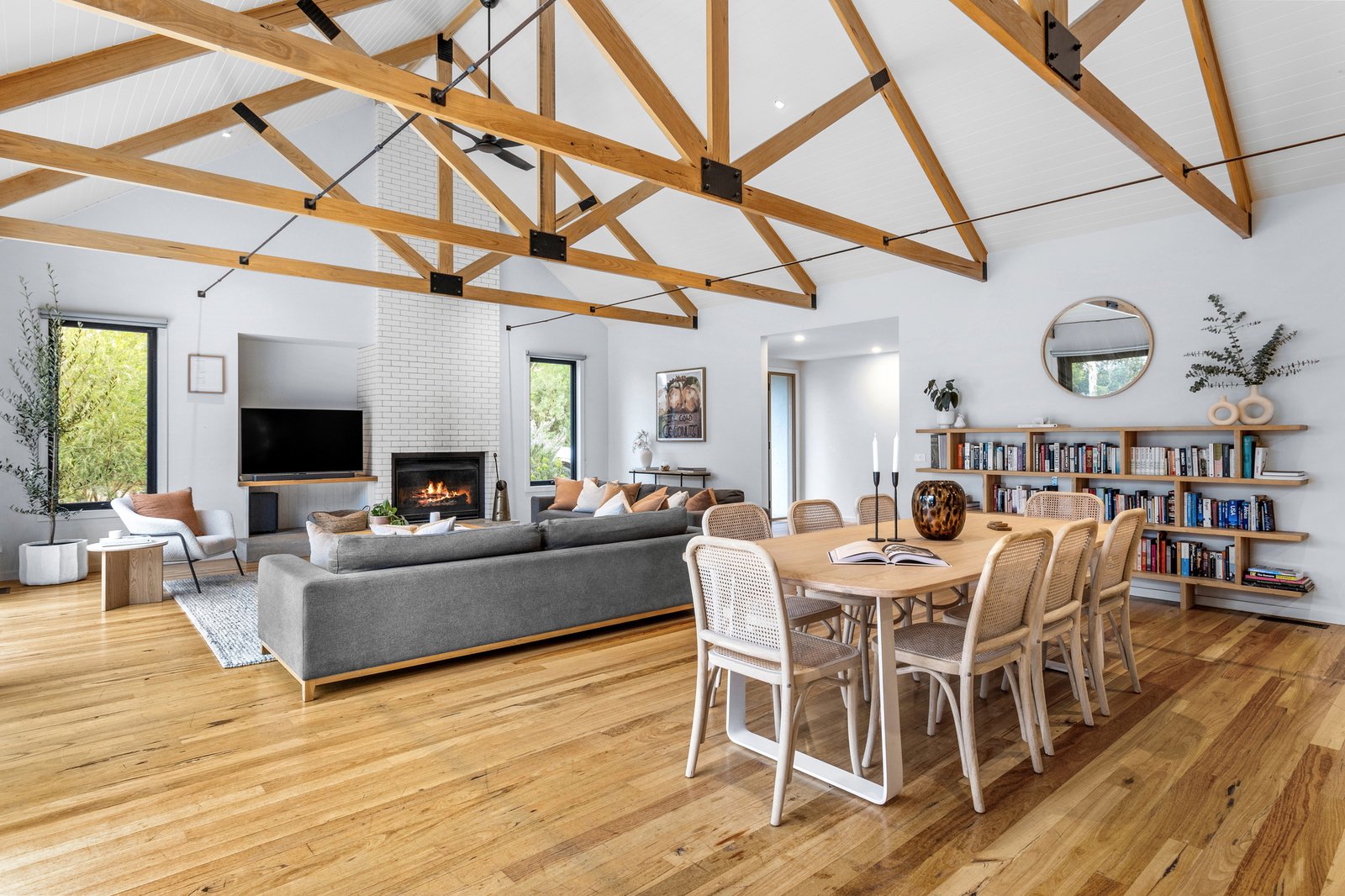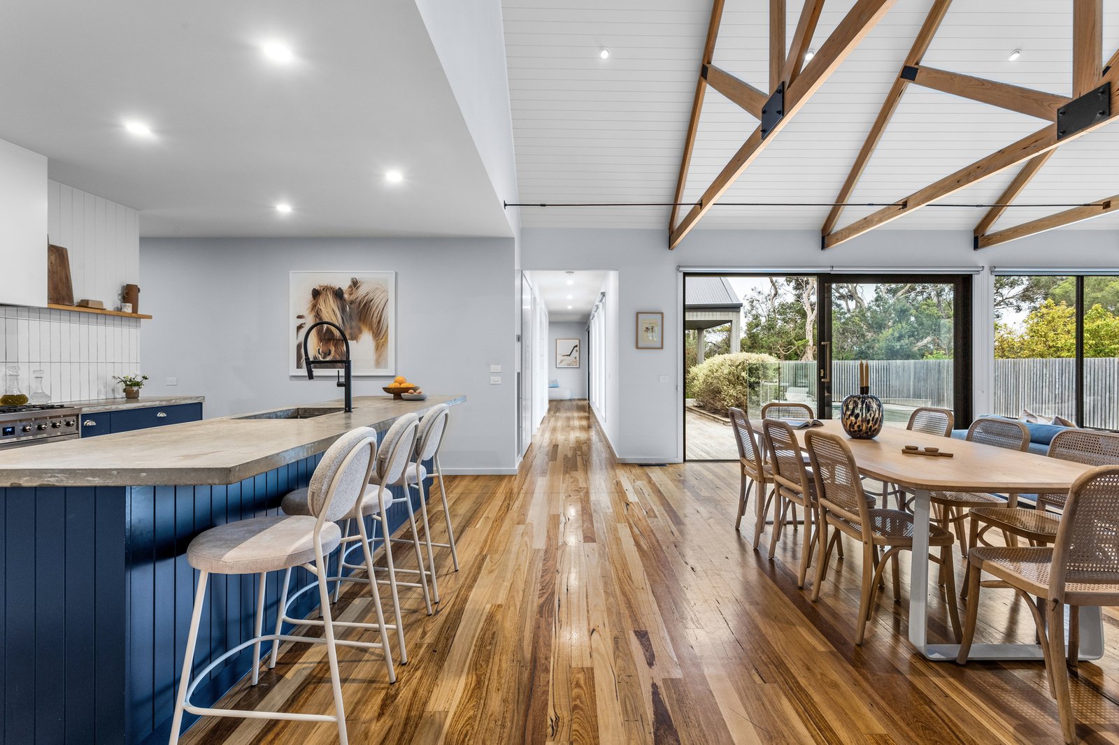 Soaring raked ceilings with exposed beams add an undeniable wow factor to the main living and dining area, where an open fire is built into white brick and rests on a concrete hearth with room for firewood. The outlook opens up to the vast Silvertop timber deck and fully tiled solar-heated pool, backdropped by bushland shared by the Alba Hot Springs, a symbol of the serenity on offer, whilst a poured concrete island bench makes a centrepiece of the kitchen, paired with Smeg appliances, brushed brass tapware and an integrated butler’s pantry with skylit shelving. The main suite is a peaceful reprieve with a freestanding bath, picture window to the Moonah, and sensor-lit, oversized walk-in robe. A separate wing with four additional bedrooms, a second bathroom, and a second living area offers ideal zoning for multi-generational living or visiting guests, while a sixth bedroom is conveniently located beside a third, luxurious bathroom, perfect for overnight guests.