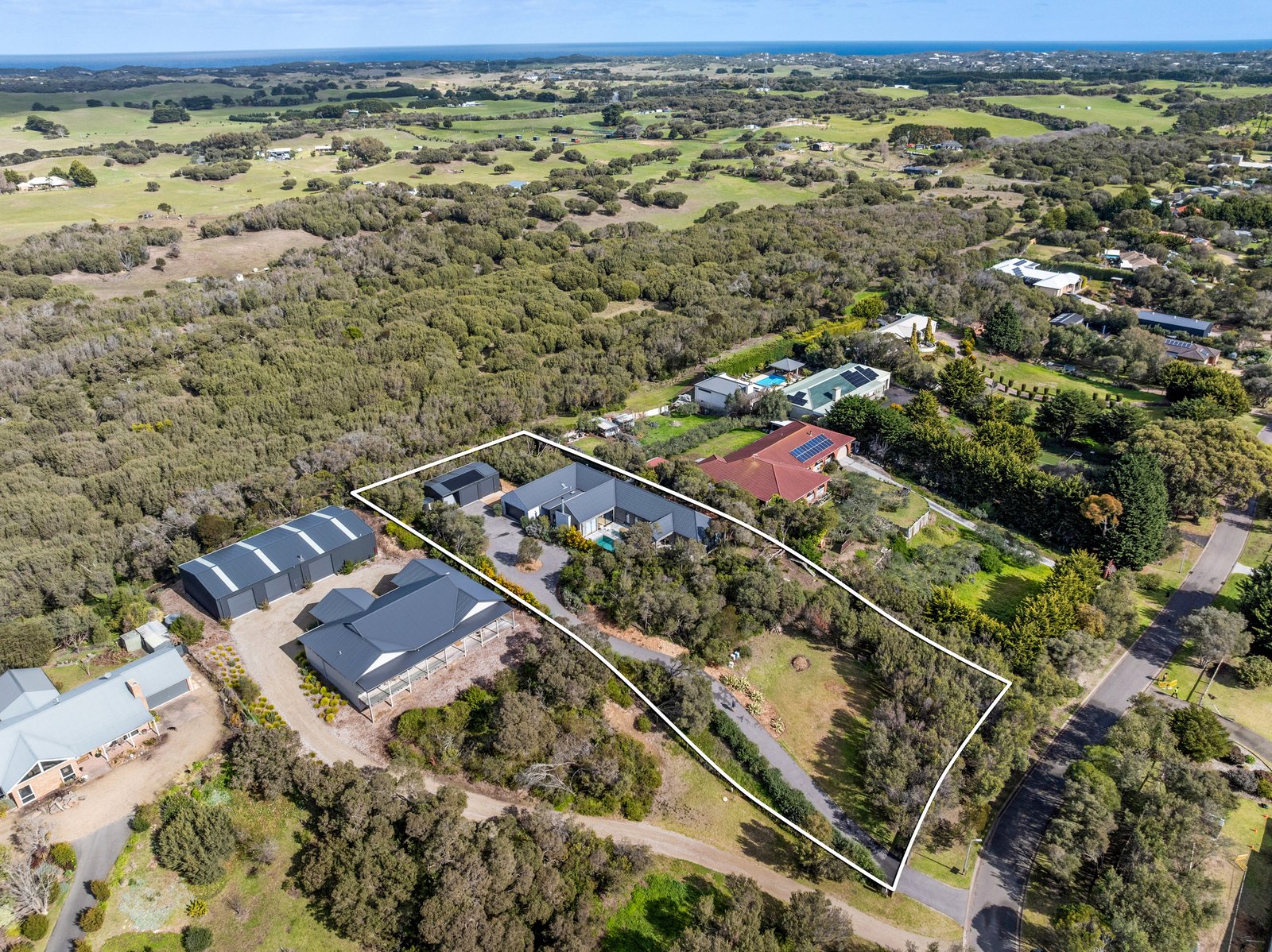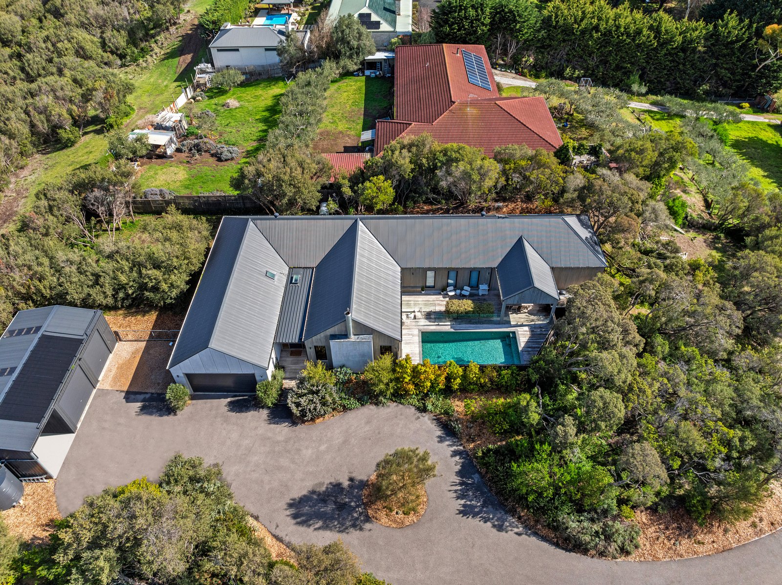 Ascending a winding driveway and passing through a canopy of established native trees and indigenous Moonah, this contemporary home built by award-winning Mornington Peninsula builder ‘Beachhouse Construction’, slowly rises, offering utmost privacy and an air of exclusivity alongside spectacular resort-style amenities. Set across 1 acre/4,088 sqm (approx) with leafy treetop vistas and absolute seclusion, it’s a breathtaking, private compound where design and lifestyle are equally matched. Six bedrooms, three bathrooms, and two generous living areas span a single, free-flowing level, with natural materials and custom finishes softening the striking architectural form.