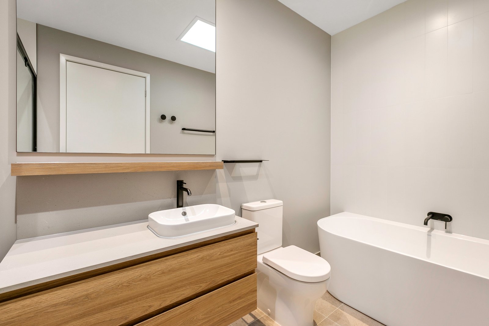 Upstairs, the home truly comes to life with two spacious and light-filled bedrooms, each featuring mirrored built-in wardrobes for excellent storage and enhanced natural light. The master bedroom is enhanced by a luxurious private ensuite with elegant timber vanities for added convenience, while the second bedroom creates the perfect work-from-home solution or peaceful guest retreat. The main bathroom services the family's daily needs with contemporary appointments including timber vanities, a sleek freestanding bath and quality finishes.